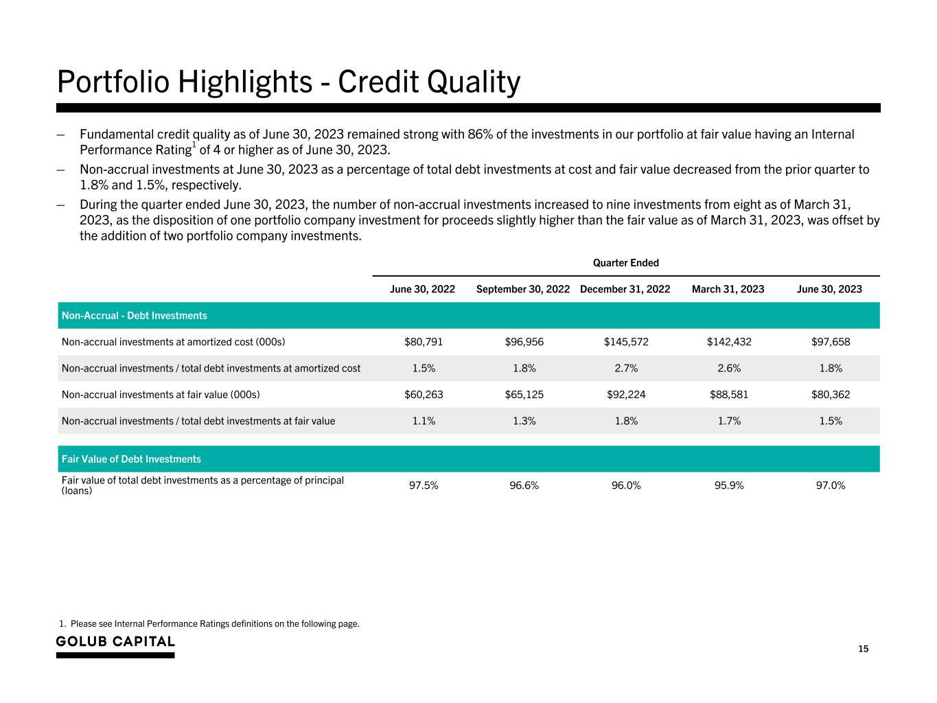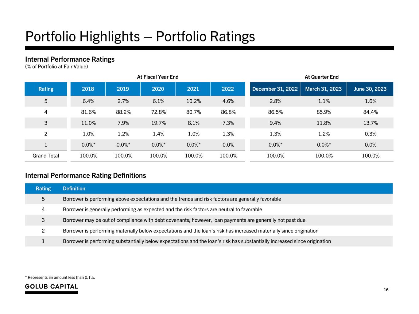 15 Portfolio Highlights - Credit Quality Quarter Ended June 30, 2022 September 30, 2022 December 31, 2022 March 31, 2023 June 30, 2023 Non-Accrual - Debt Investments Non-accrual investments at amortized cost (000s) $80,791 $96,956 $145,572 $142,432 $97,658 Non-accrual investments / total debt investments at amortized cost 1.5% 1.8% 2.7% 2.6% 1.8% Non-accrual investments at fair value (000s) $60,263 $65,125 $92,224 $88,581 $80,362 Non-accrual investments / total debt investments at fair value 1.1% 1.3% 1.8% 1.7% 1.5% Fair Value of Debt Investments Fair value of total debt investments as a percentage of principal (loans) 97.5% 96.6% 96.0% 95.9% 97.0% 1. Please see Internal Performance Ratings definitions on the following page. – Fundamental credit quality as of June 30, 2023 remained strong with 86% of the investments in our portfolio at fair value having an Internal Performance Rating1 of 4 or higher as of June 30, 2023. – Non-accrual investments at June 30, 2023 as a percentage of total debt investments at cost and fair value decreased from the prior quarter to 1.8% and 1.5%, respectively. – During the quarter ended June 30, 2023, the number of non-accrual investments increased to nine investments from eight as of March 31, 2023, as the disposition of one portfolio company investment for proceeds slightly higher than the fair value as of March 31, 2023, was offset by the addition of two portfolio company investments.