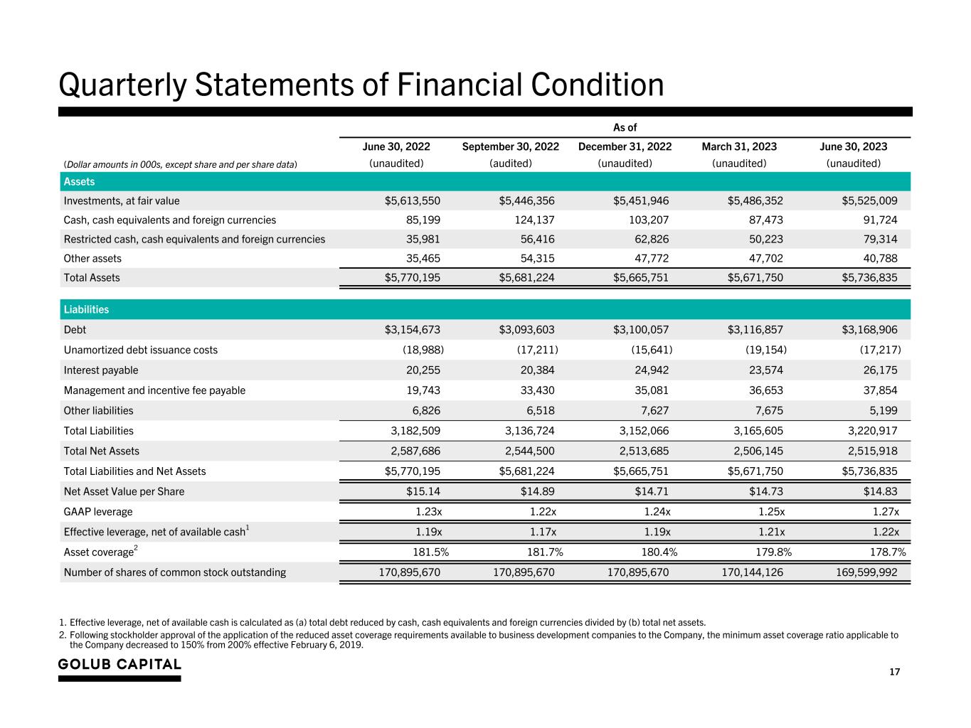 17 Quarterly Statements of Financial Condition As of (Dollar amounts in 000s, except share and per share data) June 30, 2022 September 30, 2022 December 31, 2022 March 31, 2023 June 30, 2023 (unaudited) (audited) (unaudited) (unaudited) (unaudited) Assets Investments, at fair value $5,613,550 $5,446,356 $5,451,946 $5,486,352 $5,525,009 Cash, cash equivalents and foreign currencies 85,199 124,137 103,207 87,473 91,724 Restricted cash, cash equivalents and foreign currencies 35,981 56,416 62,826 50,223 79,314 Other assets 35,465 54,315 47,772 47,702 40,788 Total Assets $5,770,195 $5,681,224 $5,665,751 $5,671,750 $5,736,835 Liabilities Debt $3,154,673 $3,093,603 $3,100,057 $3,116,857 $3,168,906 Unamortized debt issuance costs (18,988) (17,211) (15,641) (19,154) (17,217) Interest payable 20,255 20,384 24,942 23,574 26,175 Management and incentive fee payable 19,743 33,430 35,081 36,653 37,854 Other liabilities 6,826 6,518 7,627 7,675 5,199 Total Liabilities 3,182,509 3,136,724 3,152,066 3,165,605 3,220,917 Total Net Assets 2,587,686 2,544,500 2,513,685 2,506,145 2,515,918 Total Liabilities and Net Assets $5,770,195 $5,681,224 $5,665,751 $5,671,750 $5,736,835 Net Asset Value per Share $15.14 $14.89 $14.71 $14.73 $14.83 GAAP leverage 1.23x 1.22x 1.24x 1.25x 1.27x Effective leverage, net of available cash1 1.19 x 1.17 x 1.19 x 1.21 x 1.22 x Asset coverage2 181.5% 181.7% 180.4% 179.8% 178.7% Number of shares of common stock outstanding 170,895,670 170,895,670 170,895,670 170,144,126 169,599,992 1. Effective leverage, net of available cash is calculated as (a) total debt reduced by cash, cash equivalents and foreign currencies divided by (b) total net assets. 2. Following stockholder approval of the application of the reduced asset coverage requirements available to business development companies to the Company, the minimum asset coverage ratio applicable to the Company decreased to 150% from 200% effective February 6, 2019.