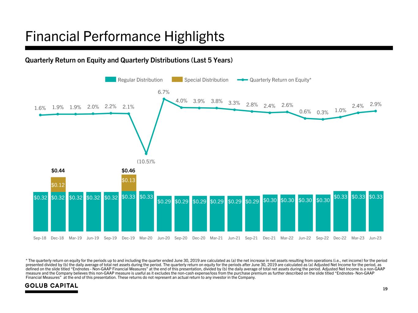 18 Quarterly Operating Results Quarter Ended (Dollar amounts in 000s, except share and per share data) June 30, 2022 September 30, 2022 December 31, 2022 March 31, 2023 June 30, 2023 (unaudited) (unaudited) (unaudited) (unaudited) (unaudited) Investment Income Interest income $97,568 $119,925 $134,350 $143,661 $151,937 GCIC acquisition purchase premium amortization (3,036) (2,561) (2,135) (1,652) (1,570) Dividend and fee income 1,094 2,284 4,662 4,944 4,353 Total Investment Income $95,626 $119,648 $136,877 $146,953 $154,720 Expenses Interest and other debt financing expenses $23,278 $28,989 $34,245 $36,256 $39,487 Base management fee 19,025 19,321 19,062 18,688 18,997 Incentive fee – net investment income 718 14,109 16,011 17,976 18,857 Incentive fee – capital gains (4,814) — — — — Other operating expenses 3,491 3,196 3,696 3,595 3,601 Total Expenses 41,698 65,615 73,014 76,515 80,942 Income and excise taxes — 72 2,200 232 — Net Investment Income after Tax $53,928 $53,961 $61,663 $70,206 $73,778 Net Gain (Loss) on Investments and Foreign Currency Net realized gain (loss) on investments and foreign currency transactions $2,511 $2,945 $3,294 ($4,762) ($41,923) Net unrealized appreciation (depreciation) on investments and foreign currency translation (43,618) (51,308) (41,853) (8,741) 39,384 Net unrealized appreciation (depreciation) from the GCIC acquisition purchase premium write-down 3,063 2,572 2,231 1,755 1,666 Net gain (loss) on investments and foreign currency (38,044) (45,791) (36,328) (11,748) (873) Provision for taxes on realized gain and unrealized appreciation on investments (478) (87) 246 45 78 Net Increase (Decrease) in Net Assets Resulting from Operations $15,406 $8,083 $25,581 $58,503 $72,983 Per Share Data Net Investment Income Per Share $0.32 $0.32 $0.36 $0.41 $0.43 Adjusted Net Investment Income before accrual (reversal) for capital gain incentive fee per share1 $0.31 $0.33 $0.37 $0.42 $0.44 Earnings (Loss) Per Share $0.09 $0.05 $0.15 $0.34 $0.43 Adjusted Earnings (Loss) Per Share1 $0.09 $0.05 $0.15 $0.34 $0.43 Distributions Paid $0.30 $0.30 $0.33 $0.33 $0.33 Weighted average shares of common stock outstanding 170,895,670 170,895,670 170,895,670 170,835,435 169,980,131 1. As a supplement to GAAP financial measures, the Company is providing additional non-GAAP measures. See the slide titled “Endnotes - Non-GAAP Financial Measures” at the end of this presentation for further description on the non-GAAP financial measures.