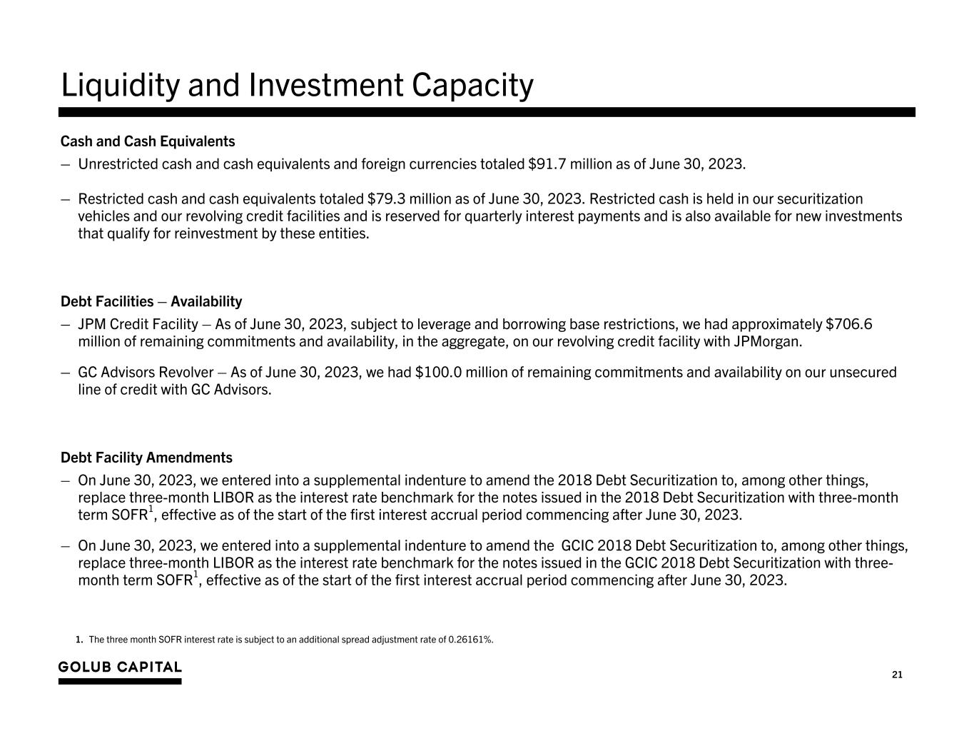 21 Liquidity and Investment Capacity Cash and Cash Equivalents – Unrestricted cash and cash equivalents and foreign currencies totaled $91.7 million as of June 30, 2023. – Restricted cash and cash equivalents totaled $79.3 million as of June 30, 2023. Restricted cash is held in our securitization vehicles and our revolving credit facilities and is reserved for quarterly interest payments and is also available for new investments that qualify for reinvestment by these entities. Debt Facilities – Availability – JPM Credit Facility – As of June 30, 2023, subject to leverage and borrowing base restrictions, we had approximately $706.6 million of remaining commitments and availability, in the aggregate, on our revolving credit facility with JPMorgan. – GC Advisors Revolver – As of June 30, 2023, we had $100.0 million of remaining commitments and availability on our unsecured line of credit with GC Advisors. Debt Facility Amendments – On June 30, 2023, we entered into a supplemental indenture to amend the 2018 Debt Securitization to, among other things, replace three-month LIBOR as the interest rate benchmark for the notes issued in the 2018 Debt Securitization with three-month term SOFR1, effective as of the start of the first interest accrual period commencing after June 30, 2023. – On June 30, 2023, we entered into a supplemental indenture to amend the GCIC 2018 Debt Securitization to, among other things, replace three-month LIBOR as the interest rate benchmark for the notes issued in the GCIC 2018 Debt Securitization with three- month term SOFR1, effective as of the start of the first interest accrual period commencing after June 30, 2023. 1. The three month SOFR interest rate is subject to an additional spread adjustment rate of 0.26161%.
