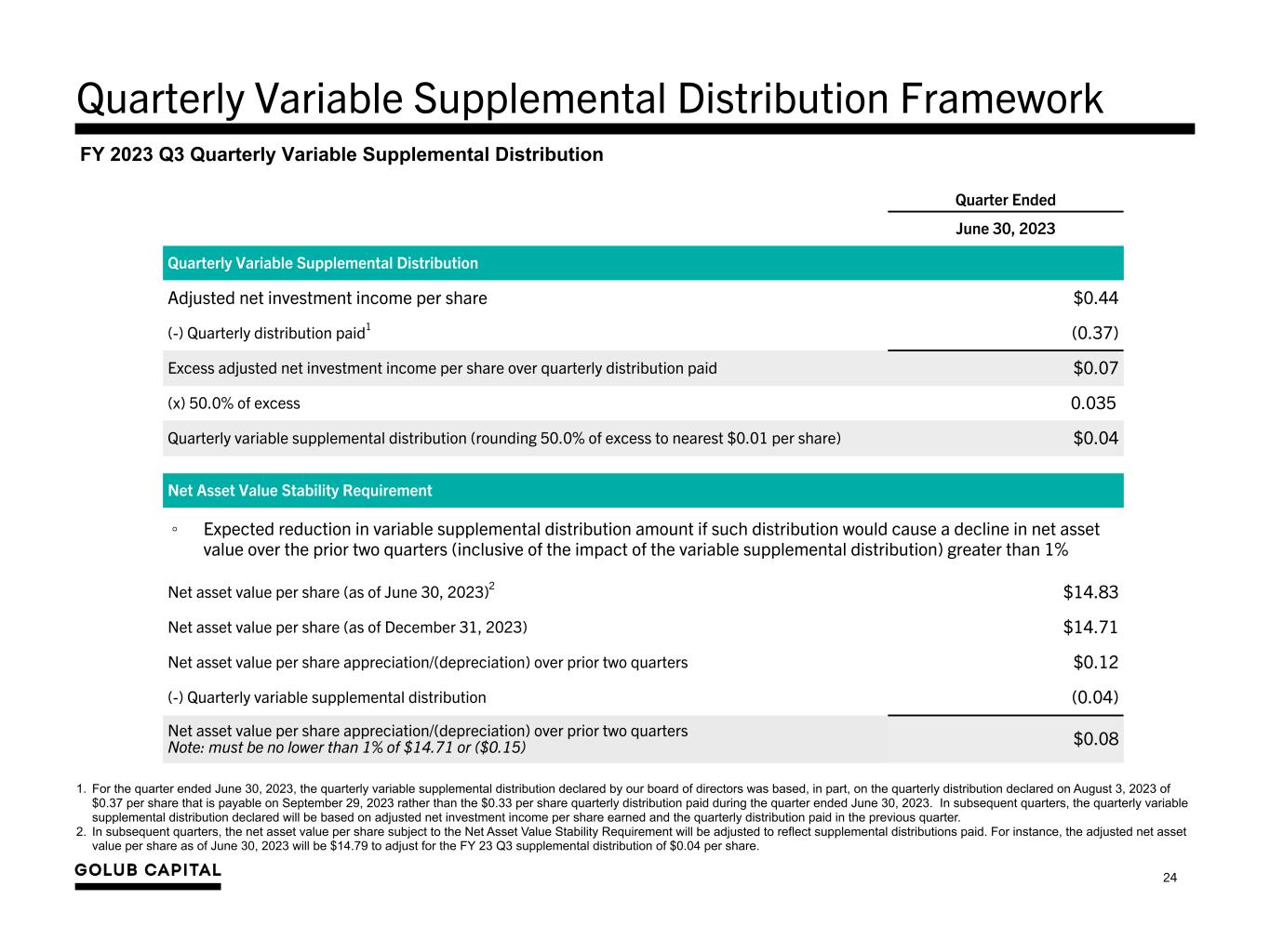 1. For the quarter ended June 30, 2023, the quarterly variable supplemental distribution declared by our board of directors was based, in part, on the quarterly distribution declared on August 3, 2023 of $0.37 per share that is payable on September 29, 2023 rather than the $0.33 per share quarterly distribution paid during the quarter ended June 30, 2023. In subsequent quarters, the quarterly variable supplemental distribution declared will be based on adjusted net investment income per share earned and the quarterly distribution paid in the previous quarter. 2. In subsequent quarters, the net asset value per share subject to the Net Asset Value Stability Requirement will be adjusted to reflect supplemental distributions paid. For instance, the adjusted net asset value per share as of June 30, 2023 will be $14.79 to adjust for the FY 23 Q3 supplemental distribution of $0.04 per share. Quarterly Variable Supplemental Distribution Framework FY 2023 Q3 Quarterly Variable Supplemental Distribution Quarter Ended June 30, 2023 Quarterly Variable Supplemental Distribution Adjusted net investment income per share $0.44 (-) Quarterly distribution paid1 (0.37) Excess adjusted net investment income per share over quarterly distribution paid $0.07 (x) 50.0% of excess 0.035 Quarterly variable supplemental distribution (rounding 50.0% of excess to nearest $0.01 per share) $0.04 Net Asset Value Stability Requirement Net asset value per share (as of June 30, 2023)2 $14.83 Net asset value per share (as of December 31, 2023) $14.71 Net asset value per share appreciation/(depreciation) over prior two quarters $0.12 (-) Quarterly variable supplemental distribution (0.04) Net asset value per share appreciation/(depreciation) over prior two quarters Note: must be no lower than 1% of $14.71 or ($0.15) $0.08 ◦ Expected reduction in variable supplemental distribution amount if such distribution would cause a decline in net asset value over the prior two quarters (inclusive of the impact of the variable supplemental distribution) greater than 1% 24