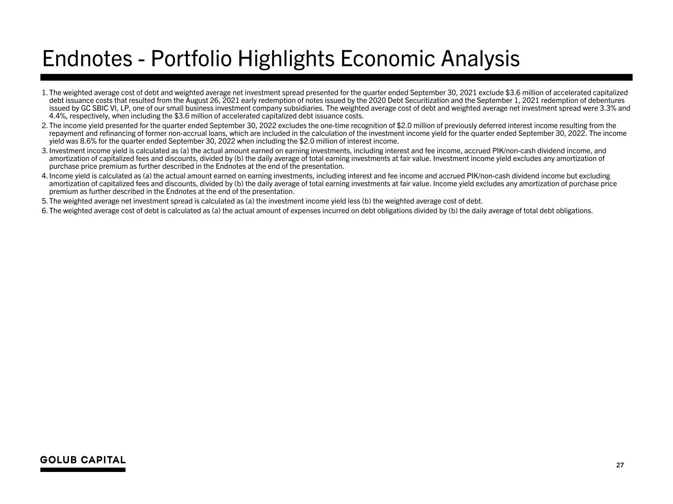 27 Endnotes - Portfolio Highlights Economic Analysis 1. The weighted average cost of debt and weighted average net investment spread presented for the quarter ended September 30, 2021 exclude $3.6 million of accelerated capitalized debt issuance costs that resulted from the August 26, 2021 early redemption of notes issued by the 2020 Debt Securitization and the September 1, 2021 redemption of debentures issued by GC SBIC VI, LP, one of our small business investment company subsidiaries. The weighted average cost of debt and weighted average net investment spread were 3.3% and 4.4%, respectively, when including the $3.6 million of accelerated capitalized debt issuance costs. 2. The income yield presented for the quarter ended September 30, 2022 excludes the one-time recognition of $2.0 million of previously deferred interest income resulting from the repayment and refinancing of former non-accrual loans, which are included in the calculation of the investment income yield for the quarter ended September 30, 2022. The income yield was 8.6% for the quarter ended September 30, 2022 when including the $2.0 million of interest income. 3. Investment income yield is calculated as (a) the actual amount earned on earning investments, including interest and fee income, accrued PIK/non-cash dividend income, and amortization of capitalized fees and discounts, divided by (b) the daily average of total earning investments at fair value. Investment income yield excludes any amortization of purchase price premium as further described in the Endnotes at the end of the presentation. 4. Income yield is calculated as (a) the actual amount earned on earning investments, including interest and fee income and accrued PIK/non-cash dividend income but excluding amortization of capitalized fees and discounts, divided by (b) the daily average of total earning investments at fair value. Income yield excludes any amortization of purchase price premium as further described in the Endnotes at the end of the presentation. 5. The weighted average net investment spread is calculated as (a) the investment income yield less (b) the weighted average cost of debt. 6. The weighted average cost of debt is calculated as (a) the actual amount of expenses incurred on debt obligations divided by (b) the daily average of total debt obligations.