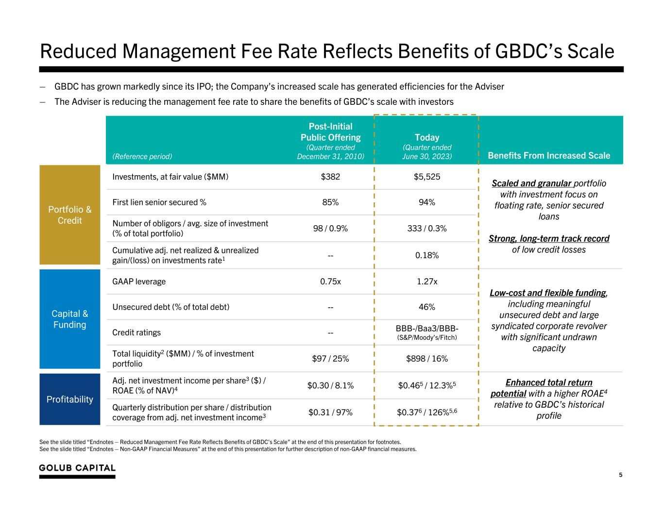 Base Management Fee Reduction Permanently Increases GBDC’s Earnings Power 4 1. All figures are calculated on the basis of average balances as of March 31, 2023 and June 30, 2023. 2. Total operating expenses include professional fees, administrative service fees, director fees and other general and administrative expenses. 3. Due to the purchase accounting for the GCIC acquisition, as a supplement to U.S. generally accepted accounting principles ("GAAP") financial measures, the Company is providing additional non-GAAP measures. See the slide titled "Endnote - Non-GAAP Financial Measures" at the end of this presentation for further description of the non-GAAP financial measures. Quarter Ended (shown on annualized basis)1 June 30, 2023 June 30, 2023 (Pro Forma for Fee Change) Net Investment Income Return on Equity Total investment income (% of average total assets) 10.8% 10.8% Interest and other debt financing expenses (% of average total debt) (5.0%) (5.0%) GAAP leverage (average total debt and average total net assets) 1.25x 1.25x Net investment income return on equity (before operating expenses and advisory fees)2 18.2% 18.2% Base management fee, net of waiver (% of average total net assets) (3.0%) (2.2%) Incentive fee – net investment income (% of average total net assets) (3.0%) (3.1%) Operating expenses (% of average total net assets)2 (0.6%) (0.6%) Net investment income return on equity (% of average total net assets) 11.6% 12.3% Net Investment Income Per Share Net investment income per share $0.43 $0.45 Amortization of purchase premium per share $0.01 $0.01 Adjusted net investment Income per share3 $0.44 $0.46 Annualized adjusted net investment income per share3 $1.75 $1.86 – We believe the fee reduction increases pro forma adjusted net investment income by between $0.02 - $0.03 per share quarterly, or over $0.10 per share annualized – Base management fee reduction increases GBDC’s profitability profile across market and interest rate cycles