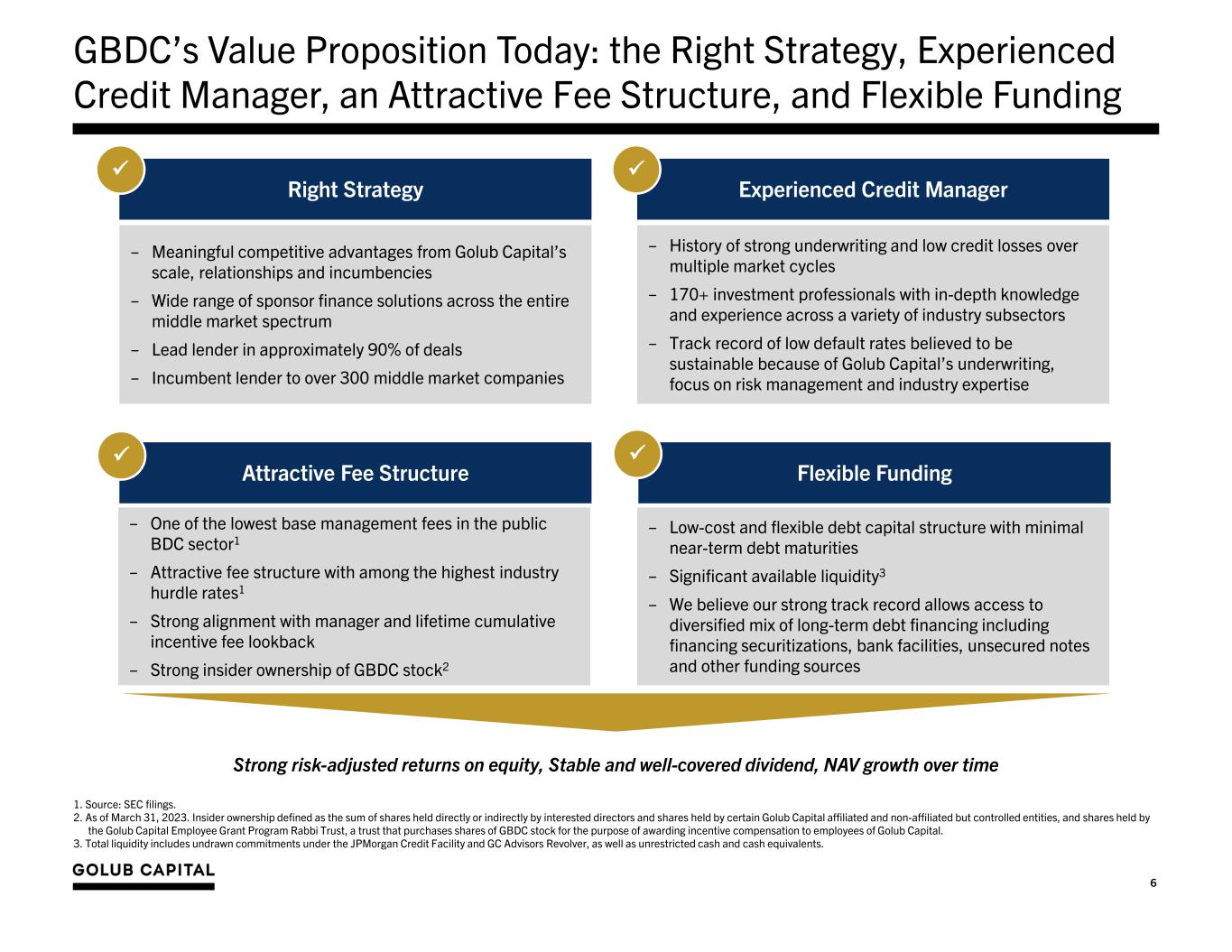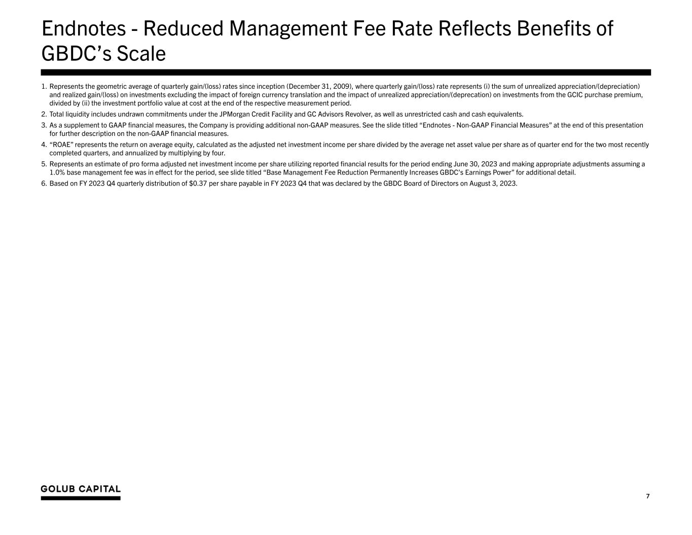 Reduced Management Fee Rate Reflects Benefits of GBDC’s Scale 5 (Reference period) Post-Initial Public Offering (Quarter ended December 31, 2010) Today (Quarter ended June 30, 2023) Benefits From Increased Scale Investments, at fair value ($MM) $382 $5,525 Scaled and granular portfolio with investment focus on floating rate, senior secured loans Strong, long-term track record of low credit losses First lien senior secured % 85% 94% Number of obligors / avg. size of investment (% of total portfolio) 98 / 0.9% 333 / 0.3% Cumulative adj. net realized & unrealized gain/(loss) on investments rate1 -- 0.18% GAAP leverage 0.75x 1.27x Low-cost and flexible funding, including meaningful unsecured debt and large syndicated corporate revolver with significant undrawn capacity Unsecured debt (% of total debt) -- 46% Credit ratings -- BBB-/Baa3/BBB- (S&P/Moody’s/Fitch) Total liquidity2 ($MM) / % of investment portfolio $97 / 25% $898 / 16% Adj. net investment income per share3 ($) / ROAE (% of NAV)4 $0.30 / 8.1% $0.465 / 12.3%5 Enhanced total return potential with a higher ROAE4 relative to GBDC’s historical profile Quarterly distribution per share / distribution coverage from adj. net investment income3 $0.31 / 97% $0.376 / 126%5,6 Portfolio & Credit Profitability Capital & Funding – GBDC has grown markedly since its IPO; the Company’s increased scale has generated efficiencies for the Adviser – The Adviser is reducing the management fee rate to share the benefits of GBDC’s scale with investors See the slide titled “Endnotes – Reduced Management Fee Rate Reflects Benefits of GBDC’s Scale” at the end of this presentation for footnotes. See the slide titled “Endnotes – Non-GAAP Financial Measures” at the end of this presentation for further description of non-GAAP financial measures.