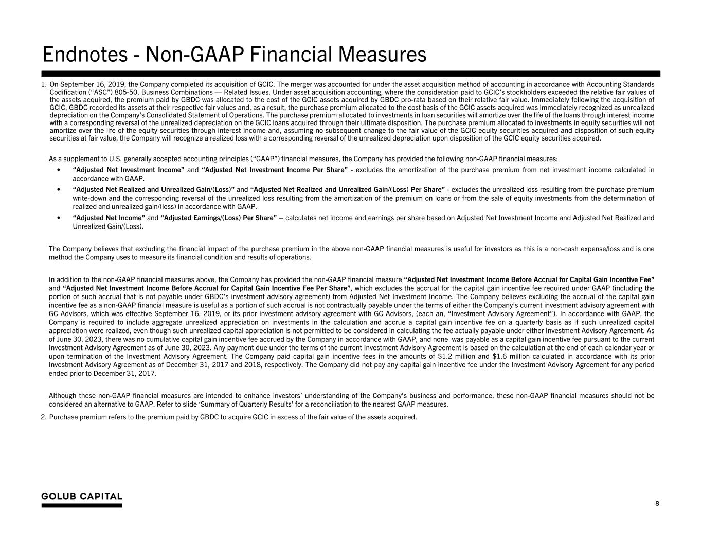Endnotes - Non-GAAP Financial Measures 8 1. On September 16, 2019, the Company completed its acquisition of GCIC. The merger was accounted for under the asset acquisition method of accounting in accordance with Accounting Standards Codification (“ASC”) 805-50, Business Combinations — Related Issues. Under asset acquisition accounting, where the consideration paid to GCIC’s stockholders exceeded the relative fair values of the assets acquired, the premium paid by GBDC was allocated to the cost of the GCIC assets acquired by GBDC pro-rata based on their relative fair value. Immediately following the acquisition of GCIC, GBDC recorded its assets at their respective fair values and, as a result, the purchase premium allocated to the cost basis of the GCIC assets acquired was immediately recognized as unrealized depreciation on the Company's Consolidated Statement of Operations. The purchase premium allocated to investments in loan securities will amortize over the life of the loans through interest income with a corresponding reversal of the unrealized depreciation on the GCIC loans acquired through their ultimate disposition. The purchase premium allocated to investments in equity securities will not amortize over the life of the equity securities through interest income and, assuming no subsequent change to the fair value of the GCIC equity securities acquired and disposition of such equity securities at fair value, the Company will recognize a realized loss with a corresponding reversal of the unrealized depreciation upon disposition of the GCIC equity securities acquired. As a supplement to U.S. generally accepted accounting principles (“GAAP”) financial measures, the Company has provided the following non-GAAP financial measures: • “Adjusted Net Investment Income” and “Adjusted Net Investment Income Per Share” - excludes the amortization of the purchase premium from net investment income calculated in accordance with GAAP. • “Adjusted Net Realized and Unrealized Gain/(Loss)” and “Adjusted Net Realized and Unrealized Gain/(Loss) Per Share” - excludes the unrealized loss resulting from the purchase premium write-down and the corresponding reversal of the unrealized loss resulting from the amortization of the premium on loans or from the sale of equity investments from the determination of realized and unrealized gain/(loss) in accordance with GAAP. • “Adjusted Net Income” and “Adjusted Earnings/(Loss) Per Share” – calculates net income and earnings per share based on Adjusted Net Investment Income and Adjusted Net Realized and Unrealized Gain/(Loss). The Company believes that excluding the financial impact of the purchase premium in the above non-GAAP financial measures is useful for investors as this is a non-cash expense/loss and is one method the Company uses to measure its financial condition and results of operations. In addition to the non-GAAP financial measures above, the Company has provided the non-GAAP financial measure “Adjusted Net Investment Income Before Accrual for Capital Gain Incentive Fee” and “Adjusted Net Investment Income Before Accrual for Capital Gain Incentive Fee Per Share”, which excludes the accrual for the capital gain incentive fee required under GAAP (including the portion of such accrual that is not payable under GBDC’s investment advisory agreement) from Adjusted Net Investment Income. The Company believes excluding the accrual of the capital gain incentive fee as a non-GAAP financial measure is useful as a portion of such accrual is not contractually payable under the terms of either the Company’s current investment advisory agreement with GC Advisors, which was effective September 16, 2019, or its prior investment advisory agreement with GC Advisors, (each an, “Investment Advisory Agreement”). In accordance with GAAP, the Company is required to include aggregate unrealized appreciation on investments in the calculation and accrue a capital gain incentive fee on a quarterly basis as if such unrealized capital appreciation were realized, even though such unrealized capital appreciation is not permitted to be considered in calculating the fee actually payable under either Investment Advisory Agreement. As of June 30, 2023, there was no cumulative capital gain incentive fee accrued by the Company in accordance with GAAP, and none was payable as a capital gain incentive fee pursuant to the current Investment Advisory Agreement as of June 30, 2023. Any payment due under the terms of the current Investment Advisory Agreement is based on the calculation at the end of each calendar year or upon termination of the Investment Advisory Agreement. The Company paid capital gain incentive fees in the amounts of $1.2 million and $1.6 million calculated in accordance with its prior Investment Advisory Agreement as of December 31, 2017 and 2018, respectively. The Company did not pay any capital gain incentive fee under the Investment Advisory Agreement for any period ended prior to December 31, 2017. Although these non-GAAP financial measures are intended to enhance investors’ understanding of the Company’s business and performance, these non-GAAP financial measures should not be considered an alternative to GAAP. Refer to slide ‘Summary of Quarterly Results’ for a reconciliation to the nearest GAAP measures. 2. Purchase premium refers to the premium paid by GBDC to acquire GCIC in excess of the fair value of the assets acquired.