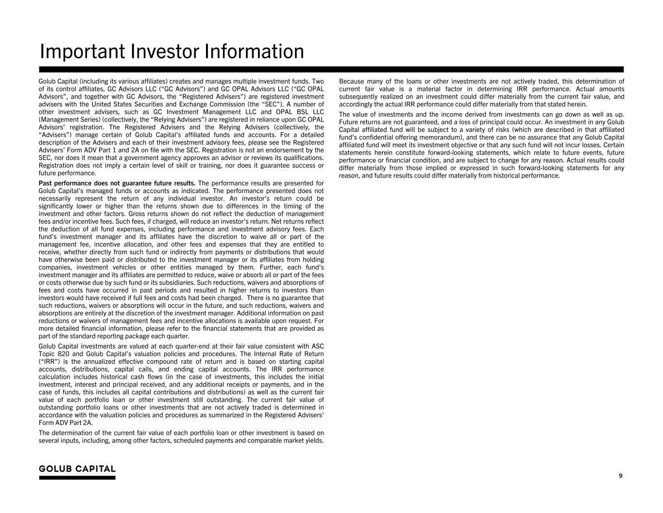 Important Investor Information Golub Capital (including its various affiliates) creates and manages multiple investment funds. Two of its control affiliates, GC Advisors LLC (“GC Advisors”) and GC OPAL Advisors LLC (“GC OPAL Advisors”, and together with GC Advisors, the “Registered Advisers”) are registered investment advisers with the United States Securities and Exchange Commission (the “SEC”). A number of other investment advisers, such as GC Investment Management LLC and OPAL BSL LLC (Management Series) (collectively, the “Relying Advisers”) are registered in reliance upon GC OPAL Advisors’ registration. The Registered Advisers and the Relying Advisers (collectively, the “Advisers”) manage certain of Golub Capital’s affiliated funds and accounts. For a detailed description of the Advisers and each of their investment advisory fees, please see the Registered Advisers’ Form ADV Part 1 and 2A on file with the SEC. Registration is not an endorsement by the SEC, nor does it mean that a government agency approves an advisor or reviews its qualifications. Registration does not imply a certain level of skill or training, nor does it guarantee success or future performance. Past performance does not guarantee future results. The performance results are presented for Golub Capital’s managed funds or accounts as indicated. The performance presented does not necessarily represent the return of any individual investor. An investor’s return could be significantly lower or higher than the returns shown due to differences in the timing of the investment and other factors. Gross returns shown do not reflect the deduction of management fees and/or incentive fees. Such fees, if charged, will reduce an investor’s return. Net returns reflect the deduction of all fund expenses, including performance and investment advisory fees. Each fund’s investment manager and its affiliates have the discretion to waive all or part of the management fee, incentive allocation, and other fees and expenses that they are entitled to receive, whether directly from such fund or indirectly from payments or distributions that would have otherwise been paid or distributed to the investment manager or its affiliates from holding companies, investment vehicles or other entities managed by them. Further, each fund’s investment manager and its affiliates are permitted to reduce, waive or absorb all or part of the fees or costs otherwise due by such fund or its subsidiaries. Such reductions, waivers and absorptions of fees and costs have occurred in past periods and resulted in higher returns to investors than investors would have received if full fees and costs had been charged. There is no guarantee that such reductions, waivers or absorptions will occur in the future, and such reductions, waivers and absorptions are entirely at the discretion of the investment manager. Additional information on past reductions or waivers of management fees and incentive allocations is available upon request. For more detailed financial information, please refer to the financial statements that are provided as part of the standard reporting package each quarter. Golub Capital investments are valued at each quarter-end at their fair value consistent with ASC Topic 820 and Golub Capital’s valuation policies and procedures. The Internal Rate of Return (“IRR”) is the annualized effective compound rate of return and is based on starting capital accounts, distributions, capital calls, and ending capital accounts. The IRR performance calculation includes historical cash flows (in the case of investments, this includes the initial investment, interest and principal received, and any additional receipts or payments, and in the case of funds, this includes all capital contributions and distributions) as well as the current fair value of each portfolio loan or other investment still outstanding. The current fair value of outstanding portfolio loans or other investments that are not actively traded is determined in accordance with the valuation policies and procedures as summarized in the Registered Advisers’ Form ADV Part 2A. The determination of the current fair value of each portfolio loan or other investment is based on several inputs, including, among other factors, scheduled payments and comparable market yields. Because many of the loans or other investments are not actively traded, this determination of current fair value is a material factor in determining IRR performance. Actual amounts subsequently realized on an investment could differ materially from the current fair value, and accordingly the actual IRR performance could differ materially from that stated herein. The value of investments and the income derived from investments can go down as well as up. Future returns are not guaranteed, and a loss of principal could occur. An investment in any Golub Capital affiliated fund will be subject to a variety of risks (which are described in that affiliated fund’s confidential offering memorandum), and there can be no assurance that any Golub Capital affiliated fund will meet its investment objective or that any such fund will not incur losses. Certain statements herein constitute forward-looking statements, which relate to future events, future performance or financial condition, and are subject to change for any reason. Actual results could differ materially from those implied or expressed in such forward-looking statements for any reason, and future results could differ materially from historical performance. 9