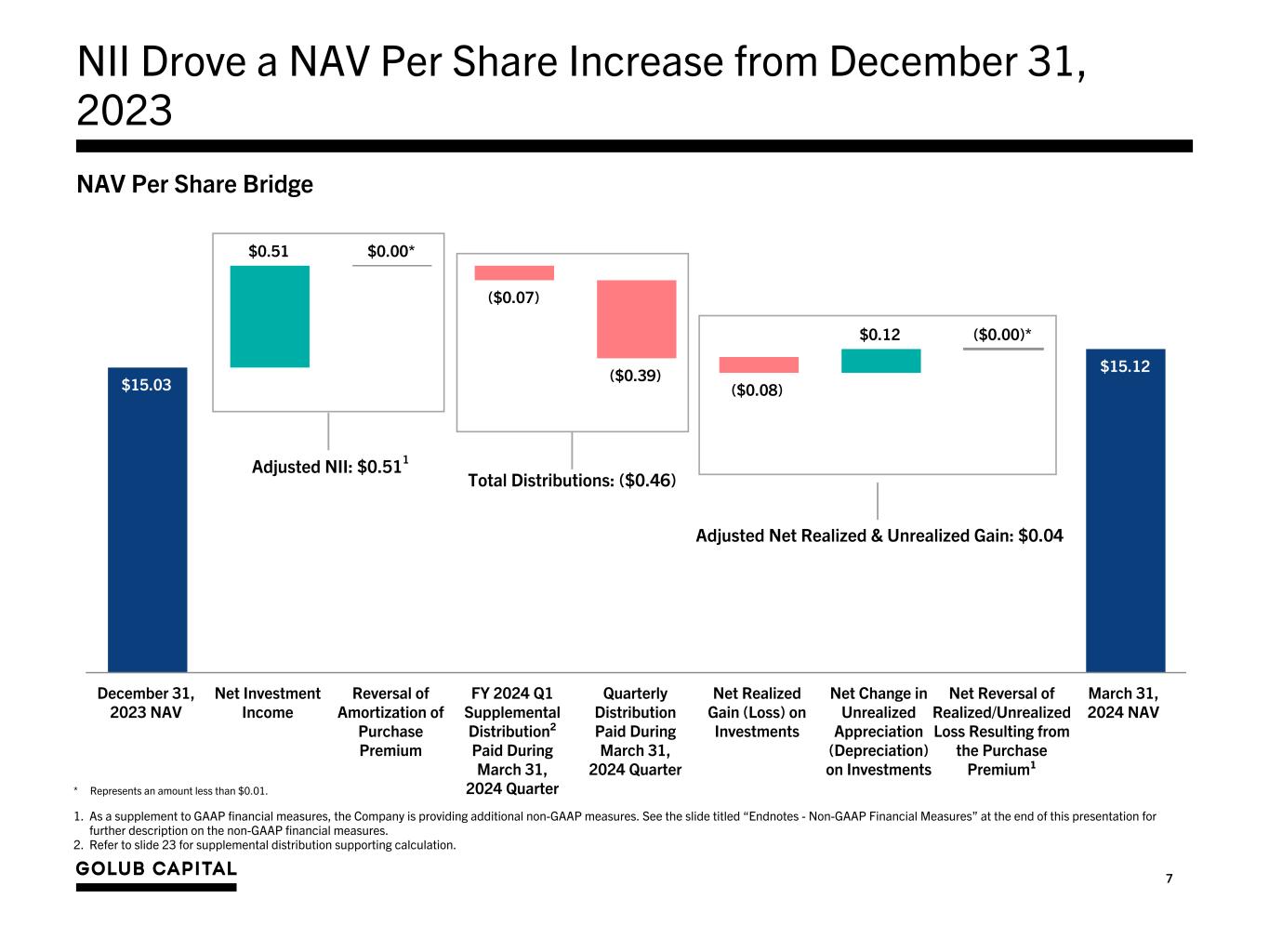 7 $15.03 $0.51 $0.00* ($0.07) ($0.39) ($0.08) $0.12 ($0.00)* $15.12 December 31, 2023 NAV Net Investment Income Reversal of Amortization of Purchase Premium FY 2024 Q1 Supplemental Distribution² Paid During March 31, 2024 Quarter Quarterly Distribution Paid During March 31, 2024 Quarter Net Realized Gain (Loss) on Investments Net Change in Unrealized Appreciation (Depreciation) on Investments Net Reversal of Realized/Unrealized Loss Resulting from the Purchase Premium¹ March 31, 2024 NAV NII Drove a NAV Per Share Increase from December 31, 2023 NAV Per Share Bridge Adjusted Net Realized & Unrealized Gain: $0.04 * Represents an amount less than $0.01. 1. As a supplement to GAAP financial measures, the Company is providing additional non-GAAP measures. See the slide titled “Endnotes - Non-GAAP Financial Measures” at the end of this presentation for further description on the non-GAAP financial measures. 2. Refer to slide 23 for supplemental distribution supporting calculation. Adjusted NII: $0.511 Total Distributions: ($0.46)