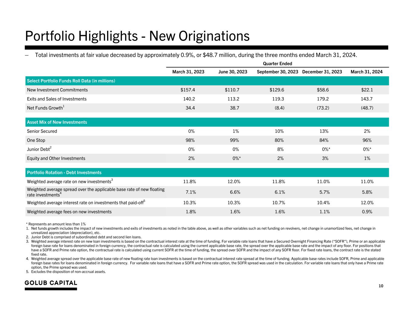 Portfolio Highlights - New Originations Quarter Ended March 31, 2023 June 30, 2023 September 30, 2023 December 31, 2023 March 31, 2024 Select Portfolio Funds Roll Data (in millions) New Investment Commitments $157.4 $110.7 $129.6 $58.6 $22.1 Exits and Sales of Investments 140.2 113.2 119.3 179.2 143.7 Net Funds Growth1 34.4 38.7 (8.4) (73.2) (48.7) Asset Mix of New Investments Senior Secured 0% 1% 10% 13% 2% One Stop 98% 99% 80% 84% 96% Junior Debt2 0% 0% 8% 0%* 0%* Equity and Other Investments 2% 0%* 2% 3% 1% Portfolio Rotation - Debt Investments Weighted average rate on new investments3 11.8% 12.0% 11.8% 11.0% 11.0% Weighted average spread over the applicable base rate of new floating rate investments4 7.1% 6.6% 6.1% 5.7% 5.8% Weighted average interest rate on investments that paid-off5 10.3% 10.3% 10.7% 10.4% 12.0% Weighted average fees on new investments 1.8% 1.6% 1.6% 1.1% 0.9% * Represents an amount less than 1% 1. Net funds growth includes the impact of new investments and exits of investments as noted in the table above, as well as other variables such as net funding on revolvers, net change in unamortized fees, net change in unrealized appreciation (depreciation), etc. 2. Junior Debt is comprised of subordinated debt and second lien loans. 3. Weighted average interest rate on new loan investments is based on the contractual interest rate at the time of funding. For variable rate loans that have a Secured Overnight Financing Rate (“SOFR”), Prime or an applicable foreign base rate for loans denominated in foreign currency, the contractual rate is calculated using the current applicable base rate, the spread over the applicable base rate and the impact of any floor. For positions that have a SOFR and Prime rate option, the contractual rate is calculated using current SOFR at the time of funding, the spread over SOFR and the impact of any SOFR floor. For fixed rate loans, the contract rate is the stated fixed rate. 4. Weighted average spread over the applicable base rate of new floating rate loan investments is based on the contractual interest rate spread at the time of funding. Applicable base rates include SOFR, Prime and applicable foreign base rates for loans denominated in foreign currency. For variable rate loans that have a SOFR and Prime rate option, the SOFR spread was used in the calculation. For variable rate loans that only have a Prime rate option, the Prime spread was used. 5. Excludes the disposition of non-accrual assets. – Total investments at fair value decreased by approximately 0.9%, or $48.7 million, during the three months ended March 31, 2024. 10