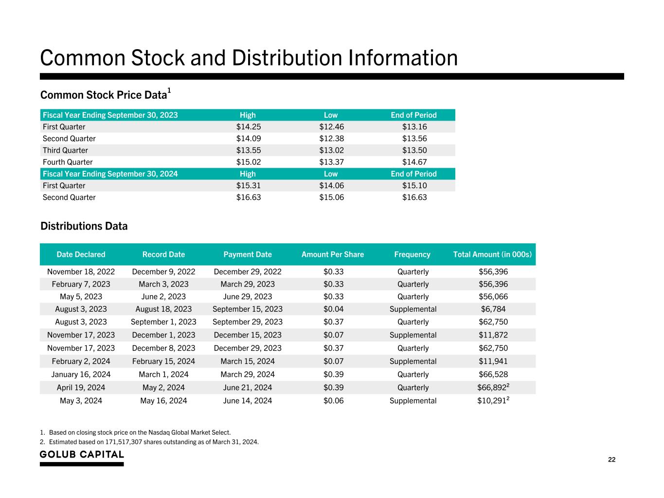 2 Such forward-looking statements may include statements preceded by, followed by or that otherwise include the words “may,” “might,” “will,” “intend,” “should,” “could,” “can,” “would,” “expect,” “believe,” “estimate,” “anticipate,” “predict,” “potential,” “plan” or similar words. We have based the forward-looking statements included in this presentation on information available to us on the date of this presentation. Actual results could differ materially from those anticipated in our forward-looking statements and future results could differ materially from historical performance. We undertake no obligation to revise or update any forward-looking statements, whether as a result of new information, future events or otherwise. You are advised to consult any additional disclosures that we make directly to you or through reports that we have filed or in the future file with the Securities and Exchange Commission (“SEC”), including annual reports on Form 10-K, registration statements on Form N-2, quarterly reports on Form 10-Q and current reports on Form 8-K. This presentation contains statistics and other data that have been obtained from or compiled from information made available by third-party service providers. We have not independently verified such statistics or data. In evaluating prior performance information in this presentation, you should remember that past performance is not a guarantee, prediction, or projection of future results, and there can be no assurance that we will achieve similar results in the future. Some of the statements in this presentation constitute forward-looking statements, which relate to future events or our future performance or financial condition. The forward-looking statements contained in this presentation involve risks and uncertainties, including statements as to: our future operating results; our business prospects and the prospects of our portfolio companies, including our and their ability to achieve our respective objectives due to disruptions, including those caused by global health pandemics, such as the COVID-19 pandemic, or other large scale events; the effect of investments that we expect to make and the competition for those investments; our contractual arrangements and relationships with third parties; actual and potential conflicts of interest with GC Advisors LLC ("GC Advisors"), our investment adviser, and other affiliates of Golub Capital LLC (collectively, "Golub Capital"); the dependence of our future success on the general economy and its effect on the industries in which we invest; the ability of our portfolio companies to achieve their objectives; the use of borrowed money to finance a portion of our investments; the adequacy of our financing sources and working capital; the timing of cash flows, if any, from the operations of our portfolio companies; general economic and political trends and other external factors, changes in political, economic or industry conditions, the interest rate environment or conditions affecting the financial and capital markets that could result in changes to the value of our assets, elevating levels of inflation, and its impact on us, on our portfolio companies and on the industries in which we invest; the ability of GC Advisors to locate suitable investments for us and to monitor and administer our investments; the ability of GC Advisors or its affiliates to attract and retain highly talented professionals; the ability of GC Advisors to continue to effectively manage our business due to disruptions, including those caused by global health pandemics, such as the COVID-19 pandemic, or other large scale events; turmoil in Ukraine and Russia, including sanctions related to such turmoil, and the potential for volatility in energy prices and other supply chain issues and any impact on the industries in which we invest; our ability to qualify and maintain our qualification as a regulated investment company and as a business development company; the impact of information technology systems and systems failures, including data security breaches, data privacy compliance, network disruptions, and cybersecurity attacks; general price and volume fluctuations in the stock markets; the impact on our business of the Dodd-Frank Wall Street Reform and Consumer Protection Act and the rules and regulations issued thereunder and any actions toward repeal thereof; and the effect of changes to tax legislation and our tax position. Disclaimer