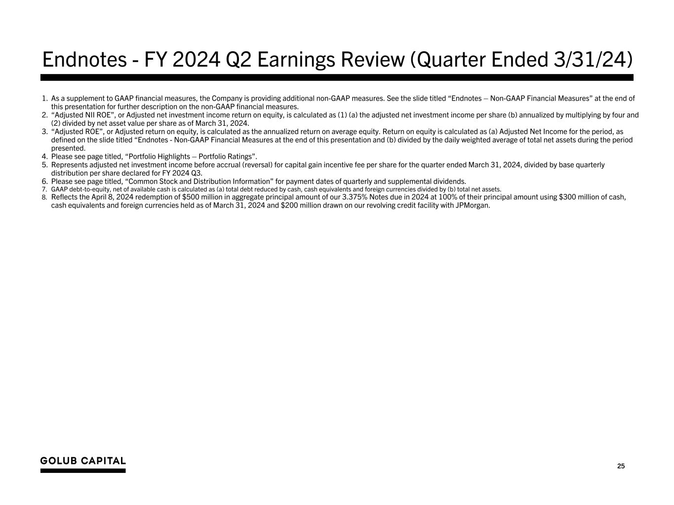 23 1. The net asset value per share subject to the Net Asset Value Stability Requirement will be adjusted to reflect supplemental distributions paid. For instance, the adjusted net asset value per share as of December 31, 2023, will be $14.96 to adjust for the supplemental distribution of $0.07 per share and the adjusted net asset value per share as of March 31, 2024, will be $15.06 to adjust for the FY24 Q1 supplemental distribution of $0.06 per share. 2. The calculation for the quarter ended December 31, 2023, reflects the net asset value per share as of December 31, 2023. 3. The calculation for the quarter ended December 31, 2023, reflects the adjusted net asset value per share as of June 30, 2023. Quarterly Variable Supplemental Distribution Framework FY 2024 Q2 Quarterly Variable Supplemental Distribution Quarter Ended Quarter Ended December 31, 2023 March 31, 2024 Quarterly Variable Supplemental Distribution Adjusted net investment income per share $0.50 $0.51 (-) Quarterly distribution paid (0.37) (0.39) Excess adjusted net investment income per share over quarterly distribution paid $0.13 $0.12 (x) 50.0% of excess 0.065 0.060 Quarterly variable supplemental distribution (rounding 50.0% of excess to nearest $0.01 per share) $0.07 $0.06 Net Asset Value Stability Requirement Net asset value per share (as of March 31, 2024)1,2 $15.03 $15.12 Adjusted net asset value per share (as of September 30, 2023)1,3 $14.79 $14.95 Net asset value per share appreciation/(depreciation) over prior two quarters $0.24 $0.17 (-) Quarterly variable supplemental distribution (0.07) (0.06) Net asset value per share appreciation/(depreciation) over prior two quarters $0.17 $0.11 1% of net asset value limitation of $15.03 and $15.12 $0.15 $0.15 ◦ Expected reduction in variable supplemental distribution amount if such distribution would cause a decline in net asset value over the prior two quarters (inclusive of the impact of the variable supplemental distribution) greater than 1%