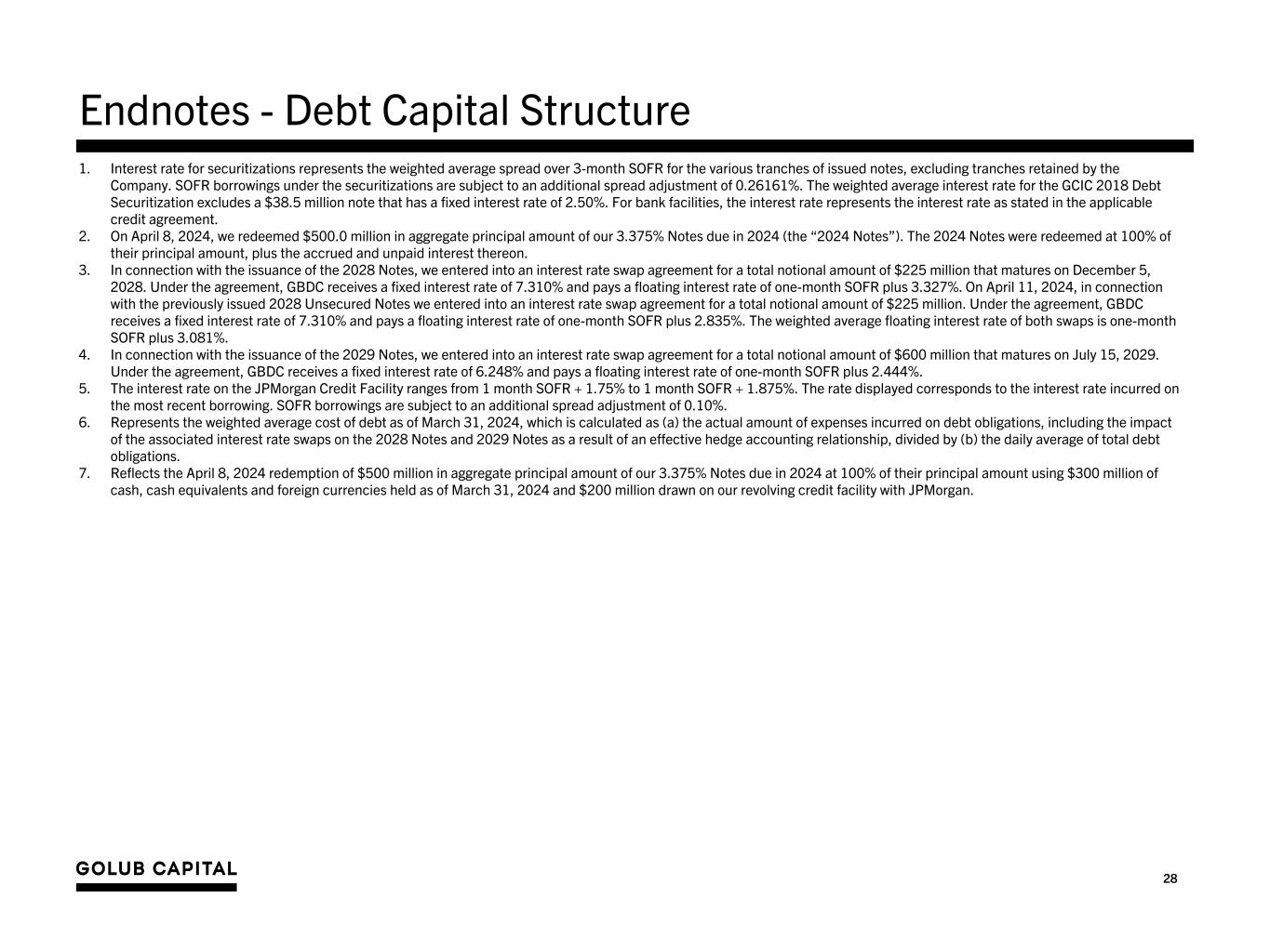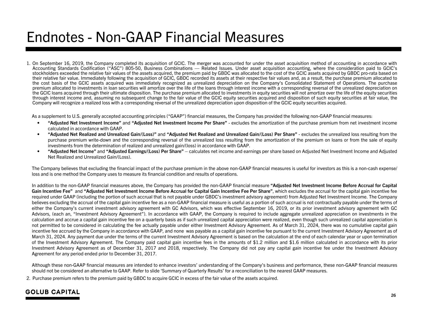 26 Endnotes - Non-GAAP Financial Measures 1. On September 16, 2019, the Company completed its acquisition of GCIC. The merger was accounted for under the asset acquisition method of accounting in accordance with Accounting Standards Codification (“ASC”) 805-50, Business Combinations — Related Issues. Under asset acquisition accounting, where the consideration paid to GCIC’s stockholders exceeded the relative fair values of the assets acquired, the premium paid by GBDC was allocated to the cost of the GCIC assets acquired by GBDC pro-rata based on their relative fair value. Immediately following the acquisition of GCIC, GBDC recorded its assets at their respective fair values and, as a result, the purchase premium allocated to the cost basis of the GCIC assets acquired was immediately recognized as unrealized depreciation on the Company's Consolidated Statement of Operations. The purchase premium allocated to investments in loan securities will amortize over the life of the loans through interest income with a corresponding reversal of the unrealized depreciation on the GCIC loans acquired through their ultimate disposition. The purchase premium allocated to investments in equity securities will not amortize over the life of the equity securities through interest income and, assuming no subsequent change to the fair value of the GCIC equity securities acquired and disposition of such equity securities at fair value, the Company will recognize a realized loss with a corresponding reversal of the unrealized depreciation upon disposition of the GCIC equity securities acquired. As a supplement to U.S. generally accepted accounting principles (“GAAP”) financial measures, the Company has provided the following non-GAAP financial measures: • “Adjusted Net Investment Income” and “Adjusted Net Investment Income Per Share” - excludes the amortization of the purchase premium from net investment income calculated in accordance with GAAP. • “Adjusted Net Realized and Unrealized Gain/(Loss)” and “Adjusted Net Realized and Unrealized Gain/(Loss) Per Share” - excludes the unrealized loss resulting from the purchase premium write-down and the corresponding reversal of the unrealized loss resulting from the amortization of the premium on loans or from the sale of equity investments from the determination of realized and unrealized gain/(loss) in accordance with GAAP. • “Adjusted Net Income” and “Adjusted Earnings/(Loss) Per Share” – calculates net income and earnings per share based on Adjusted Net Investment Income and Adjusted Net Realized and Unrealized Gain/(Loss). The Company believes that excluding the financial impact of the purchase premium in the above non-GAAP financial measures is useful for investors as this is a non-cash expense/ loss and is one method the Company uses to measure its financial condition and results of operations. In addition to the non-GAAP financial measures above, the Company has provided the non-GAAP financial measure “Adjusted Net Investment Income Before Accrual for Capital Gain Incentive Fee” and “Adjusted Net Investment Income Before Accrual for Capital Gain Incentive Fee Per Share”, which excludes the accrual for the capital gain incentive fee required under GAAP (including the portion of such accrual that is not payable under GBDC’s investment advisory agreement) from Adjusted Net Investment Income. The Company believes excluding the accrual of the capital gain incentive fee as a non-GAAP financial measure is useful as a portion of such accrual is not contractually payable under the terms of either the Company’s current investment advisory agreement with GC Advisors, which was effective September 16, 2019, or its prior investment advisory agreement with GC Advisors, (each an, “Investment Advisory Agreement”). In accordance with GAAP, the Company is required to include aggregate unrealized appreciation on investments in the calculation and accrue a capital gain incentive fee on a quarterly basis as if such unrealized capital appreciation were realized, even though such unrealized capital appreciation is not permitted to be considered in calculating the fee actually payable under either Investment Advisory Agreement. As of March 31, 2024, there was no cumulative capital gain incentive fee accrued by the Company in accordance with GAAP, and none was payable as a capital gain incentive fee pursuant to the current Investment Advisory Agreement as of March 31, 2024. Any payment due under the terms of the current Investment Advisory Agreement is based on the calculation at the end of each calendar year or upon termination of the Investment Advisory Agreement. The Company paid capital gain incentive fees in the amounts of $1.2 million and $1.6 million calculated in accordance with its prior Investment Advisory Agreement as of December 31, 2017 and 2018, respectively. The Company did not pay any capital gain incentive fee under the Investment Advisory Agreement for any period ended prior to December 31, 2017. Although these non-GAAP financial measures are intended to enhance investors’ understanding of the Company’s business and performance, these non-GAAP financial measures should not be considered an alternative to GAAP. Refer to slide ‘Summary of Quarterly Results’ for a reconciliation to the nearest GAAP measures. 2. Purchase premium refers to the premium paid by GBDC to acquire GCIC in excess of the fair value of the assets acquired.