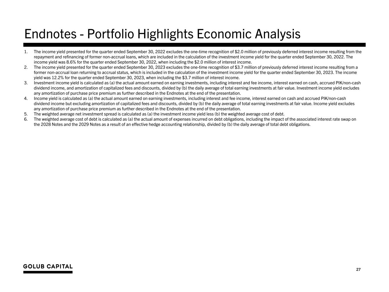 27 Endnotes - Portfolio Highlights Economic Analysis 1. The income yield presented for the quarter ended September 30, 2022 excludes the one-time recognition of $2.0 million of previously deferred interest income resulting from the repayment and refinancing of former non-accrual loans, which are included in the calculation of the investment income yield for the quarter ended September 30, 2022. The income yield was 8.6% for the quarter ended September 30, 2022, when including the $2.0 million of interest income. 2. The income yield presented for the quarter ended September 30, 2023 excludes the one-time recognition of $3.7 million of previously deferred interest income resulting from a former non-accrual loan returning to accrual status, which is included in the calculation of the investment income yield for the quarter ended September 30, 2023. The income yield was 12.2% for the quarter ended September 30, 2023, when including the $3.7 million of interest income. 3. Investment income yield is calculated as (a) the actual amount earned on earning investments, including interest and fee income, interest earned on cash, accrued PIK/non-cash dividend income, and amortization of capitalized fees and discounts, divided by (b) the daily average of total earning investments at fair value. Investment income yield excludes any amortization of purchase price premium as further described in the Endnotes at the end of the presentation. 4. Income yield is calculated as (a) the actual amount earned on earning investments, including interest and fee income, interest earned on cash and accrued PIK/non-cash dividend income but excluding amortization of capitalized fees and discounts, divided by (b) the daily average of total earning investments at fair value. Income yield excludes any amortization of purchase price premium as further described in the Endnotes at the end of the presentation. 5. The weighted average net investment spread is calculated as (a) the investment income yield less (b) the weighted average cost of debt. 6. The weighted average cost of debt is calculated as (a) the actual amount of expenses incurred on debt obligations, including the impact of the associated interest rate swap on the 2028 Notes and the 2029 Notes as a result of an effective hedge accounting relationship, divided by (b) the daily average of total debt obligations.