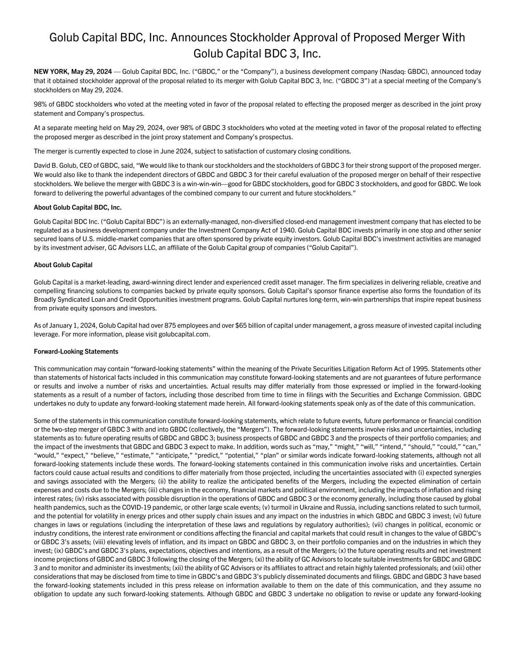 Golub Capital BDC, Inc. Announces Stockholder Approval of Proposed Merger With Golub Capital BDC 3, Inc. NEW YORK, May 29, 2024 — Golub Capital BDC, Inc. (“GBDC,” or the “Company”), a business development company (Nasdaq: GBDC), announced today that it obtained stockholder approval of the proposal related to its merger with Golub Capital BDC 3, Inc. (“GBDC 3”) at a special meeting of the Company’s stockholders on May 29, 2024. 98% of GBDC stockholders who voted at the meeting voted in favor of the proposal related to effecting the proposed merger as described in the joint proxy statement and Company’s prospectus. At a separate meeting held on May 29, 2024, over 98% of GBDC 3 stockholders who voted at the meeting voted in favor of the proposal related to effecting the proposed merger as described in the joint proxy statement and Company’s prospectus. The merger is currently expected to close in June 2024, subject to satisfaction of customary closing conditions. David B. Golub, CEO of GBDC, said, “We would like to thank our stockholders and the stockholders of GBDC 3 for their strong support of the proposed merger. We would also like to thank the independent directors of GBDC and GBDC 3 for their careful evaluation of the proposed merger on behalf of their respective stockholders. We believe the merger with GBDC 3 is a win-win-win—good for GBDC stockholders, good for GBDC 3 stockholders, and good for GBDC. We look forward to delivering the powerful advantages of the combined company to our current and future stockholders.” About Golub Capital BDC, Inc. Golub Capital BDC Inc. (“Golub Capital BDC”) is an externally-managed, non-diversified closed-end management investment company that has elected to be regulated as a business development company under the Investment Company Act of 1940. Golub Capital BDC invests primarily in one stop and other senior secured loans of U.S. middle-market companies that are often sponsored by private equity investors. Golub Capital BDC’s investment activities are managed by its investment adviser, GC Advisors LLC, an affiliate of the Golub Capital group of companies (“Golub Capital”). About Golub Capital Golub Capital is a market-leading, award-winning direct lender and experienced credit asset manager. The firm specializes in delivering reliable, creative and compelling financing solutions to companies backed by private equity sponsors. Golub Capital’s sponsor finance expertise also forms the foundation of its Broadly Syndicated Loan and Credit Opportunities investment programs. Golub Capital nurtures long-term, win-win partnerships that inspire repeat business from private equity sponsors and investors. As of January 1, 2024, Golub Capital had over 875 employees and over $65 billion of capital under management, a gross measure of invested capital including leverage. For more information, please visit golubcapital.com. Forward-Looking Statements This communication may contain “forward-looking statements” within the meaning of the Private Securities Litigation Reform Act of 1995. Statements other than statements of historical facts included in this communication may constitute forward-looking statements and are not guarantees of future performance or results and involve a number of risks and uncertainties. Actual results may differ materially from those expressed or implied in the forward-looking statements as a result of a number of factors, including those described from time to time in filings with the Securities and Exchange Commission. GBDC undertakes no duty to update any forward-looking statement made herein. All forward-looking statements speak only as of the date of this communication. Some of the statements in this communication constitute forward-looking statements, which relate to future events, future performance or financial condition or the two-step merger of GBDC 3 with and into GBDC (collectively, the “Mergers”). The forward-looking statements involve risks and uncertainties, including statements as to: future operating results of GBDC and GBDC 3; business prospects of GBDC and GBDC 3 and the prospects of their portfolio companies; and the impact of the investments that GBDC and GBDC 3 expect to make. In addition, words such as “may,” “might,” “will,” “intend,” “should,” “could,” “can,” “would,” “expect,” “believe,” “estimate,” “anticipate,” “predict,” “potential,” “plan” or similar words indicate forward-looking statements, although not all forward-looking statements include these words. The forward-looking statements contained in this communication involve risks and uncertainties. Certain factors could cause actual results and conditions to differ materially from those projected, including the uncertainties associated with (i) expected synergies and savings associated with the Mergers; (ii) the ability to realize the anticipated benefits of the Mergers, including the expected elimination of certain expenses and costs due to the Mergers; (iii) changes in the economy, financial markets and political environment, including the impacts of inflation and rising interest rates; (iv) risks associated with possible disruption in the operations of GBDC and GBDC 3 or the economy generally, including those caused by global health pandemics, such as the COVID-19 pandemic, or other large scale events; (v) turmoil in Ukraine and Russia, including sanctions related to such turmoil, and the potential for volatility in energy prices and other supply chain issues and any impact on the industries in which GBDC and GBDC 3 invest; (vi) future changes in laws or regulations (including the interpretation of these laws and regulations by regulatory authorities); (vii) changes in political, economic or industry conditions, the interest rate environment or conditions affecting the financial and capital markets that could result in changes to the value of GBDC’s o