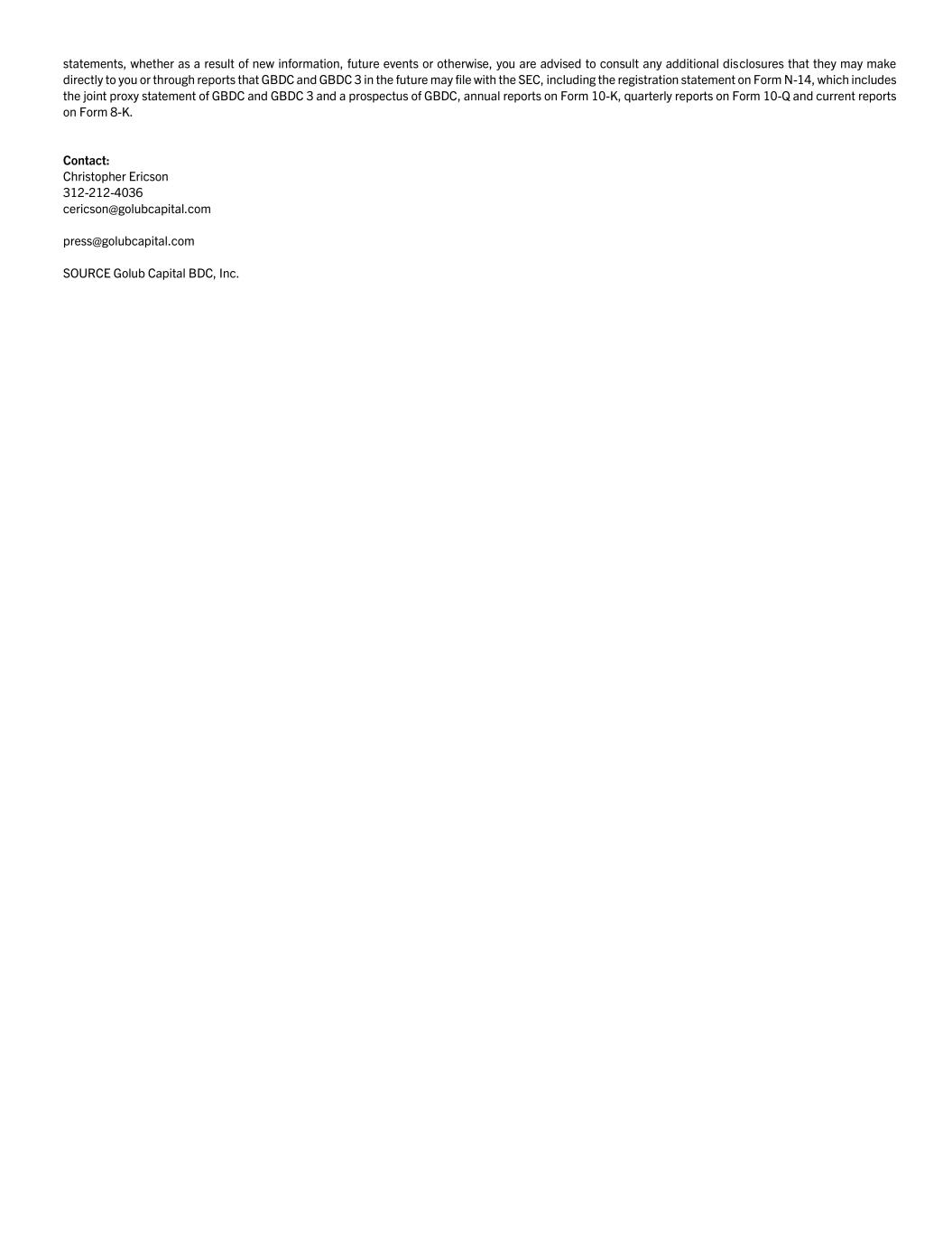 statements, whether as a result of new information, future events or otherwise, you are advised to consult any additional disclosures that they may make directly to you or through reports that GBDC and GBDC 3 in the future may file with the SEC, including the registration statement on Form N-14, which includes the joint proxy statement of GBDC and GBDC 3 and a prospectus of GBDC, annual reports on Form 10-K, quarterly reports on Form 10-Q and current reports on Form 8-K. Contact: Christopher Ericson 312-212-4036 cericson@golubcapital.com press@golubcapital.com SOURCE Golub Capital BDC, Inc.