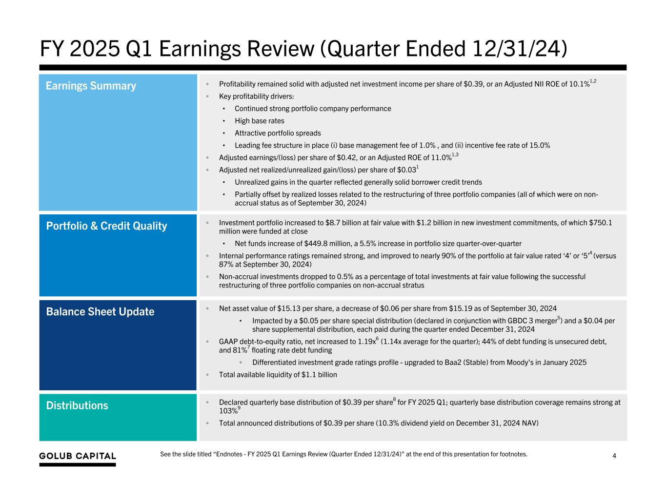 ◦ Net asset value of $15.13 per share, a decrease of $0.06 per share from $15.19 as of September 30, 2024 ▪ Impacted by a $0.05 per share special distribution (declared in conjunction with GBDC 3 merger5) and a $0.04 per share supplemental distribution, each paid during the quarter ended December 31, 2024 ◦ GAAP debt-to-equity ratio, net increased to 1.19x6 (1.14x average for the quarter); 44% of debt funding is unsecured debt, and 81%7 floating rate debt funding ◦ Differentiated investment grade ratings profile - upgraded to Baa2 (Stable) from Moody’s in January 2025 ◦ Total available liquidity of $1.1 billion ◦ Declared quarterly base distribution of $0.39 per share8 for FY 2025 Q1; quarterly base distribution coverage remains strong at 103%9 ◦ Total announced distributions of $0.39 per share (10.3% dividend yield on December 31, 2024 NAV) ◦ Profitability remained solid with adjusted net investment income per share of $0.39, or an Adjusted NII ROE of 10.1%1,2 ◦ Key profitability drivers: ▪ Continued strong portfolio company performance ▪ High base rates ▪ Attractive portfolio spreads ▪ Leading fee structure in place (i) base management fee of 1.0% , and (ii) incentive fee rate of 15.0% ◦ Adjusted earnings/(loss) per share of $0.42, or an Adjusted ROE of 11.0%1,3 ◦ Adjusted net realized/unrealized gain/(loss) per share of $0.031 ▪ Unrealized gains in the quarter reflected generally solid borrower credit trends ▪ Partially offset by realized losses related to the restructuring of three portfolio companies (all of which were on non- accrual status as of September 30, 2024) FY 2025 Q1 Earnings Review (Quarter Ended 12/31/24) Earnings Summary Portfolio & Credit Quality Balance Sheet Update Dividend Policy 4 See the slide titled “Endnotes - FY 2025 Q1 Earnings Review (Quarter Ended 12/31/24)” at the end of this presentation for footnotes. Distributions ◦ Investment portfolio increased to $8.7 billion at fair value with $1.2 billion in new investment commitments, of which $750.1 million were funded at close ▪ Net funds increase of $449.8 million, a 5.5% increase in portfolio size quarter-over-quarter ◦ Internal performance ratings remained strong, and improved to nearly 90% of the portfolio at fair value rated ‘4’ or ‘5’4 (versus 87% at September 30, 2024) ◦ Non-accrual investments dropped to 0.5% as a percentage of total investments at fair value following the successful restructuring of three portfolio companies on non-accrual stratus