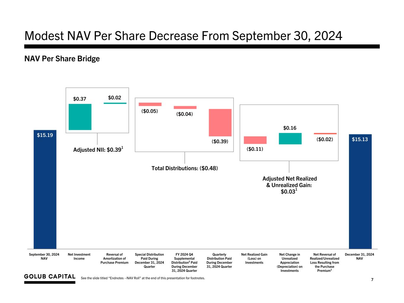 7 $15.19 $0.37 $0.02 ($0.05) ($0.04) ($0.39) ($0.11) $0.16 ($0.02) $15.13 September 30, 2024 NAV Net Investment Income Reversal of Amortization of Purchase Premium Special Distribution Paid During December 31, 2024 Quarter FY 2024 Q4 Supplemental Distribution² Paid During December 31, 2024 Quarter Quarterly Distribution Paid During December 31, 2024 Quarter Net Realized Gain (Loss) on Investments Net Change in Unrealized Appreciation (Depreciation) on Investments Net Reversal of Realized/Unrealized Loss Resulting from the Purchase Premium¹ December 31, 2024 NAV Modest NAV Per Share Decrease From September 30, 2024 NAV Per Share Bridge Adjusted Net Realized & Unrealized Gain: $0.031 See the slide titled “Endnotes –NAV Roll” at the end of this presentation for footnotes. Adjusted NII: $0.391 Total Distributions: ($0.48)