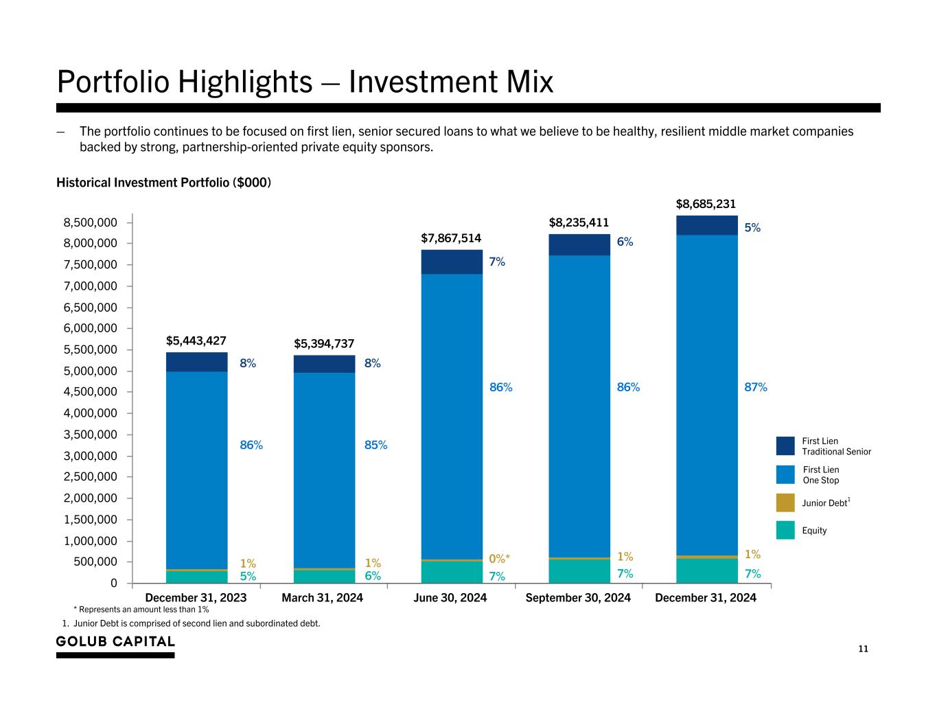 10 Portfolio Highlights - New Originations Quarter Ended Pre-GBDC 3 Acquisition Post-GBDC 3 Acquisition December 31, 2023 March 31, 2024 June 30, 2024 September 30, 2024 December 31, 2024 Select Portfolio Funds Roll Data (in millions) New Investment Commitments $58.6 $22.1 $435.0 $999.8 $1,188.1 Exits and Sales of Investments 179.4 143.7 544.2 395.7 450.2 Net Funds Growth1 (73.2) (48.7) 2,472.8 367.9 449.8 Asset Mix of New Investments Senior Secured 13 % 2 % 8 % 6 % 2 % One Stop 84 % 96 % 89 % 93 % 96 % Junior Debt2 0 %* 0 %* 2 % 0 %* 1 % Equity and Other Investments 3 % 2 % 1 % 1 % 1 % Portfolio Rotation - Debt Investments Weighted average rate on new investments3 11.0 % 11.0 % 10.7 % 9.9 % 9.4 % Weighted average spread over the applicable base rate of new floating rate investments4 5.7 % 5.8 % 5.4 % 5.1 % 5.1 % Weighted average interest rate on investments that paid-off 5 10.4 % 12.0 % 11.3 % 10.7 % 11.3 % Weighted average fees on new investments 1.1 % 0.9 % 0.8 % 0.8 % 0.9 % * Represents an amount less than 1% See the slide titled “Endnotes - Portfolio Highlights - New Originations” at the end of this presentation for footnotes. – Total investments at fair value increased by approximately 5.5%, or $449.8 million, during the three months ended December 31, 2024. – Total investments in portfolio companies at fair value was $8.7 billion at December 31, 2024.
