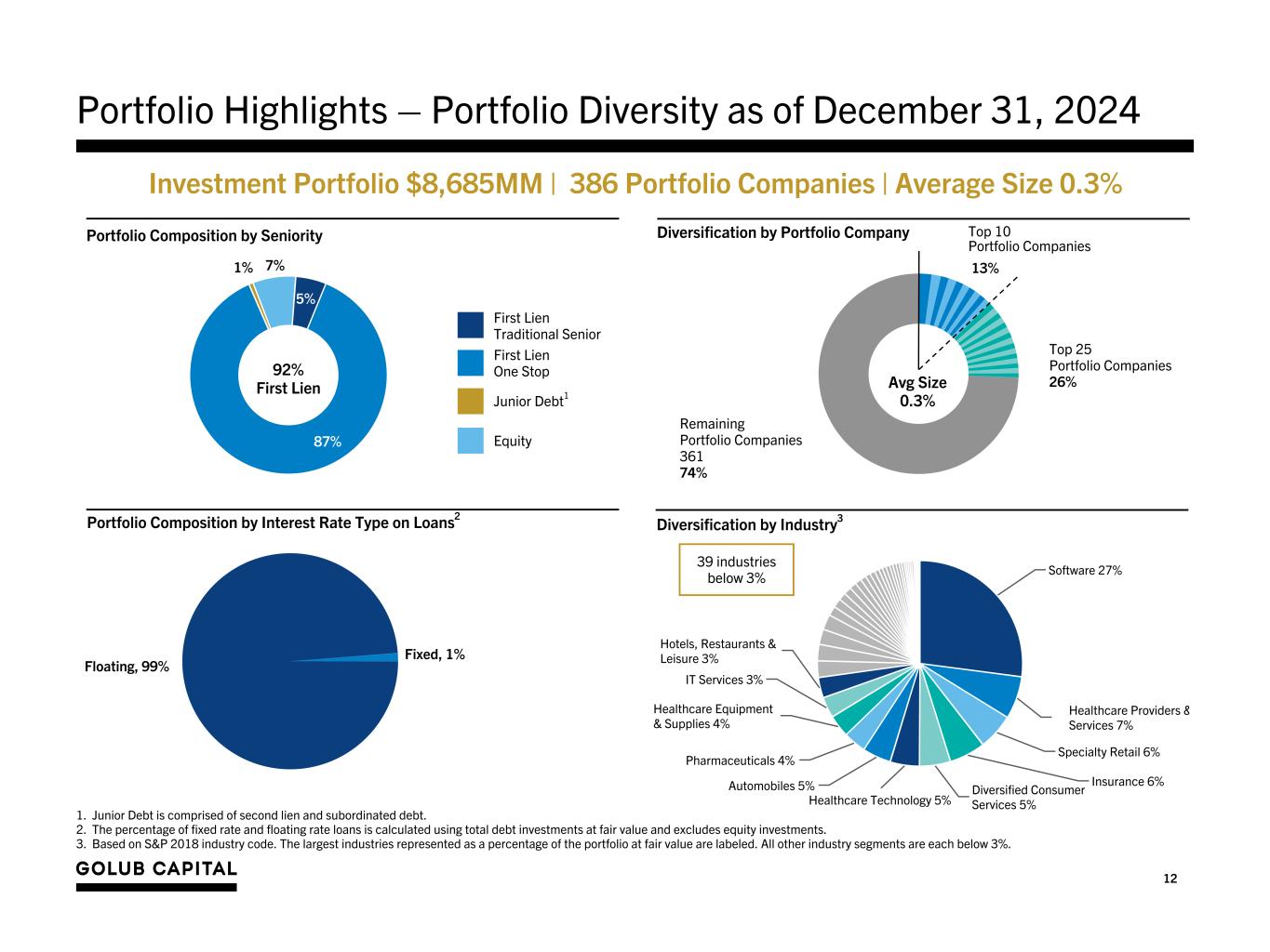 11 $5,443,427 $5,394,737 $7,867,514 $8,235,411 $8,685,231 December 31, 2023 March 31, 2024 June 30, 2024 September 30, 2024 December 31, 2024 0 500,000 1,000,000 1,500,000 2,000,000 2,500,000 3,000,000 3,500,000 4,000,000 4,500,000 5,000,000 5,500,000 6,000,000 6,500,000 7,000,000 7,500,000 8,000,000 8,500,000 Portfolio Highlights – Investment Mix – The portfolio continues to be focused on first lien, senior secured loans to what we believe to be healthy, resilient middle market companies backed by strong, partnership-oriented private equity sponsors. Historical Investment Portfolio ($000) Equity Junior Debt1 First Lien Traditional Senior * Represents an amount less than 1% 1. Junior Debt is comprised of second lien and subordinated debt. 8% 86% 5% 1% 8% 85% 6% 1% 7% 86% 7% 0%* 6% 86% 7% 1% 5% 87% 7% 1% First Lien One Stop