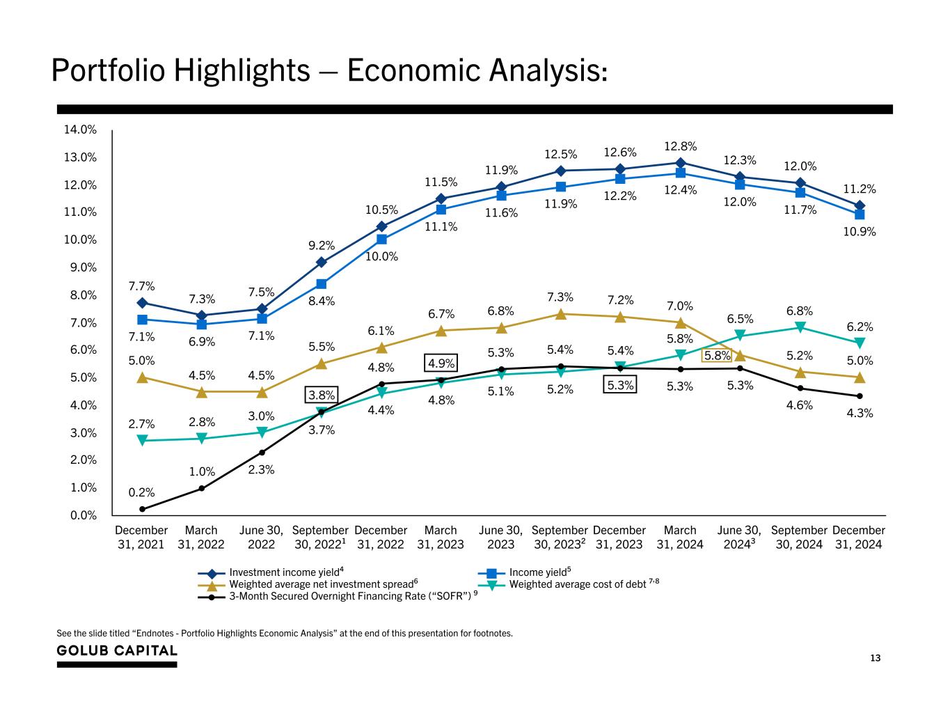 12 7% 5% 87% 1% Software 27% Healthcare Providers & Services 7% Specialty Retail 6% Insurance 6% Diversified Consumer Services 5%Healthcare Technology 5% Automobiles 5% Pharmaceuticals 4% Healthcare Equipment & Supplies 4% IT Services 3% Hotels, Restaurants & Leisure 3% Portfolio Highlights – Portfolio Diversity as of December 31, 2024 Investment Portfolio $8,685MM | 386 Portfolio Companies | Average Size 0.3% 1. Junior Debt is comprised of second lien and subordinated debt. 2. The percentage of fixed rate and floating rate loans is calculated using total debt investments at fair value and excludes equity investments. 3. Based on S&P 2018 industry code. The largest industries represented as a percentage of the portfolio at fair value are labeled. All other industry segments are each below 3%. Diversification by Portfolio Company Equity Junior Debt1 First Lien One Stop First Lien Traditional Senior Top 25 Portfolio Companies 26% Remaining Portfolio Companies 361 74% Top 10 Portfolio Companies 13% Avg Size 0.3% Portfolio Composition by Interest Rate Type on Loans2 Diversification by Industry3 39 industries below 3% Portfolio Composition by Seniority Floating, 99% Fixed, 1% 92% First Lien