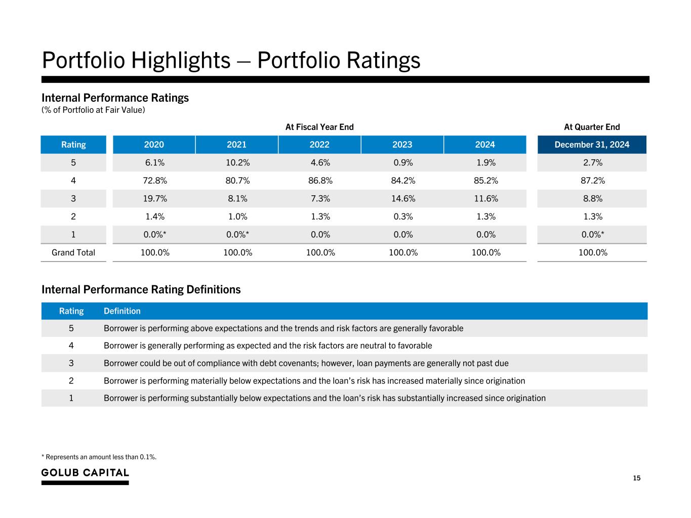 14 – Fundamental credit quality as of December 31, 2024 remained strong with nearly 90% of the investments in our portfolio at fair value having an Internal Performance Rating1 of 4 or higher as of December 31, 2024. – As of December 31, 2024, non-accrual investments remained low at 0.9% and 0.5% as a percentage of total investments at cost and fair value, respectively. – During the quarter ended December 31, 2024, the number of non-accrual investments decreased to nine investments as the restructuring and disposition of three portfolio company investments was partially offset by the addition of one portfolio company investment. Portfolio Highlights - Credit Quality Quarter Ended Pre-GBDC 3 Acquisition Post-GBDC 3 Acquisition December 31, 2023 March 31, 2024 June 30, 2024 September 30, 2024 December 31, 2024 Non-Accrual - Total Investments Non-accrual investments at amortized cost (000s) $87,231 $78,487 $123,054 $142,160 $76,422 Non-accrual investments / total investments at amortized cost2 1.7% 1.5% 1.6% 1.8% 0.9% Non-accrual investments at fair value (000s) $56,485 $47,668 $70,292 $93,204 $44,067 Non-accrual investments / total investments at fair value3 1.1% 0.9% 1.0% 1.2% 0.5% Fair Value of Debt Investments Fair value of total debt investments as a percentage of principal (loans) 96.9% 97.4% 97.6% 97.8% 98.3% 1. Please see Internal Performance Ratings definitions on the following page. 2. For the periods ending December 31, 2023, March 31, 2024, June 30, 2024 and September 30, 2024, the ratios presented for total investments at amortized cost are calculated as (1) non-accrual debt investments at amortized cost divided by (2) total debt investments at amortized cost. 3. For the periods ending December 31, 2023, March 31, 2024, June 30, 2024 and September 30, 2024, the ratios presented for total investments at fair value are calculated as (1) non-accrual debt investments at fair value divided by (2) total debt investments at fair value.