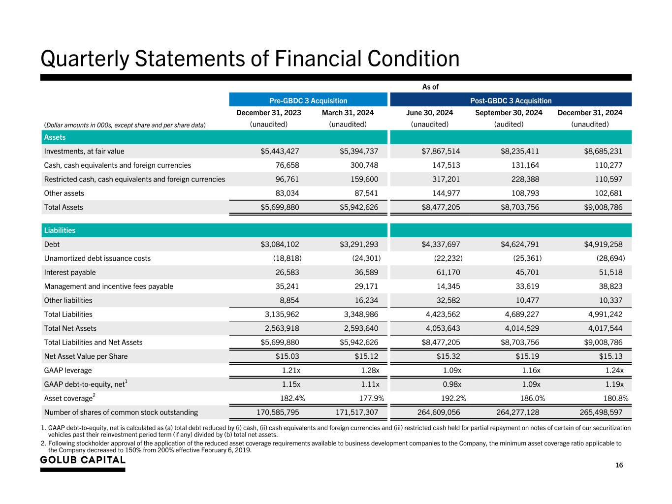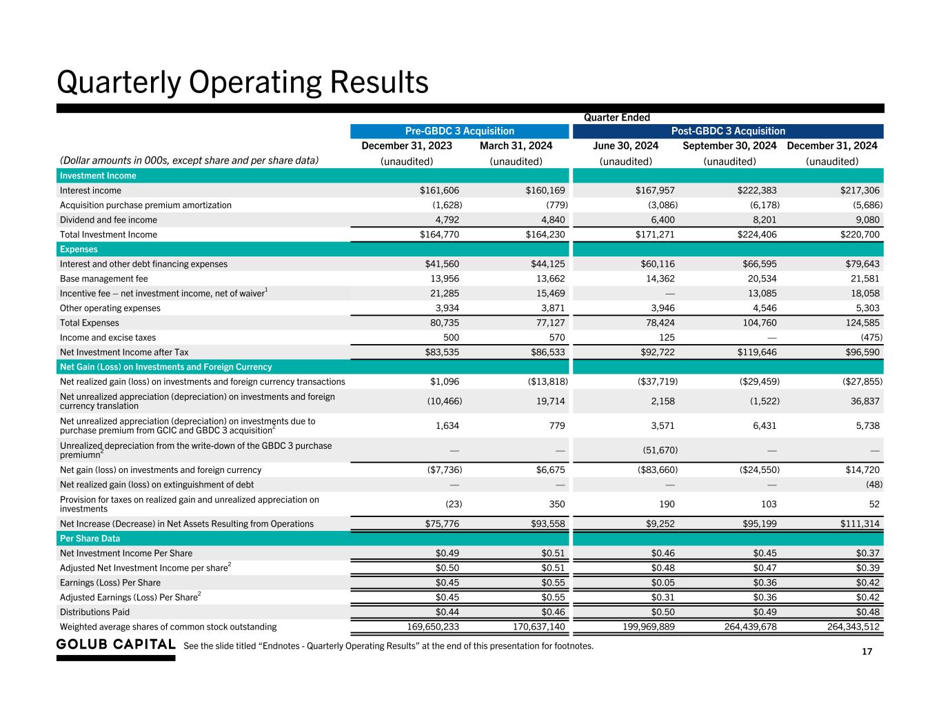 16 Quarterly Statements of Financial Condition As of Pre-GBDC 3 Acquisition Post-GBDC 3 Acquisition (Dollar amounts in 000s, except share and per share data) December 31, 2023 March 31, 2024 June 30, 2024 September 30, 2024 December 31, 2024 (unaudited) (unaudited) (unaudited) (audited) (unaudited) Assets Investments, at fair value $5,443,427 $5,394,737 $7,867,514 $8,235,411 $8,685,231 Cash, cash equivalents and foreign currencies 76,658 300,748 147,513 131,164 110,277 Restricted cash, cash equivalents and foreign currencies 96,761 159,600 317,201 228,388 110,597 Other assets 83,034 87,541 144,977 108,793 102,681 Total Assets $5,699,880 $5,942,626 $8,477,205 $8,703,756 $9,008,786 Liabilities Debt $3,084,102 $3,291,293 $4,337,697 $4,624,791 $4,919,258 Unamortized debt issuance costs (18,818) (24,301) (22,232) (25,361) (28,694) Interest payable 26,583 36,589 61,170 45,701 51,518 Management and incentive fees payable 35,241 29,171 14,345 33,619 38,823 Other liabilities 8,854 16,234 32,582 10,477 10,337 Total Liabilities 3,135,962 3,348,986 4,423,562 4,689,227 4,991,242 Total Net Assets 2,563,918 2,593,640 4,053,643 4,014,529 4,017,544 Total Liabilities and Net Assets $5,699,880 $5,942,626 $8,477,205 $8,703,756 $9,008,786 Net Asset Value per Share $15.03 $15.12 $15.32 $15.19 $15.13 GAAP leverage 1.21x 1.28x 1.09x 1.16x 1.24x GAAP debt-to-equity, net1 1.15x 1.11x 0.98x 1.09x 1.19x Asset coverage2 182.4% 177.9% 192.2% 186.0% 180.8% Number of shares of common stock outstanding 170,585,795 171,517,307 264,609,056 264,277,128 265,498,597 1. GAAP debt-to-equity, net is calculated as (a) total debt reduced by (i) cash, (ii) cash equivalents and foreign currencies and (iii) restricted cash held for partial repayment on notes of certain of our securitization vehicles past their reinvestment period term (if any) divided by (b) total net assets. 2. Following stockholder approval of the application of the reduced asset coverage requirements available to business development companies to the Company, the minimum asset coverage ratio applicable to the Company decreased to 150% from 200% effective February 6, 2019.