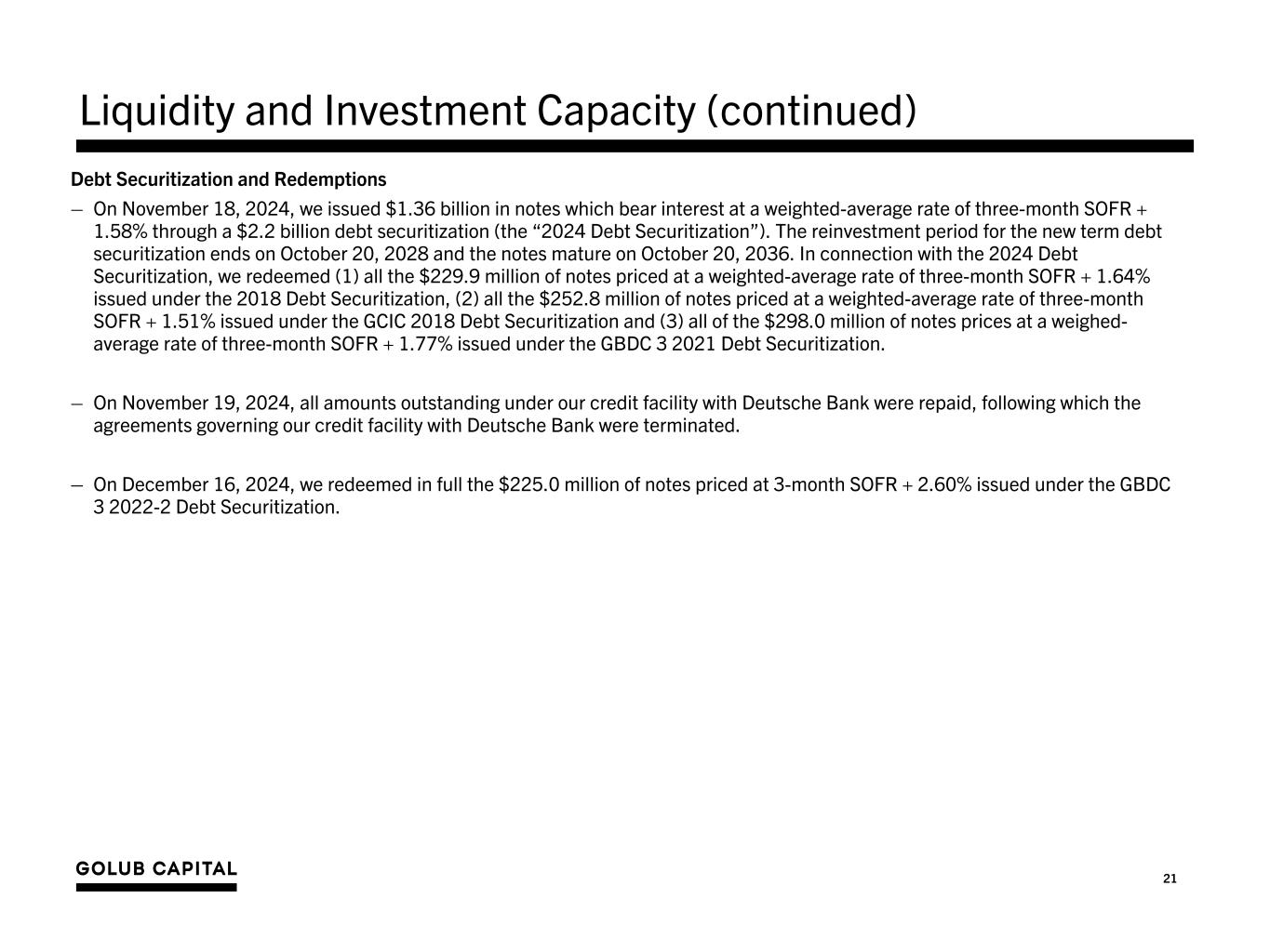 20 Liquidity and Investment Capacity Cash and Cash Equivalents – Unrestricted cash and cash equivalents and foreign currencies totaled $110.3 million as of December 31, 2024. – Restricted cash and cash equivalents and foreign currencies totaled $110.6 million as of December 31, 2024. Restricted cash is held in our securitization vehicles and certain of our revolving credit facilities and is reserved for quarterly interest payments and is also available for new investments that qualify for reinvestment by these entities. As of December 31, 2024, $23.4 million of restricted cash was held for partial repayment on the notes of certain of our securitization vehicles that were past their reinvestment period term. Debt Facilities – Availability – JPM Credit Facility – As of December 31, 2024, subject to leverage and borrowing base restrictions, we had approximately $806.2 million of remaining commitments and availability, in the aggregate, on our $1,997.5 million revolving credit facility with JPMorgan. On November 15, 2024 and December 6, 2024, we entered into agreements to increase the aggregate commitments outstanding under our revolving credit facility with JP Morgan to $1,997.5 million from $1,822.5 million as of September 30, 2024. – GC Advisors Revolver – As of December 31, 2024, we had $200.0 million of remaining commitments and availability on our unsecured line of credit with GC Advisors. Unsecured Notes – Issuances – On December 3, 2024, we issued an additional $150.0 million of 2029 Unsecured Notes, which bear a fixed interest rate of 6.000% (yield to maturity of 5.881%). The additional 2029 Unsecured Notes have the same terms as the original issuance. In connection with the additional 2029 Notes, we entered into an interest rate swap agreement on the additional $150 million principal amount of the additional 2029 Notes where we receive a fixed interest rate of 5.881% and pay a floating interest rate of three-month SOFR plus 2.012%.
