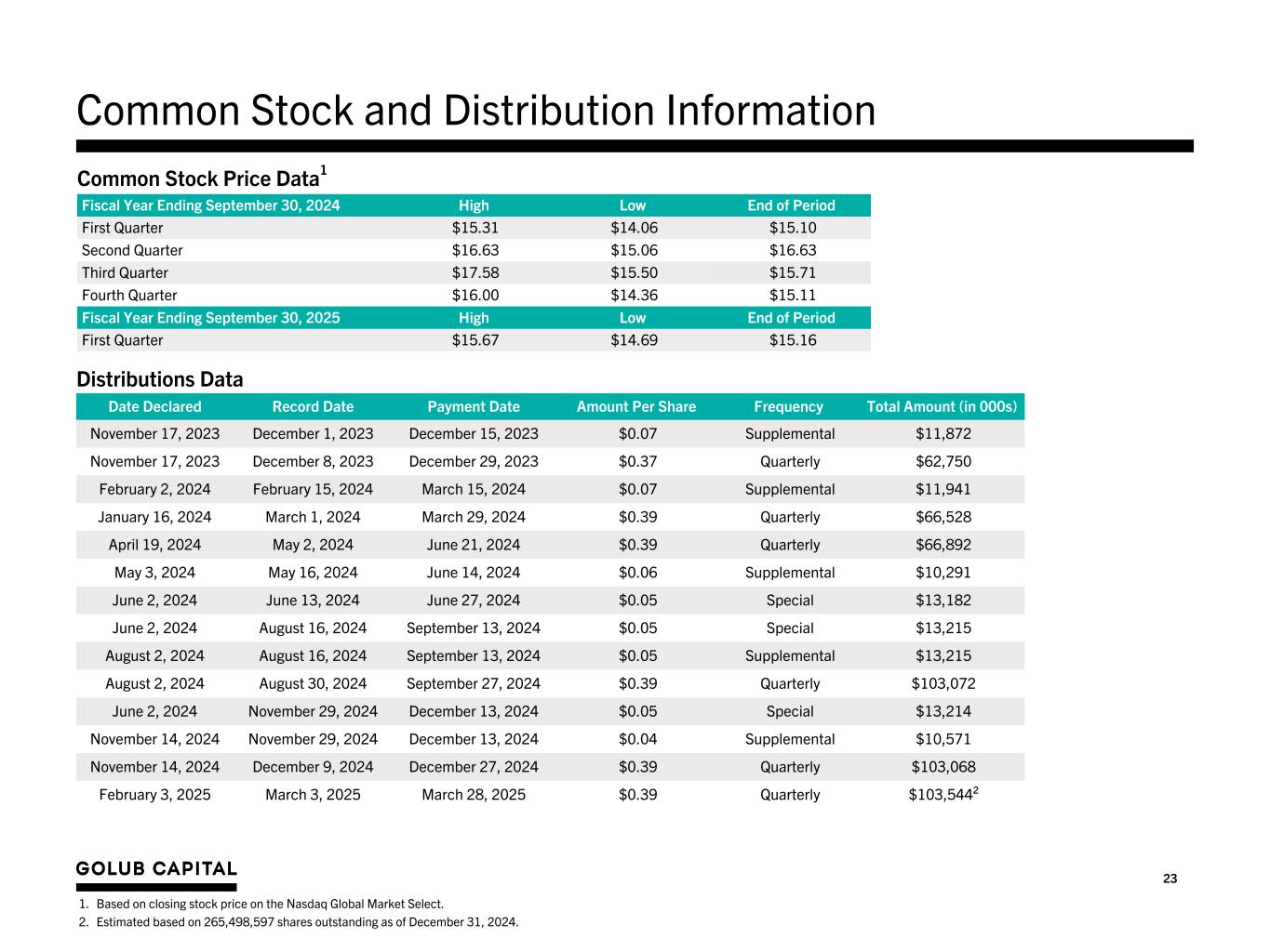 2 Such forward-looking statements may include statements preceded by, followed by or that otherwise include the words “may,” “might,” “will,” “intend,” “should,” “could,” “can,” “would,” “expect,” “believe,” “estimate,” “anticipate,” “predict,” “potential,” “plan” or similar words. We have based the forward-looking statements included in this presentation on information available to us on the date of this presentation. Actual results could differ materially from those anticipated in our forward-looking statements and future results could differ materially from historical performance. We undertake no obligation to revise or update any forward-looking statements, whether as a result of new information, future events or otherwise. You are advised to consult any additional disclosures that we make directly to you or through reports that we have filed or in the future file with the Securities and Exchange Commission (“SEC”), including annual reports on Form 10-K, registration statements on Form N-2, quarterly reports on Form 10-Q and current reports on Form 8-K. This presentation contains statistics and other data that have been obtained from or compiled from information made available by third-party service providers. We have not independently verified such statistics or data. In evaluating prior performance information in this presentation, you should remember that past performance is not a guarantee, prediction, or projection of future results, and there can be no assurance that we will achieve similar results in the future. Some of the statements in this presentation constitute forward-looking statements, which relate to future events or our future performance or financial condition. The forward-looking statements contained in this presentation involve risks and uncertainties, including statements as to: our future operating results; our business prospects and the prospects of our portfolio companies, including our and their ability to achieve our respective objectives due to disruptions, including those caused by global health pandemics, such as the COVID-19 pandemic, or other large scale events; the effect of investments that we expect to make and the competition for those investments; our contractual arrangements and relationships with third parties; actual and potential conflicts of interest with GC Advisors LLC ("GC Advisors"), our investment adviser, and other affiliates of Golub Capital LLC (collectively, "Golub Capital"); the dependence of our future success on the general economy and its effect on the industries in which we invest; the ability of our portfolio companies to achieve their objectives; the use of borrowed money to finance a portion of our investments; the adequacy of our financing sources and working capital; the timing of cash flows, if any, from the operations of our portfolio companies; general economic and political trends and other external factors, changes in political, economic or industry conditions, the interest rate environment or conditions affecting the financial and capital markets that could result in changes to the value of our assets, elevating levels of inflation, and its impact on us, on our portfolio companies and on the industries in which we invest; the ability of GC Advisors to locate suitable investments for us and to monitor and administer our investments; the ability of GC Advisors or its affiliates to attract and retain highly talented professionals; the ability of GC Advisors to continue to effectively manage our business due to disruptions, including those caused by global health pandemics, such as the COVID-19 pandemic, or other large scale events; turmoil in Ukraine, Russia and the Middle East, including sanctions related to such turmoil, and the potential for volatility in energy prices and other supply chain issues and any impact on the industries in which we invest; our ability to qualify and maintain our qualification as a regulated investment company and as a business development company; the impact of information technology systems and systems failures, including data security breaches, data privacy compliance, network disruptions, and cybersecurity attacks; general price and volume fluctuations in the stock markets; the impact on our business of the Dodd-Frank Wall Street Reform and Consumer Protection Act and the rules and regulations issued thereunder and any actions toward repeal thereof; and the effect of changes to tax legislation and our tax position. Disclaimer
