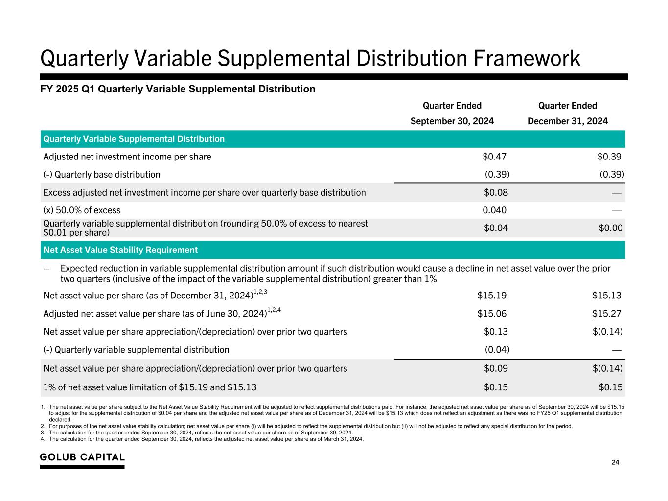 24 1. The net asset value per share subject to the Net Asset Value Stability Requirement will be adjusted to reflect supplemental distributions paid. For instance, the adjusted net asset value per share as of September 30, 2024 will be $15.15 to adjust for the supplemental distribution of $0.04 per share and the adjusted net asset value per share as of December 31, 2024 will be $15.13 which does not reflect an adjustment as there was no FY25 Q1 supplemental distribution declared. 2. For purposes of the net asset value stability calculation; net asset value per share (i) will be adjusted to reflect the supplemental distribution but (ii) will not be adjusted to reflect any special distribution for the period. 3. The calculation for the quarter ended September 30, 2024, reflects the net asset value per share as of September 30, 2024. 4. The calculation for the quarter ended September 30, 2024, reflects the adjusted net asset value per share as of March 31, 2024. Quarterly Variable Supplemental Distribution Framework FY 2025 Q1 Quarterly Variable Supplemental Distribution Quarter Ended Quarter Ended September 30, 2024 December 31, 2024 Quarterly Variable Supplemental Distribution Adjusted net investment income per share $0.47 $0.39 (-) Quarterly base distribution (0.39) (0.39) Excess adjusted net investment income per share over quarterly base distribution $0.08 — (x) 50.0% of excess 0.040 — Quarterly variable supplemental distribution (rounding 50.0% of excess to nearest $0.01 per share) $0.04 $0.00 Net Asset Value Stability Requirement Net asset value per share (as of December 31, 2024)1,2,3 $15.19 $15.13 Adjusted net asset value per share (as of June 30, 2024)1,2,4 $15.06 $15.27 Net asset value per share appreciation/(depreciation) over prior two quarters $0.13 $(0.14) (-) Quarterly variable supplemental distribution (0.04) — Net asset value per share appreciation/(depreciation) over prior two quarters $0.09 $(0.14) 1% of net asset value limitation of $15.19 and $15.13 $0.15 $0.15 – Expected reduction in variable supplemental distribution amount if such distribution would cause a decline in net asset value over the prior two quarters (inclusive of the impact of the variable supplemental distribution) greater than 1%