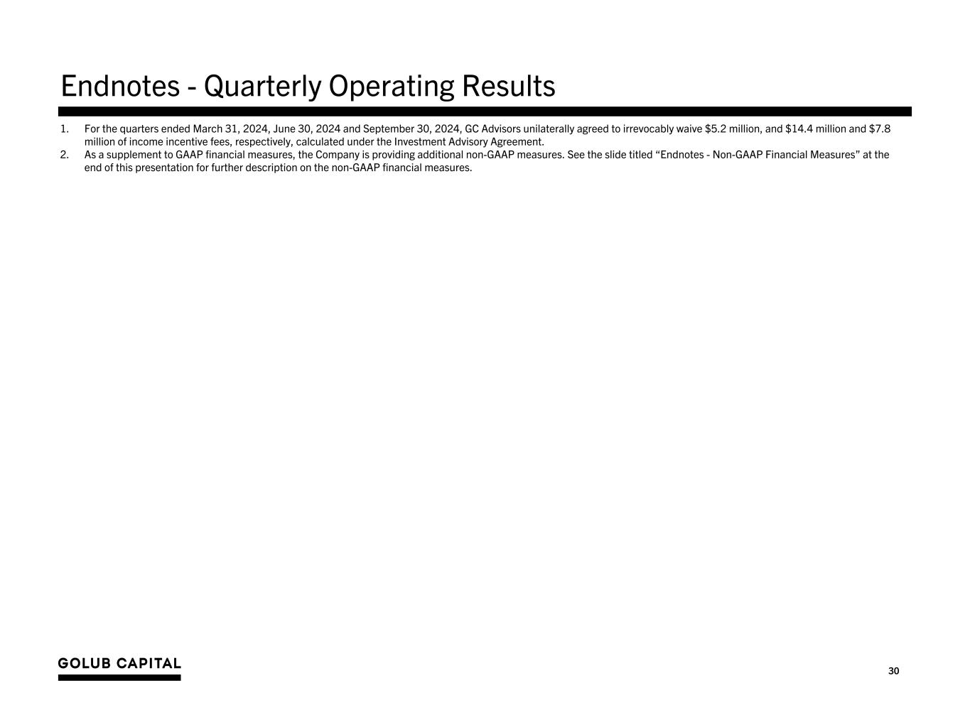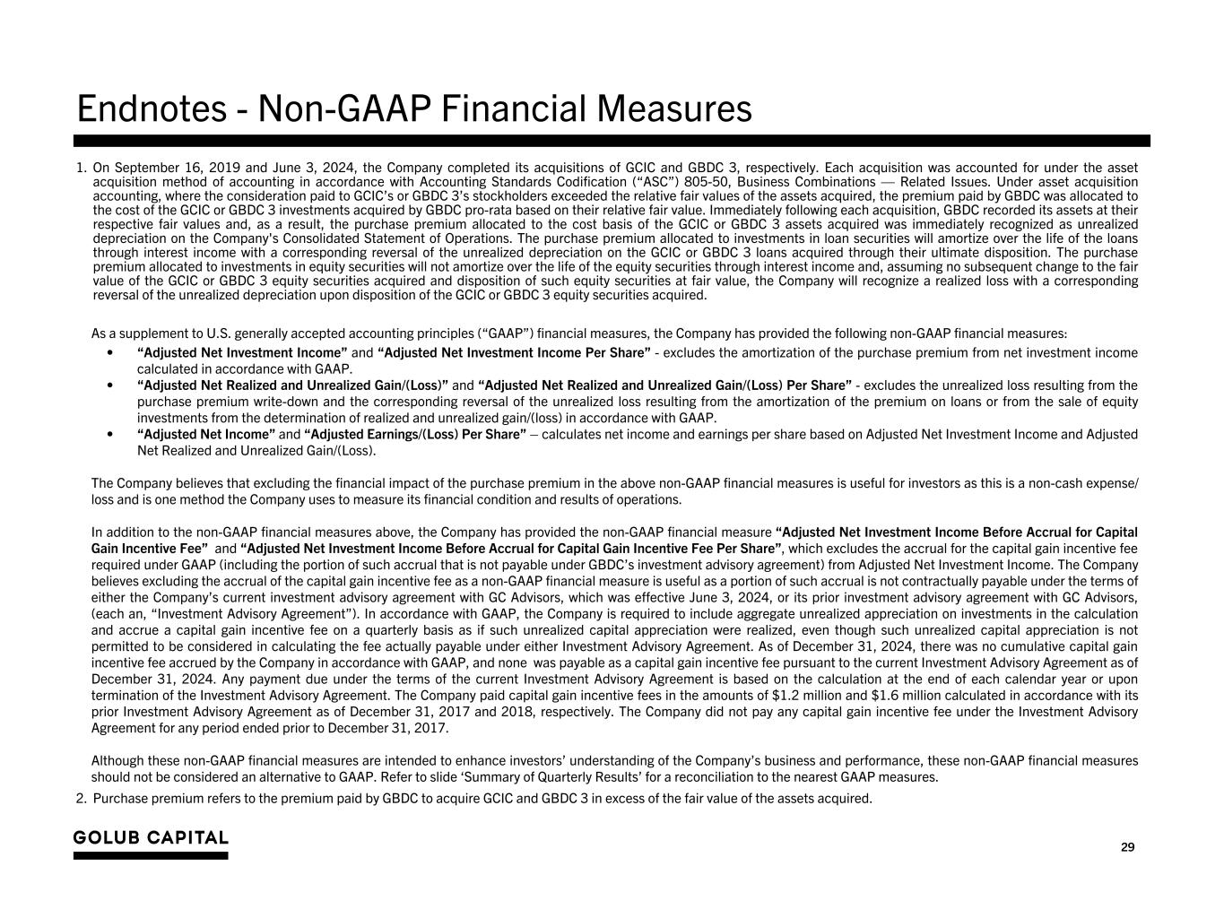 29 Endnotes - Non-GAAP Financial Measures 1. On September 16, 2019 and June 3, 2024, the Company completed its acquisitions of GCIC and GBDC 3, respectively. Each acquisition was accounted for under the asset acquisition method of accounting in accordance with Accounting Standards Codification (“ASC”) 805-50, Business Combinations — Related Issues. Under asset acquisition accounting, where the consideration paid to GCIC’s or GBDC 3’s stockholders exceeded the relative fair values of the assets acquired, the premium paid by GBDC was allocated to the cost of the GCIC or GBDC 3 investments acquired by GBDC pro-rata based on their relative fair value. Immediately following each acquisition, GBDC recorded its assets at their respective fair values and, as a result, the purchase premium allocated to the cost basis of the GCIC or GBDC 3 assets acquired was immediately recognized as unrealized depreciation on the Company's Consolidated Statement of Operations. The purchase premium allocated to investments in loan securities will amortize over the life of the loans through interest income with a corresponding reversal of the unrealized depreciation on the GCIC or GBDC 3 loans acquired through their ultimate disposition. The purchase premium allocated to investments in equity securities will not amortize over the life of the equity securities through interest income and, assuming no subsequent change to the fair value of the GCIC or GBDC 3 equity securities acquired and disposition of such equity securities at fair value, the Company will recognize a realized loss with a corresponding reversal of the unrealized depreciation upon disposition of the GCIC or GBDC 3 equity securities acquired. As a supplement to U.S. generally accepted accounting principles (“GAAP”) financial measures, the Company has provided the following non-GAAP financial measures: • “Adjusted Net Investment Income” and “Adjusted Net Investment Income Per Share” - excludes the amortization of the purchase premium from net investment income calculated in accordance with GAAP. • “Adjusted Net Realized and Unrealized Gain/(Loss)” and “Adjusted Net Realized and Unrealized Gain/(Loss) Per Share” - excludes the unrealized loss resulting from the purchase premium write-down and the corresponding reversal of the unrealized loss resulting from the amortization of the premium on loans or from the sale of equity investments from the determination of realized and unrealized gain/(loss) in accordance with GAAP. • “Adjusted Net Income” and “Adjusted Earnings/(Loss) Per Share” – calculates net income and earnings per share based on Adjusted Net Investment Income and Adjusted Net Realized and Unrealized Gain/(Loss). The Company believes that excluding the financial impact of the purchase premium in the above non-GAAP financial measures is useful for investors as this is a non-cash expense/ loss and is one method the Company uses to measure its financial condition and results of operations. In addition to the non-GAAP financial measures above, the Company has provided the non-GAAP financial measure “Adjusted Net Investment Income Before Accrual for Capital Gain Incentive Fee” and “Adjusted Net Investment Income Before Accrual for Capital Gain Incentive Fee Per Share”, which excludes the accrual for the capital gain incentive fee required under GAAP (including the portion of such accrual that is not payable under GBDC’s investment advisory agreement) from Adjusted Net Investment Income. The Company believes excluding the accrual of the capital gain incentive fee as a non-GAAP financial measure is useful as a portion of such accrual is not contractually payable under the terms of either the Company’s current investment advisory agreement with GC Advisors, which was effective June 3, 2024, or its prior investment advisory agreement with GC Advisors, (each an, “Investment Advisory Agreement”). In accordance with GAAP, the Company is required to include aggregate unrealized appreciation on investments in the calculation and accrue a capital gain incentive fee on a quarterly basis as if such unrealized capital appreciation were realized, even though such unrealized capital appreciation is not permitted to be considered in calculating the fee actually payable under either Investment Advisory Agreement. As of December 31, 2024, there was no cumulative capital gain incentive fee accrued by the Company in accordance with GAAP, and none was payable as a capital gain incentive fee pursuant to the current Investment Advisory Agreement as of December 31, 2024. Any payment due under the terms of the current Investment Advisory Agreement is based on the calculation at the end of each calendar year or upon termination of the Investment Advisory Agreement. The Company paid capital gain incentive fees in the amounts of $1.2 million and $1.6 million calculated in accordance with its prior Investment Advisory Agreement as of December 31, 2017 and 2018, respectively. The Company did not pay any capital gain incentive fee under the Investment Advisory Agreement for any period ended prior to December 31, 2017. Although these non-GAAP financial measures are intended to enhance investors’ understanding of the Company’s business and performance, these non-GAAP financial measures should not be considered an alternative to GAAP. Refer to slide ‘Summary of Quarterly Results’ for a reconciliation to the nearest GAAP measures. 2. Purchase premium refers to the premium paid by GBDC to acquire GCIC and GBDC 3 in excess of the fair value of the assets acquired.