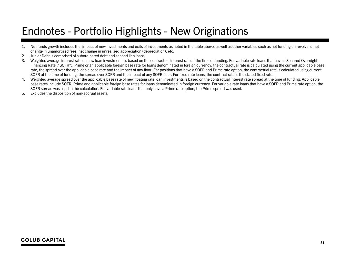 31 Endnotes - Portfolio Highlights - New Originations 1. Net funds growth includes the impact of new investments and exits of investments as noted in the table above, as well as other variables such as net funding on revolvers, net change in unamortized fees, net change in unrealized appreciation (depreciation), etc. 2. Junior Debt is comprised of subordinated debt and second lien loans. 3. Weighted average interest rate on new loan investments is based on the contractual interest rate at the time of funding. For variable rate loans that have a Secured Overnight Financing Rate (“SOFR”), Prime or an applicable foreign base rate for loans denominated in foreign currency, the contractual rate is calculated using the current applicable base rate, the spread over the applicable base rate and the impact of any floor. For positions that have a SOFR and Prime rate option, the contractual rate is calculated using current SOFR at the time of funding, the spread over SOFR and the impact of any SOFR floor. For fixed rate loans, the contract rate is the stated fixed rate. 4. Weighted average spread over the applicable base rate of new floating rate loan investments is based on the contractual interest rate spread at the time of funding. Applicable base rates include SOFR, Prime and applicable foreign base rates for loans denominated in foreign currency. For variable rate loans that have a SOFR and Prime rate option, the SOFR spread was used in the calculation. For variable rate loans that only have a Prime rate option, the Prime spread was used. 5. Excludes the disposition of non-accrual assets.