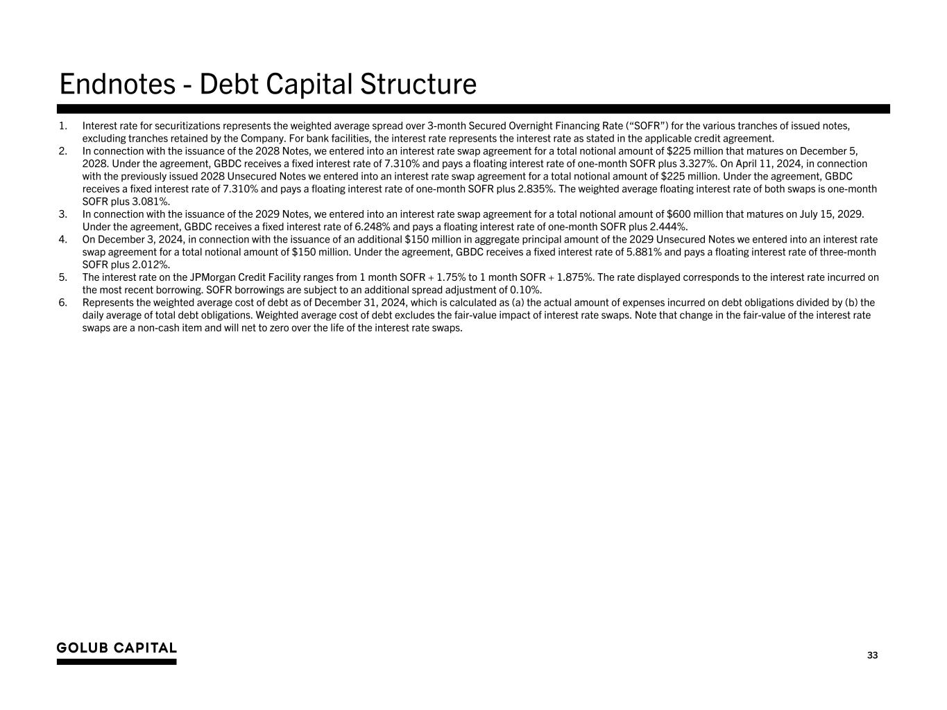 33 1. Interest rate for securitizations represents the weighted average spread over 3-month Secured Overnight Financing Rate (“SOFR”) for the various tranches of issued notes, excluding tranches retained by the Company. For bank facilities, the interest rate represents the interest rate as stated in the applicable credit agreement. 2. In connection with the issuance of the 2028 Notes, we entered into an interest rate swap agreement for a total notional amount of $225 million that matures on December 5, 2028. Under the agreement, GBDC receives a fixed interest rate of 7.310% and pays a floating interest rate of one-month SOFR plus 3.327%. On April 11, 2024, in connection with the previously issued 2028 Unsecured Notes we entered into an interest rate swap agreement for a total notional amount of $225 million. Under the agreement, GBDC receives a fixed interest rate of 7.310% and pays a floating interest rate of one-month SOFR plus 2.835%. The weighted average floating interest rate of both swaps is one-month SOFR plus 3.081%. 3. In connection with the issuance of the 2029 Notes, we entered into an interest rate swap agreement for a total notional amount of $600 million that matures on July 15, 2029. Under the agreement, GBDC receives a fixed interest rate of 6.248% and pays a floating interest rate of one-month SOFR plus 2.444%. 4. On December 3, 2024, in connection with the issuance of an additional $150 million in aggregate principal amount of the 2029 Unsecured Notes we entered into an interest rate swap agreement for a total notional amount of $150 million. Under the agreement, GBDC receives a fixed interest rate of 5.881% and pays a floating interest rate of three-month SOFR plus 2.012%. 5. The interest rate on the JPMorgan Credit Facility ranges from 1 month SOFR + 1.75% to 1 month SOFR + 1.875%. The rate displayed corresponds to the interest rate incurred on the most recent borrowing. SOFR borrowings are subject to an additional spread adjustment of 0.10%. 6. Represents the weighted average cost of debt as of December 31, 2024, which is calculated as (a) the actual amount of expenses incurred on debt obligations divided by (b) the daily average of total debt obligations. Weighted average cost of debt excludes the fair-value impact of interest rate swaps. Note that change in the fair-value of the interest rate swaps are a non-cash item and will net to zero over the life of the interest rate swaps. Endnotes - Debt Capital Structure