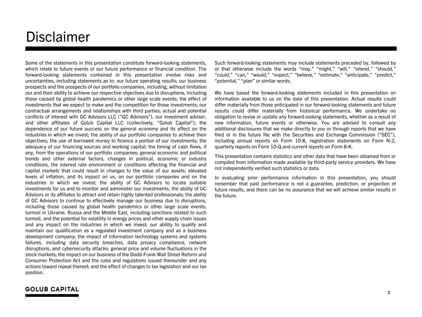 2 Such forward-looking statements may include statements preceded by, followed by or that otherwise include the words “may,” “might,” “will,” “intend,” “should,” “could,” “can,” “would,” “expect,” “believe,” “estimate,” “anticipate,” “predict,” “potential,” “plan” or similar words. We have based the forward-looking statements included in this presentation on information available to us on the date of this presentation. Actual results could differ materially from those anticipated in our forward-looking statements and future results could differ materially from historical performance. We undertake no obligation to revise or update any forward-looking statements, whether as a result of new information, future events or otherwise. You are advised to consult any additional disclosures that we make directly to you or through reports that we have filed or in the future file with the Securities and Exchange Commission (“SEC”), including annual reports on Form 10-K, registration statements on Form N-2, quarterly reports on Form 10-Q and current reports on Form 8-K. This presentation contains statistics and other data that have been obtained from or compiled from information made available by third-party service providers. We have not independently verified such statistics or data. In evaluating prior performance information in this presentation, you should remember that past performance is not a guarantee, prediction, or projection of future results, and there can be no assurance that we will achieve similar results in the future. Some of the statements in this presentation constitute forward-looking statements, which relate to future events or our future performance or financial condition. The forward-looking statements contained in this presentation involve risks and uncertainties, including statements as to: our future operating results; our business prospects and the prospects of our portfolio companies, including, without limitation our and their ability to achieve our respective objectives due to disruptions, including those caused by global health pandemics or other large scale events; the effect of investments that we expect to make and the competition for those investments; our contractual arrangements and relationships with third parties; actual and potential conflicts of interest with GC Advisors LLC ("GC Advisors"), our investment adviser, and other affiliates of Golub Capital LLC (collectively, "Golub Capital"); the dependence of our future success on the general economy and its effect on the industries in which we invest; the ability of our portfolio companies to achieve their objectives; the use of borrowed money to finance a portion of our investments; the adequacy of our financing sources and working capital; the timing of cash flows, if any, from the operations of our portfolio companies; general economic and political trends and other external factors, changes in political, economic or industry conditions, the interest rate environment or conditions affecting the financial and capital markets that could result in changes to the value of our assets; elevated levels of inflation, and its impact on us, on our portfolio companies and on the industries in which we invest; the ability of GC Advisors to locate suitable investments for us and to monitor and administer our investments; the ability of GC Advisors or its affiliates to attract and retain highly talented professionals; the ability of GC Advisors to continue to effectively manage our business due to disruptions, including those caused by global health pandemics or other large scale events; turmoil in Ukraine, Russia and the Middle East, including sanctions related to such turmoil, and the potential for volatility in energy prices and other supply chain issues and any impact on the industries in which we invest; our ability to qualify and maintain our qualification as a regulated investment company and as a business development company; the impact of information technology systems and systems failures, including data security breaches, data privacy compliance, network disruptions, and cybersecurity attacks; general price and volume fluctuations in the stock markets; the impact on our business of the Dodd-Frank Wall Street Reform and Consumer Protection Act and the rules and regulations issued thereunder and any actions toward repeal thereof; and the effect of changes to tax legislation and our tax position. Disclaimer