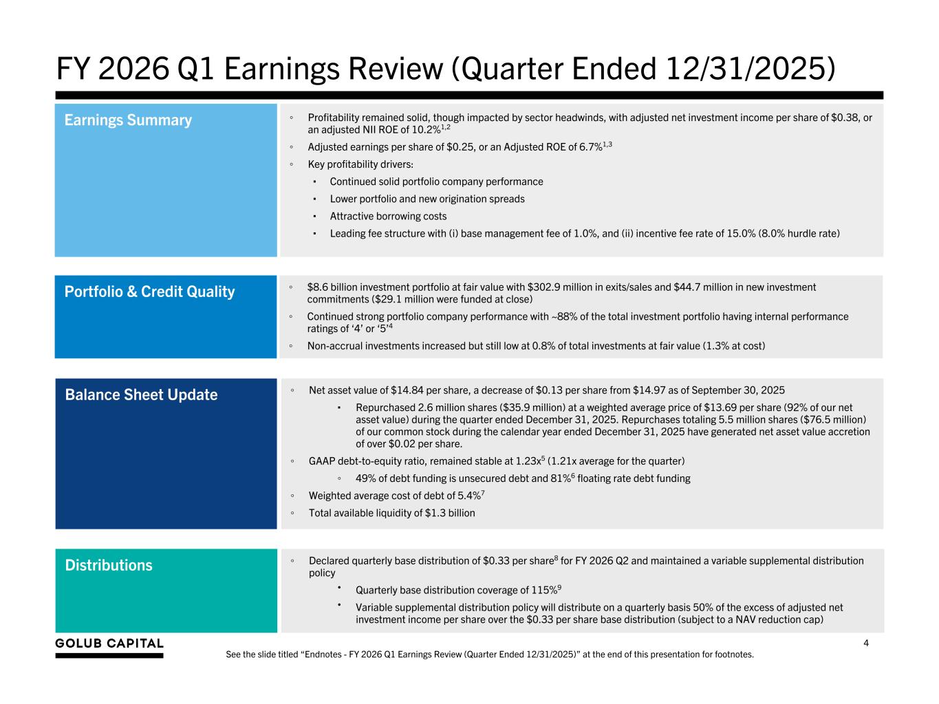 ◦ Declared quarterly base distribution of $0.33 per share8 for FY 2026 Q2 and maintained a variable supplemental distribution policy • Quarterly base distribution coverage of 115%9 • Variable supplemental distribution policy will distribute on a quarterly basis 50% of the excess of adjusted net investment income per share over the $0.33 per share base distribution (subject to a NAV reduction cap) ◦ Profitability remained solid, though impacted by sector headwinds, with adjusted net investment income per share of $0.38, or an adjusted NII ROE of 10.2%1,2 ◦ Adjusted earnings per share of $0.25, or an Adjusted ROE of 6.7%1,3 ◦ Key profitability drivers: ▪ Continued solid portfolio company performance ▪ Lower portfolio and new origination spreads ▪ Attractive borrowing costs ▪ Leading fee structure with (i) base management fee of 1.0%, and (ii) incentive fee rate of 15.0% (8.0% hurdle rate) FY 2026 Q1 Earnings Review (Quarter Ended 12/31/2025) Earnings Summary Portfolio & Credit Quality Dividend Policy ◦ Net asset value of $14.84 per share, a decrease of $0.13 per share from $14.97 as of September 30, 2025 ▪ Repurchased 2.6 million shares ($35.9 million) at a weighted average price of $13.69 per share (92% of our net asset value) during the quarter ended December 31, 2025. Repurchases totaling 5.5 million shares ($76.5 million) of our common stock during the calendar year ended December 31, 2025 have generated net asset value accretion of over $0.02 per share. ◦ GAAP debt-to-equity ratio, remained stable at 1.23x5 (1.21x average for the quarter) ◦ 49% of debt funding is unsecured debt and 81%6 floating rate debt funding ◦ Weighted average cost of debt of 5.4%7 ◦ Total available liquidity of $1.3 billion Balance Sheet Update 4 See the slide titled “Endnotes - FY 2026 Q1 Earnings Review (Quarter Ended 12/31/2025)” at the end of this presentation for footnotes. Distributions ◦ $8.6 billion investment portfolio at fair value with $302.9 million in exits/sales and $44.7 million in new investment commitments ($29.1 million were funded at close) ◦ Continued strong portfolio company performance with ~88% of the total investment portfolio having internal performance ratings of ‘4’ or ‘5’4 ◦ Non-accrual investments increased but still low at 0.8% of total investments at fair value (1.3% at cost)