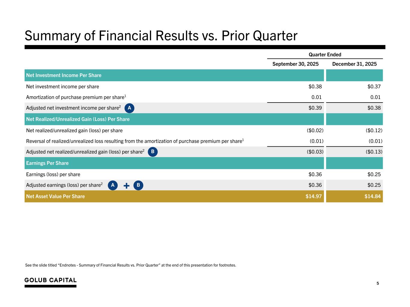 5 Quarter Ended September 30, 2025 December 31, 2025 Net Investment Income Per Share Net investment income per share $0.38 $0.37 Amortization of purchase premium per share1 0.01 0.01 Adjusted net investment income per share2 $0.39 $0.38 Net Realized/Unrealized Gain (Loss) Per Share Net realized/unrealized gain (loss) per share ($0.02) ($0.12) Reversal of realized/unrealized loss resulting from the amortization of purchase premium per share1 (0.01) (0.01) Adjusted net realized/unrealized gain (loss) per share2 ($0.03) ($0.13) Earnings Per Share Earnings (loss) per share $0.36 $0.25 Adjusted earnings (loss) per share2 $0.36 $0.25 Net Asset Value Per Share $14.97 $14.84 Summary of Financial Results vs. Prior Quarter A See the slide titled “Endnotes - Summary of Financial Results vs. Prior Quarter” at the end of this presentation for footnotes. +A B B