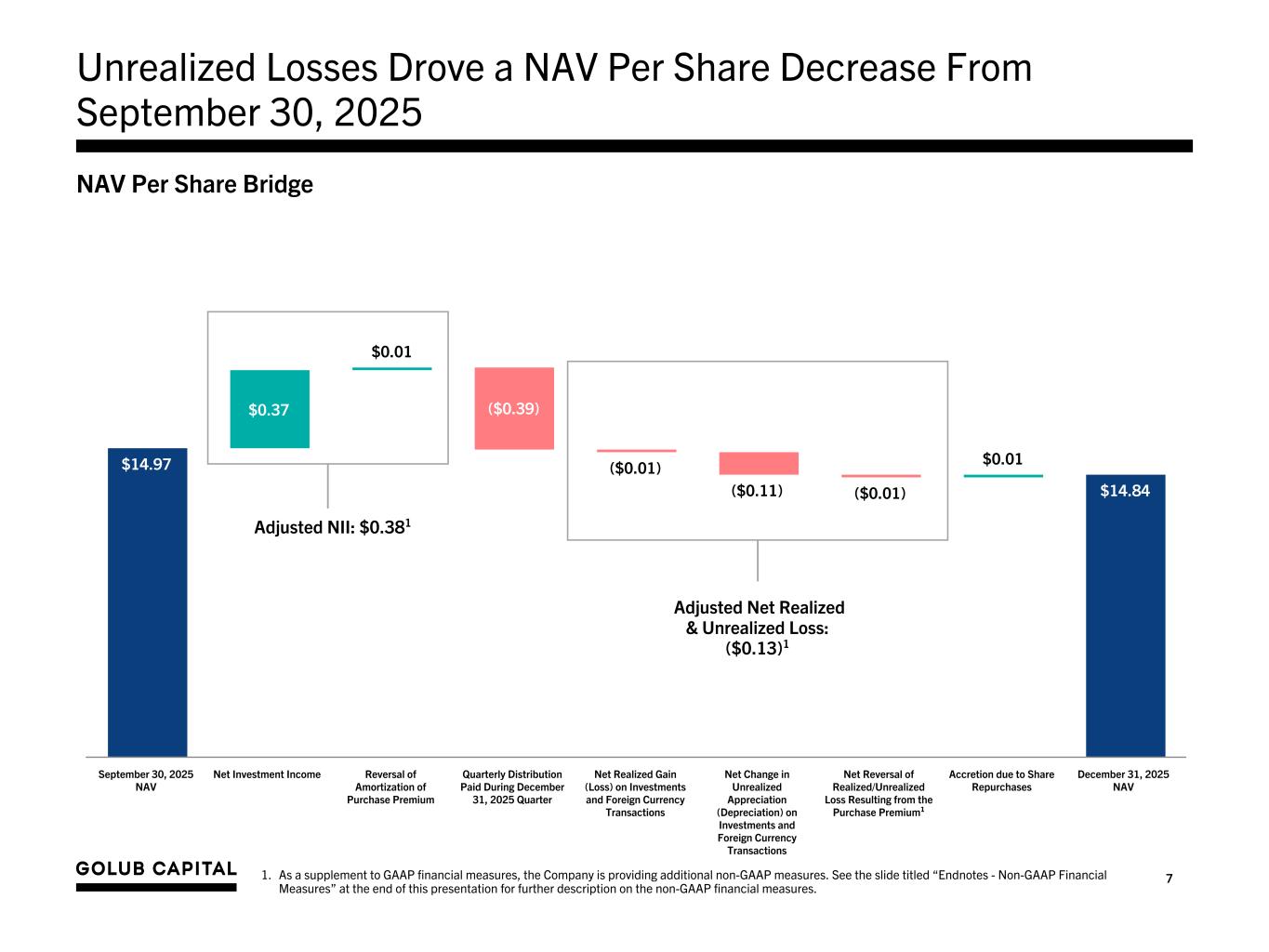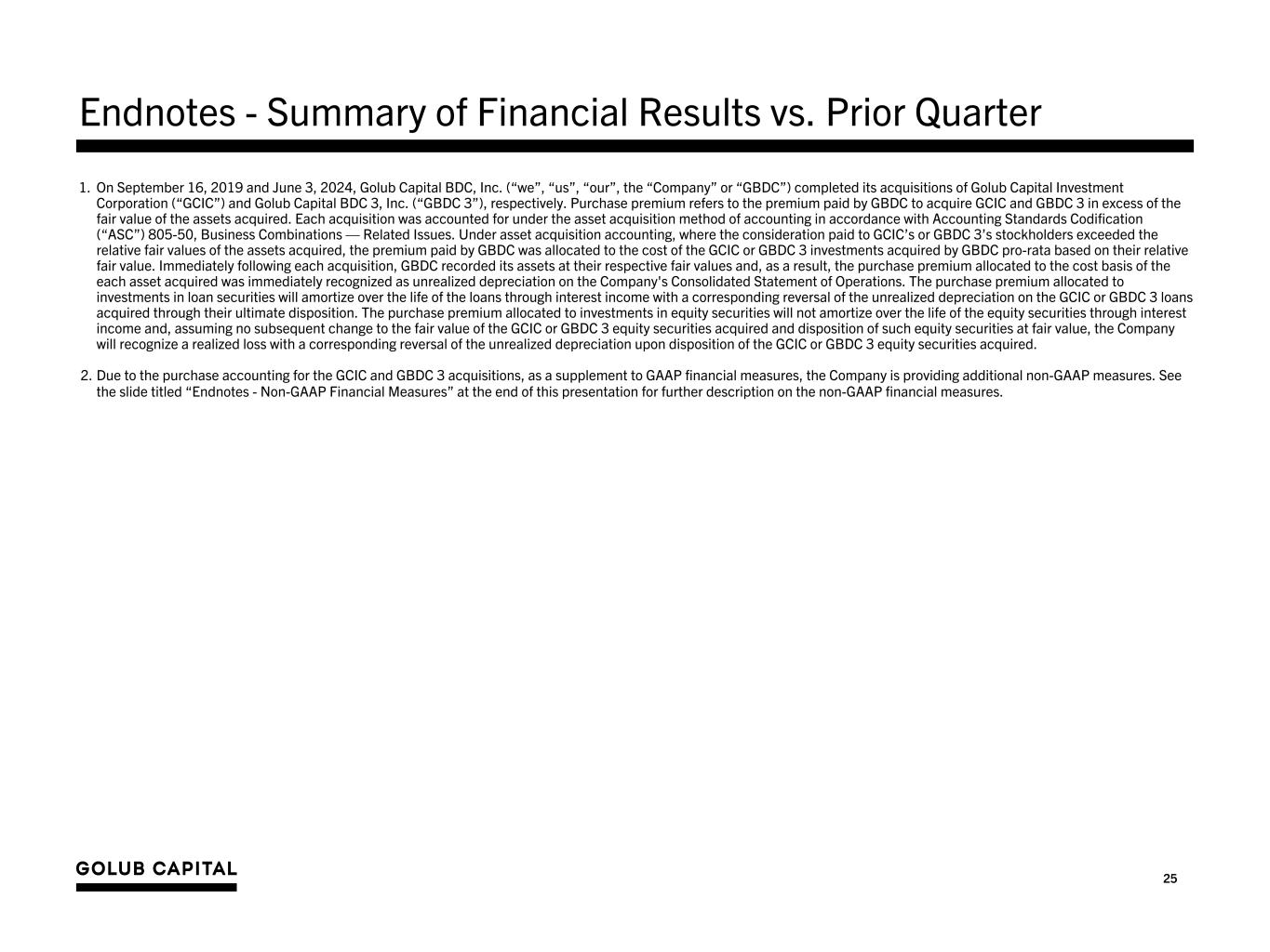 26 Endnotes - Non-GAAP Financial Measures 1. On September 16, 2019 and June 3, 2024, the Company completed its acquisitions of GCIC and GBDC 3, respectively. Each acquisition was accounted for under the asset acquisition method of accounting in accordance with ASC 805-50, Business Combinations — Related Issues. Under asset acquisition accounting, where the consideration paid to GCIC’s or GBDC 3’s stockholders exceeded the relative fair values of the assets acquired, the premium paid by GBDC was allocated to the cost of the GCIC or GBDC 3 investments acquired by GBDC pro-rata based on their relative fair value. Immediately following each acquisition, GBDC recorded its assets at their respective fair values and, as a result, the purchase premium allocated to the cost basis of the GCIC or GBDC 3 assets acquired was immediately recognized as unrealized depreciation on the Company's Consolidated Statement of Operations. The purchase premium allocated to investments in loan securities will amortize over the life of the loans through interest income with a corresponding reversal of the unrealized depreciation on the GCIC or GBDC 3 loans acquired through their ultimate disposition. The purchase premium allocated to investments in equity securities will not amortize over the life of the equity securities through interest income and, assuming no subsequent change to the fair value of the GCIC or GBDC 3 equity securities acquired and disposition of such equity securities at fair value, the Company will recognize a realized loss with a corresponding reversal of the unrealized depreciation upon disposition of the GCIC or GBDC 3 equity securities acquired. As a supplement to GAAP financial measures, the Company has provided the following non-GAAP financial measures: • “Adjusted Net Investment Income” and “Adjusted Net Investment Income Per Share” - excludes the amortization of the purchase premium from net investment income calculated in accordance with GAAP. • “Adjusted Net Realized and Unrealized Gain/(Loss)” and “Adjusted Net Realized and Unrealized Gain/(Loss) Per Share” - excludes the unrealized loss resulting from the purchase premium write-down and the corresponding reversal of the unrealized loss resulting from the amortization of the premium on loans or from the sale of equity investments from the determination of realized and unrealized gain/(loss) in accordance with GAAP. • “Adjusted Net Income”, “Adjusted Net Income Per Share” and “Adjusted Earnings/(Loss) Per Share” – calculates net income and earnings per share based on Adjusted Net Investment Income and Adjusted Net Realized and Unrealized Gain/(Loss). The Company believes that excluding the financial impact of the purchase premium in the above non-GAAP financial measures is useful for investors as this is a non-cash expense/ loss and is one method the Company uses to measure its financial condition and results of operations. In addition to the non-GAAP financial measures above, the Company has provided the non-GAAP financial measure “Adjusted Net Investment Income Before Accrual for Capital Gain Incentive Fee” and “Adjusted Net Investment Income Before Accrual for Capital Gain Incentive Fee Per Share”, which excludes the accrual for the capital gain incentive fee required under GAAP (including the portion of such accrual that is not payable under GBDC’s investment advisory agreement) from Adjusted Net Investment Income. The Company believes excluding the accrual of the capital gain incentive fee as a non-GAAP financial measure is useful as a portion of such accrual is not contractually payable under the terms of either the Company’s current investment advisory agreement with GC Advisors, which was effective June 3, 2024, or its prior investment advisory agreement with GC Advisors, (each an, “Investment Advisory Agreement”). In accordance with GAAP, the Company is required to include aggregate unrealized appreciation on investments in the calculation and accrue a capital gain incentive fee on a quarterly basis as if such unrealized capital appreciation were realized, even though such unrealized capital appreciation is not permitted to be considered in calculating the fee actually payable under either Investment Advisory Agreement. As of December 31, 2025, there was no cumulative capital gain incentive fee accrued by the Company in accordance with GAAP, and none was payable as a capital gain incentive fee pursuant to the current Investment Advisory Agreement as of December 31, 2025. Any payment due under the terms of the current Investment Advisory Agreement is based on the calculation at the end of each calendar year or upon termination of the Investment Advisory Agreement. The Company paid capital gain incentive fees in the amounts of $1.2 million and $1.6 million calculated in accordance with its prior Investment Advisory Agreement as of December 31, 2017 and 2018, respectively. The Company did not pay any capital gain incentive fee under the Investment Advisory Agreement for any period ended prior to December 31, 2017. Although these non-GAAP financial measures are intended to enhance investors’ understanding of the Company’s business and performance, these non-GAAP financial measures should not be considered an alternative to GAAP. Refer to slide ‘Summary of Quarterly Results’ for a reconciliation to the nearest GAAP measures. 2. Purchase premium refers to the premium paid by GBDC to acquire GCIC and GBDC 3 in excess of the fair value of the assets acquired.