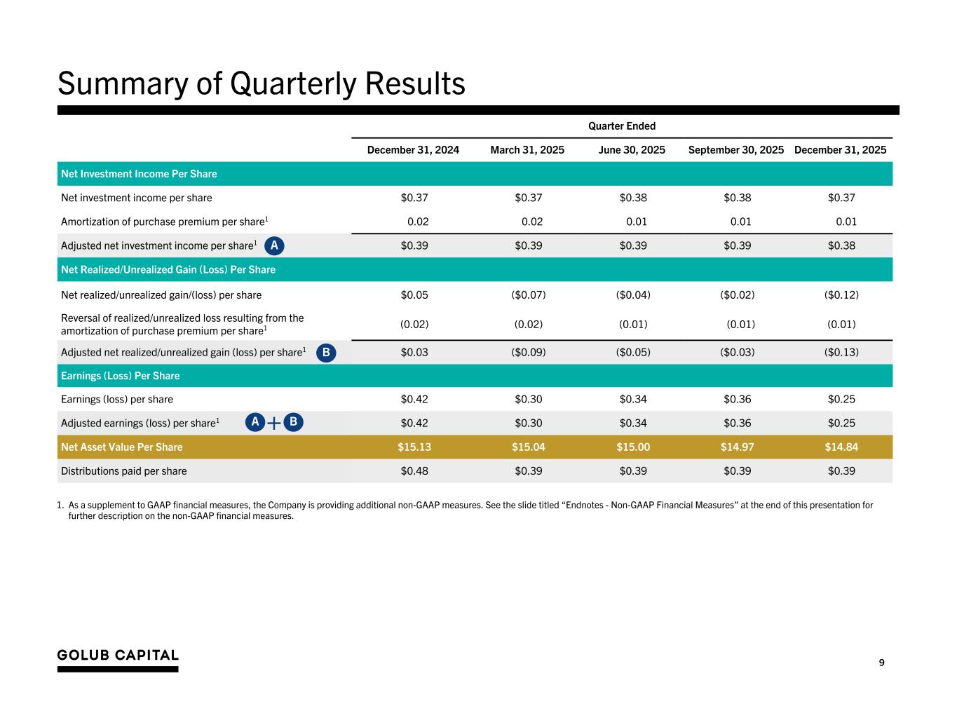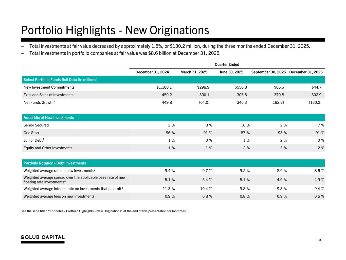 9 Summary of Quarterly Results Quarter Ended December 31, 2024 March 31, 2025 June 30, 2025 September 30, 2025 December 31, 2025 Net Investment Income Per Share Net investment income per share $0.37 $0.37 $0.38 $0.38 $0.37 Amortization of purchase premium per share1 0.02 0.02 0.01 0.01 0.01 Adjusted net investment income per share1 $0.39 $0.39 $0.39 $0.39 $0.38 Net Realized/Unrealized Gain (Loss) Per Share Net realized/unrealized gain/(loss) per share $0.05 ($0.07) ($0.04) ($0.02) ($0.12) Reversal of realized/unrealized loss resulting from the amortization of purchase premium per share1 (0.02) (0.02) (0.01) (0.01) (0.01) Adjusted net realized/unrealized gain (loss) per share1 $0.03 ($0.09) ($0.05) ($0.03) ($0.13) Earnings (Loss) Per Share Earnings (loss) per share $0.42 $0.30 $0.34 $0.36 $0.25 Adjusted earnings (loss) per share1 $0.42 $0.30 $0.34 $0.36 $0.25 Net Asset Value Per Share $15.13 $15.04 $15.00 $14.97 $14.84 Distributions paid per share $0.48 $0.39 $0.39 $0.39 $0.39 A B A B+ 1. As a supplement to GAAP financial measures, the Company is providing additional non-GAAP measures. See the slide titled “Endnotes - Non-GAAP Financial Measures” at the end of this presentation for further description on the non-GAAP financial measures.