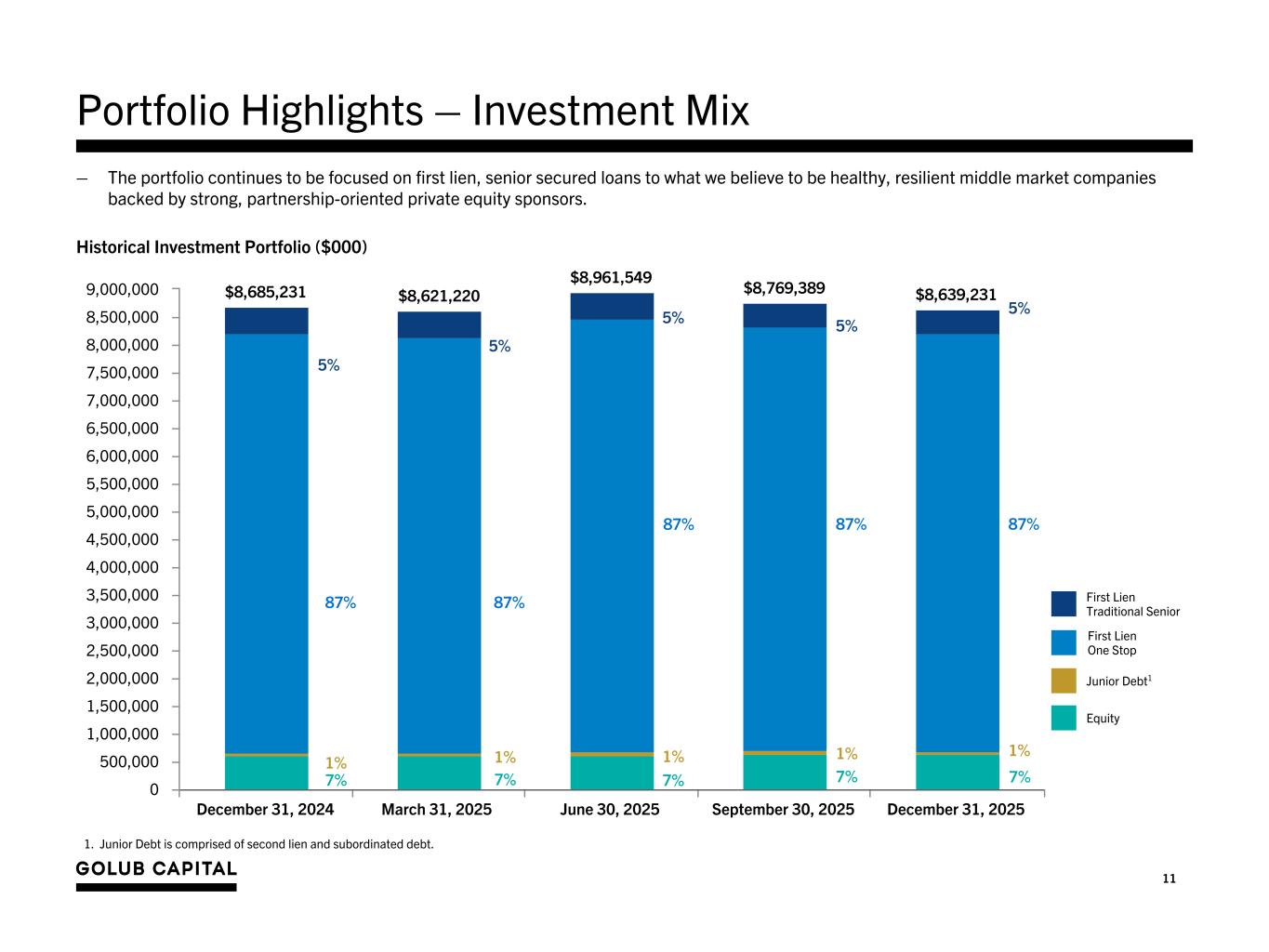 10 Portfolio Highlights - New Originations Quarter Ended December 31, 2024 March 31, 2025 June 30, 2025 September 30, 2025 December 31, 2025 Select Portfolio Funds Roll Data (in millions) New Investment Commitments $1,188.1 $298.9 $556.8 $86.5 $44.7 Exits and Sales of Investments 450.2 390.1 305.8 370.8 302.9 Net Funds Growth1 449.8 (64.0) 340.3 (192.2) (130.2) Asset Mix of New Investments Senior Secured 2 % 8 % 10 % 2 % 7 % One Stop 96 % 91 % 87 % 93 % 91 % Junior Debt2 1 % 0 % 1 % 2 % 0 % Equity and Other Investments 1 % 1 % 2 % 3 % 2 % Portfolio Rotation - Debt Investments Weighted average rate on new investments3 9.4 % 9.7 % 9.2 % 8.9 % 8.6 % Weighted average spread over the applicable base rate of new floating rate investments4 5.1 % 5.4 % 5.1 % 4.9 % 4.9 % Weighted average interest rate on investments that paid-off 5 11.3 % 10.4 % 9.8 % 9.8 % 9.4 % Weighted average fees on new investments 0.9 % 0.8 % 0.8 % 0.9 % 0.6 % See the slide titled “Endnotes - Portfolio Highlights - New Originations” at the end of this presentation for footnotes. – Total investments at fair value decreased by approximately 1.5%, or $130.2 million, during the three months ended December 31, 2025. – Total investments in portfolio companies at fair value was $8.6 billion at December 31, 2025.