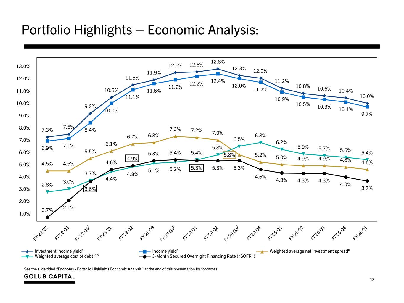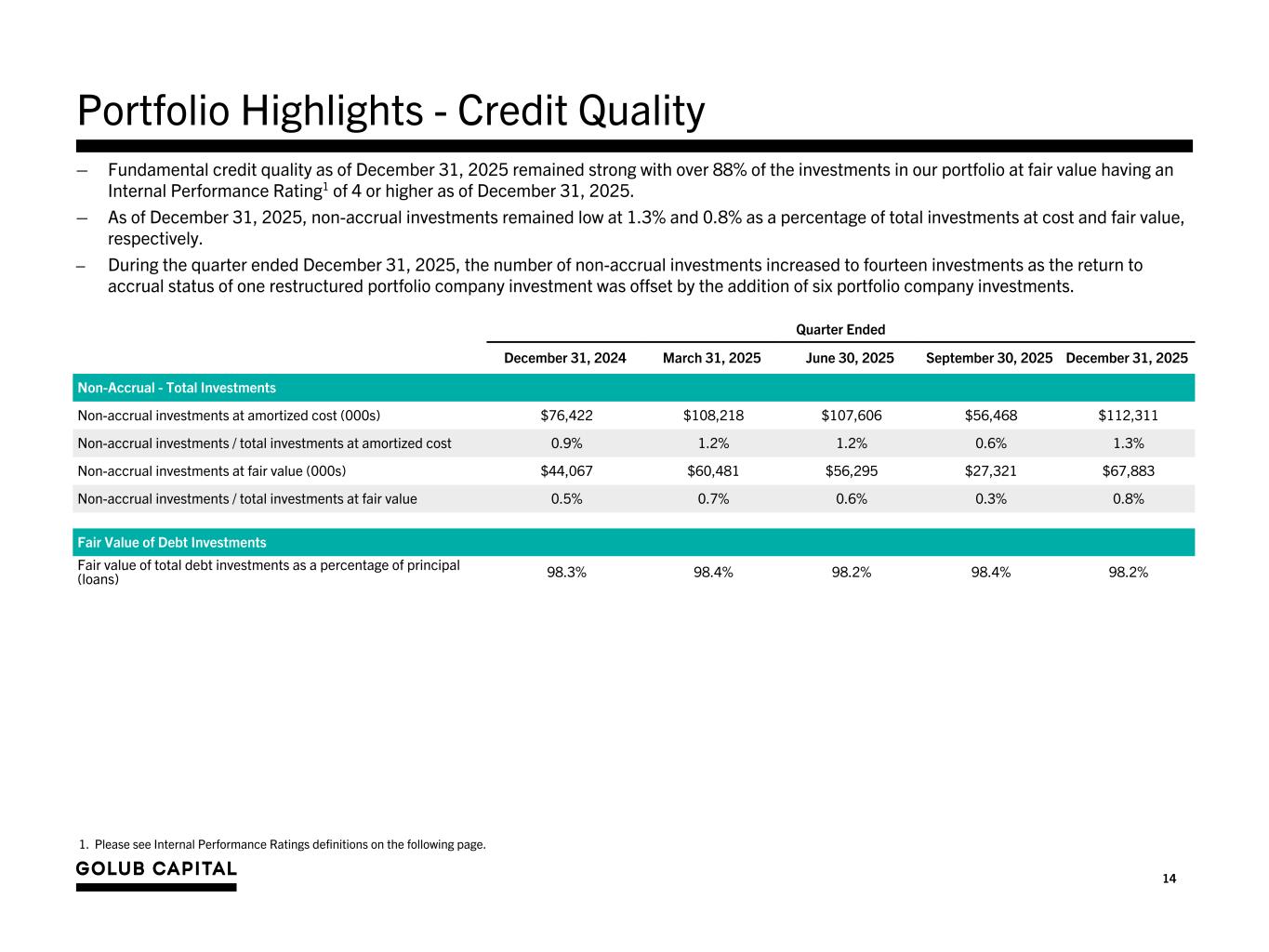 13 See the slide titled “Endnotes - Portfolio Highlights Economic Analysis” at the end of this presentation for footnotes. Portfolio Highlights – Economic Analysis: 7.3% 7.5% 9.2% 10.5% 11.5% 11.9% 12.5% 12.6% 12.8% 12.3% 12.0% 11.2% 10.8% 10.6% 10.4% 10.0% 6.9% 7.1% 8.4% 10.0% 11.1% 11.6% 11.9% 12.2% 12.4% 12.0% 11.7% 10.9% 10.5% 10.3% 10.1% 9.7% 4.5% 4.5% 5.5% 6.1% 6.7% 6.8% 7.3% 7.2% 7.0% 5.8% 5.2% 5.0% 4.9% 4.9% 4.8% 4.6% 2.8% 3.0% 3.7% 4.4% 4.8% 5.1% 5.2% 5.4% 5.8% 6.5% 6.8% 6.2% 5.9% 5.7% 5.6% 5.4% 0.7% 2.1% 3.6% 4.6% 4.9% 5.3% 5.4% 5.3% 5.3% 5.3% 4.6% 4.3% 4.3% 4.3% 4.0% 3.7% Investment income yield⁴ Income yield⁵ Weighted average net investment spread⁶ Weighted average cost of debt ⁷ ⁸ 3-Month Secured Overnight Financing Rate (“SOFR”) FY’22 Q 2 FY’22 Q 3 FY’22 Q 4¹ FY’23 Q 1 FY’23 Q 2 FY’23 Q 3 FY’23 Q 4² FY’24 Q 1 FY’24 Q 2 FY’24 Q 3³ FY’24 Q 4 FY’25 Q 1 FY’25 Q 2 FY’25 Q 3 FY’25 Q 4 FY’26 Q 1 1.0% 2.0% 3.0% 4.0% 5.0% 6.0% 7.0% 8.0% 9.0% 10.0% 11.0% 12.0% 13.0% ,