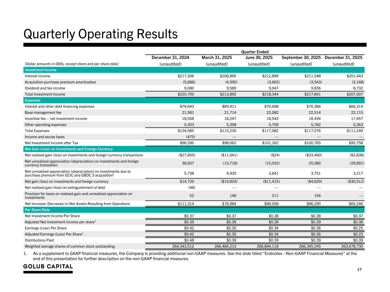 16 Quarterly Statements of Financial Condition As of (Dollar amounts in 000s, except share and per share data) December 31, 2024 March 31, 2025 June 30, 2025 September 30, 2025 December 31, 2025 (unaudited) (unaudited) (unaudited) (audited) (unaudited) Assets Investments, at fair value $8,685,231 $8,621,220 $8,961,549 $8,769,389 $8,639,231 Cash, cash equivalents and foreign currencies 110,277 116,927 99,756 23,616 93,969 Restricted cash, cash equivalents and foreign currencies 110,597 129,457 79,017 88,827 66,573 Other assets 102,681 82,261 96,191 96,467 94,192 Total Assets $9,008,786 $8,949,865 $9,236,513 $8,978,299 $8,893,965 Liabilities Debt $4,919,258 $4,833,150 $5,154,001 $4,926,778 $4,903,076 Unamortized debt issuance costs (28,694) (26,232) (26,853) (26,005) (23,849) Interest payable 51,518 50,473 51,446 38,254 49,092 Management and income incentive fees payable 38,823 40,869 40,613 40,884 39,637 Other liabilities 10,337 8,107 21,977 15,821 16,855 Total Liabilities $4,991,242 $4,906,367 $5,241,184 $4,995,732 $4,984,811 Total Net Assets $4,017,544 $4,043,498 $3,995,329 $3,982,567 $3,909,154 Total Liabilities and Net Assets $9,008,786 $8,949,865 $9,236,513 $8,978,299 $8,893,965 Net Asset Value per Share $15.13 $15.04 $15.00 $14.97 $14.84 GAAP leverage 1.24x 1.21x 1.30x 1.25x 1.27x GAAP debt-to-equity, net1 1.19x 1.16x 1.26x 1.23x 1.23x Asset coverage2 180.8% 182.8% 176.8% 180.2% 178.9% Number of shares of common stock outstanding 265,498,597 268,831,114 266,376,416 266,008,083 263,384,785 1. GAAP debt-to-equity, net is calculated as (a) total debt reduced by (i) cash, (ii) cash equivalents and foreign currencies and (iii) restricted cash held for partial repayment on notes of certain of our securitization vehicles past their reinvestment period term (if any) divided by (b) total net assets. 2. Following stockholder approval of the application of the reduced asset coverage requirements available to business development companies to the Company, the minimum asset coverage ratio applicable to the Company decreased to 150% from 200% effective February 6, 2019.