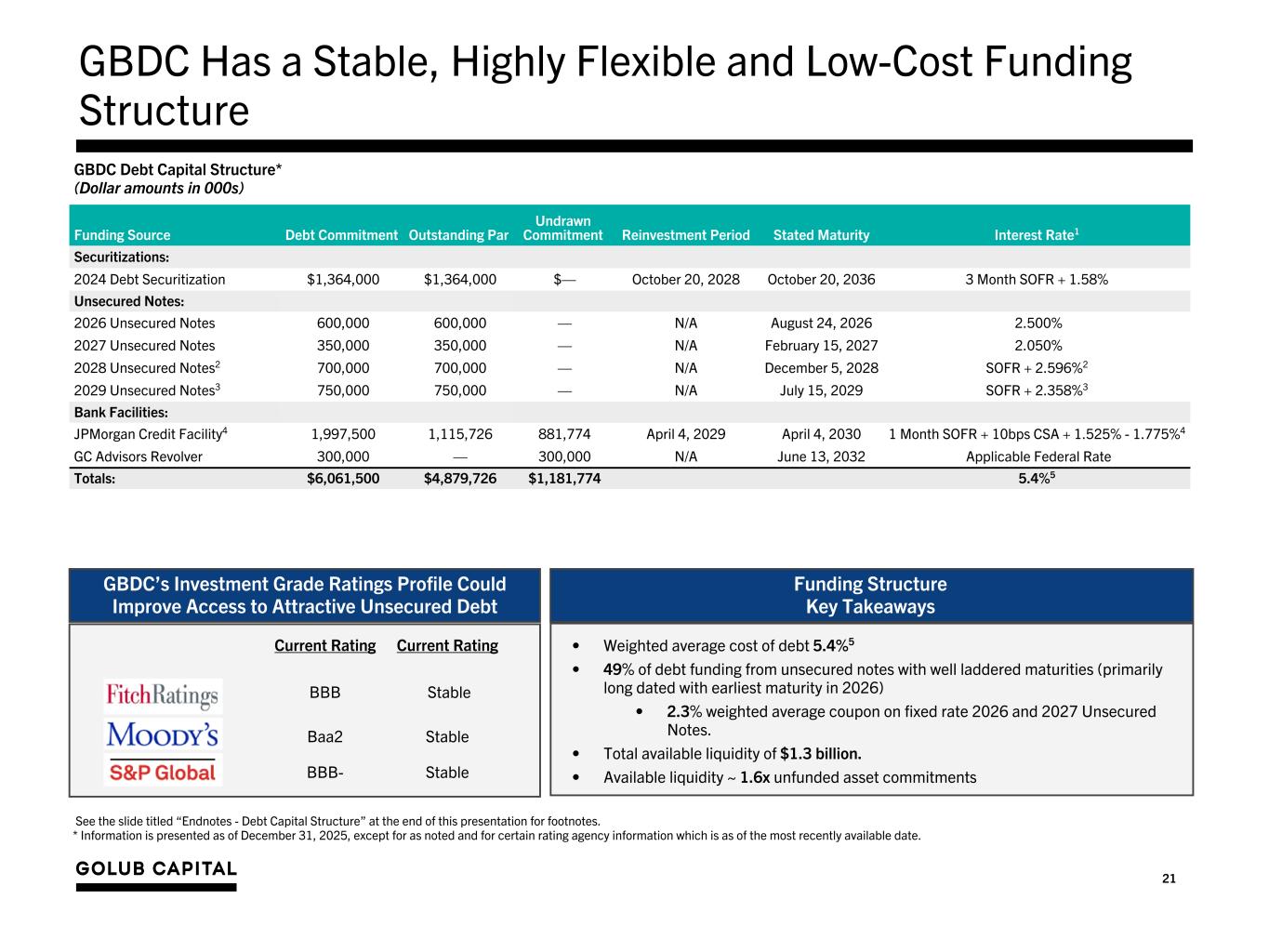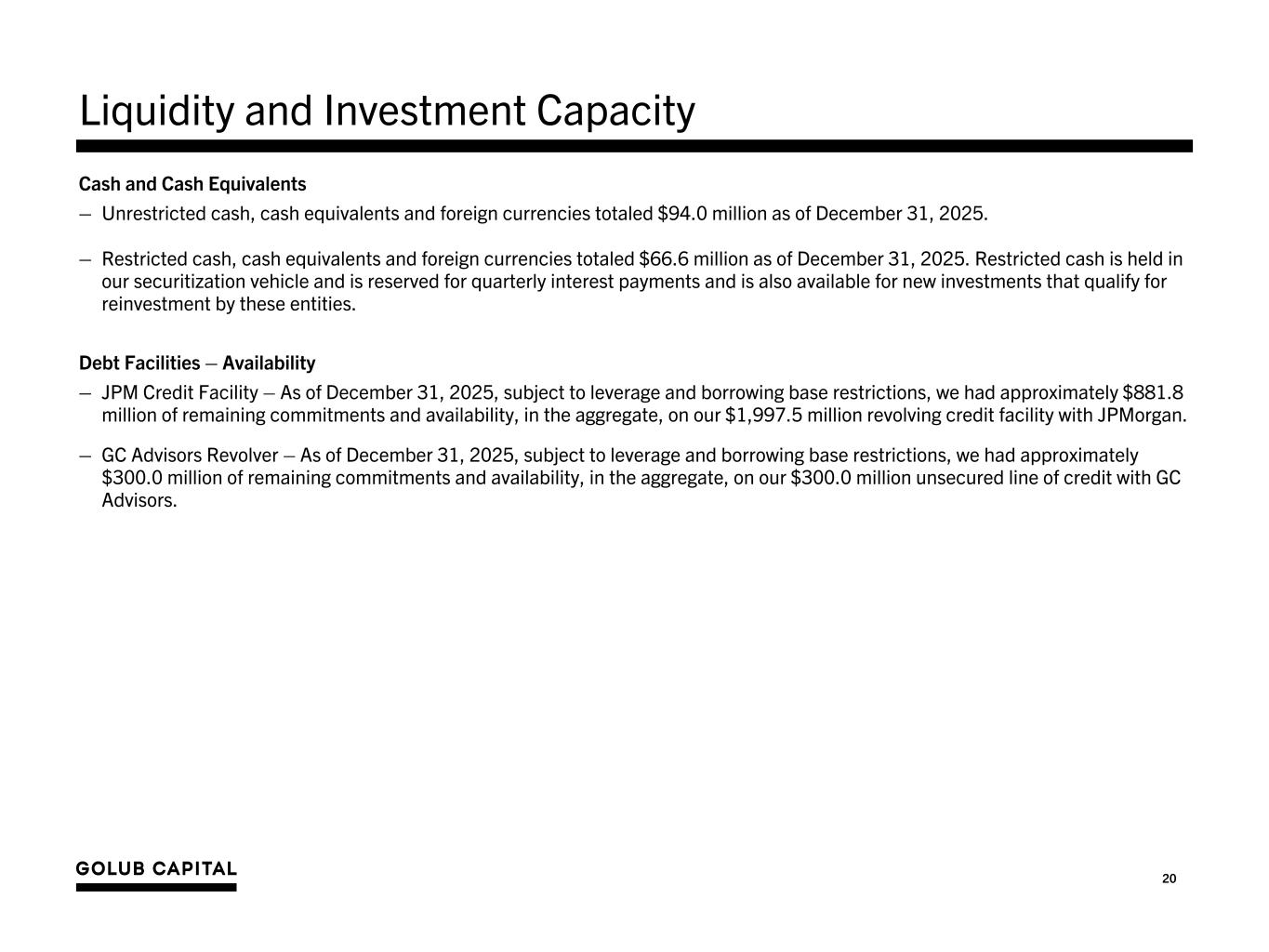 20 Liquidity and Investment Capacity Cash and Cash Equivalents – Unrestricted cash, cash equivalents and foreign currencies totaled $94.0 million as of December 31, 2025. – Restricted cash, cash equivalents and foreign currencies totaled $66.6 million as of December 31, 2025. Restricted cash is held in our securitization vehicle and is reserved for quarterly interest payments and is also available for new investments that qualify for reinvestment by these entities. Debt Facilities – Availability – JPM Credit Facility – As of December 31, 2025, subject to leverage and borrowing base restrictions, we had approximately $881.8 million of remaining commitments and availability, in the aggregate, on our $1,997.5 million revolving credit facility with JPMorgan. – GC Advisors Revolver – As of December 31, 2025, subject to leverage and borrowing base restrictions, we had approximately $300.0 million of remaining commitments and availability, in the aggregate, on our $300.0 million unsecured line of credit with GC Advisors.