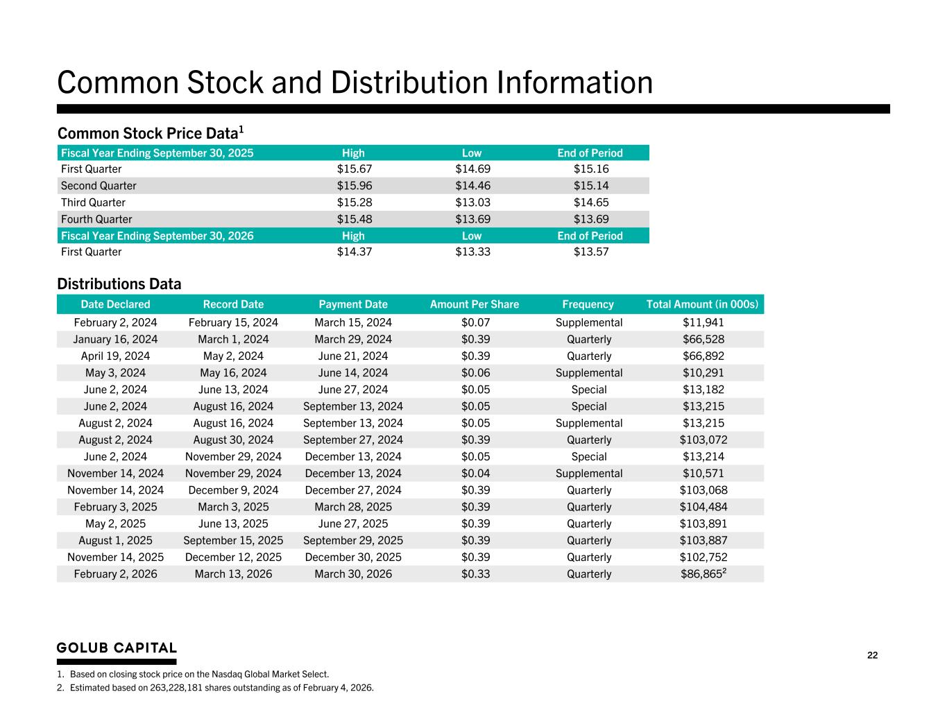 22 Common Stock and Distribution Information Date Declared Record Date Payment Date Amount Per Share Frequency Total Amount (in 000s) February 2, 2024 February 15, 2024 March 15, 2024 $0.07 Supplemental $11,941 January 16, 2024 March 1, 2024 March 29, 2024 $0.39 Quarterly $66,528 April 19, 2024 May 2, 2024 June 21, 2024 $0.39 Quarterly $66,892 May 3, 2024 May 16, 2024 June 14, 2024 $0.06 Supplemental $10,291 June 2, 2024 June 13, 2024 June 27, 2024 $0.05 Special $13,182 June 2, 2024 August 16, 2024 September 13, 2024 $0.05 Special $13,215 August 2, 2024 August 16, 2024 September 13, 2024 $0.05 Supplemental $13,215 August 2, 2024 August 30, 2024 September 27, 2024 $0.39 Quarterly $103,072 June 2, 2024 November 29, 2024 December 13, 2024 $0.05 Special $13,214 November 14, 2024 November 29, 2024 December 13, 2024 $0.04 Supplemental $10,571 November 14, 2024 December 9, 2024 December 27, 2024 $0.39 Quarterly $103,068 February 3, 2025 March 3, 2025 March 28, 2025 $0.39 Quarterly $104,484 May 2, 2025 June 13, 2025 June 27, 2025 $0.39 Quarterly $103,891 August 1, 2025 September 15, 2025 September 29, 2025 $0.39 Quarterly $103,887 November 14, 2025 December 12, 2025 December 30, 2025 $0.39 Quarterly $102,752 February 2, 2026 March 13, 2026 March 30, 2026 $0.33 Quarterly $86,865² Distributions Data Fiscal Year Ending September 30, 2025 High Low End of Period First Quarter $15.67 $14.69 $15.16 Second Quarter $15.96 $14.46 $15.14 Third Quarter $15.28 $13.03 $14.65 Fourth Quarter $15.48 $13.69 $13.69 Fiscal Year Ending September 30, 2026 High Low End of Period First Quarter $14.37 $13.33 $13.57 Common Stock Price Data1 1. Based on closing stock price on the Nasdaq Global Market Select. 2. Estimated based on 263,228,181 shares outstanding as of February 4, 2026.