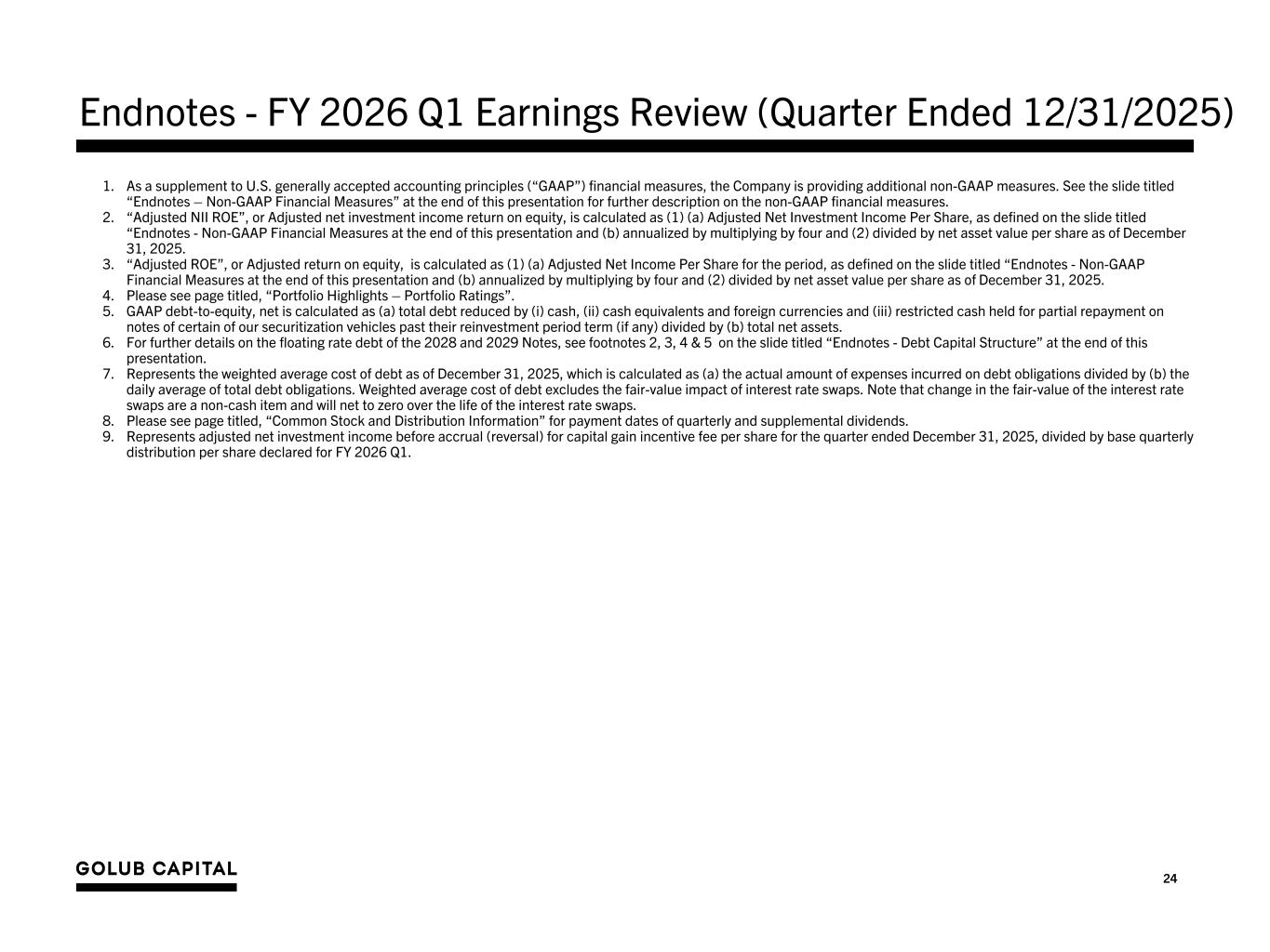 24 Endnotes - FY 2026 Q1 Earnings Review (Quarter Ended 12/31/2025) 1. As a supplement to U.S. generally accepted accounting principles (“GAAP”) financial measures, the Company is providing additional non-GAAP measures. See the slide titled “Endnotes – Non-GAAP Financial Measures” at the end of this presentation for further description on the non-GAAP financial measures. 2. “Adjusted NII ROE”, or Adjusted net investment income return on equity, is calculated as (1) (a) Adjusted Net Investment Income Per Share, as defined on the slide titled “Endnotes - Non-GAAP Financial Measures at the end of this presentation and (b) annualized by multiplying by four and (2) divided by net asset value per share as of December 31, 2025. 3. “Adjusted ROE”, or Adjusted return on equity, is calculated as (1) (a) Adjusted Net Income Per Share for the period, as defined on the slide titled “Endnotes - Non-GAAP Financial Measures at the end of this presentation and (b) annualized by multiplying by four and (2) divided by net asset value per share as of December 31, 2025. 4. Please see page titled, “Portfolio Highlights – Portfolio Ratings”. 5. GAAP debt-to-equity, net is calculated as (a) total debt reduced by (i) cash, (ii) cash equivalents and foreign currencies and (iii) restricted cash held for partial repayment on notes of certain of our securitization vehicles past their reinvestment period term (if any) divided by (b) total net assets. 6. For further details on the floating rate debt of the 2028 and 2029 Notes, see footnotes 2, 3, 4 & 5 on the slide titled “Endnotes - Debt Capital Structure” at the end of this presentation. 7. Represents the weighted average cost of debt as of December 31, 2025, which is calculated as (a) the actual amount of expenses incurred on debt obligations divided by (b) the daily average of total debt obligations. Weighted average cost of debt excludes the fair-value impact of interest rate swaps. Note that change in the fair-value of the interest rate swaps are a non-cash item and will net to zero over the life of the interest rate swaps. 8. Please see page titled, “Common Stock and Distribution Information” for payment dates of quarterly and supplemental dividends. 9. Represents adjusted net investment income before accrual (reversal) for capital gain incentive fee per share for the quarter ended December 31, 2025, divided by base quarterly distribution per share declared for FY 2026 Q1.