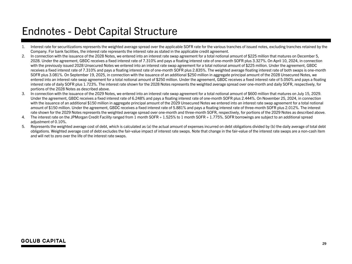 29 1. Interest rate for securitizations represents the weighted average spread over the applicable SOFR rate for the various tranches of issued notes, excluding tranches retained by the Company. For bank facilities, the interest rate represents the interest rate as stated in the applicable credit agreement. 2. In connection with the issuance of the 2028 Notes, we entered into an interest rate swap agreement for a total notional amount of $225 million that matures on December 5, 2028. Under the agreement, GBDC receives a fixed interest rate of 7.310% and pays a floating interest rate of one-month SOFR plus 3.327%. On April 10, 2024, in connection with the previously issued 2028 Unsecured Notes we entered into an interest rate swap agreement for a total notional amount of $225 million. Under the agreement, GBDC receives a fixed interest rate of 7.310% and pays a floating interest rate of one-month SOFR plus 2.835%. The weighted average floating interest rate of both swaps is one-month SOFR plus 3.081%. On September 19, 2025, in connection with the issuance of an additional $250 million in aggregate principal amount of the 2028 Unsecured Notes, we entered into an interest rate swap agreement for a total notional amount of $250 million. Under the agreement, GBDC receives a fixed interest rate of 5.050% and pays a floating interest rate of daily SOFR plus 1.723%. The interest rate shown for the 2028 Notes represents the weighted average spread over one-month and daily SOFR, respectively, for portions of the 2028 Notes as described above. 3. In connection with the issuance of the 2029 Notes, we entered into an interest rate swap agreement for a total notional amount of $600 million that matures on July 15, 2029. Under the agreement, GBDC receives a fixed interest rate of 6.248% and pays a floating interest rate of one-month SOFR plus 2.444%. On November 25, 2024, in connection with the issuance of an additional $150 million in aggregate principal amount of the 2029 Unsecured Notes we entered into an interest rate swap agreement for a total notional amount of $150 million. Under the agreement, GBDC receives a fixed interest rate of 5.881% and pays a floating interest rate of three-month SOFR plus 2.012%. The interest rate shown for the 2029 Notes represents the weighted average spread over one-month and three-month SOFR, respectively, for portions of the 2029 Notes as described above. 4. The interest rate on the JPMorgan Credit Facility ranged from 1 month SOFR + 1.525% to 1 month SOFR + 1.775%. SOFR borrowings are subject to an additional spread adjustment of 0.10%. 5. Represents the weighted average cost of debt, which is calculated as (a) the actual amount of expenses incurred on debt obligations divided by (b) the daily average of total debt obligations. Weighted average cost of debt excludes the fair-value impact of interest rate swaps. Note that change in the fair-value of the interest rate swaps are a non-cash item and will net to zero over the life of the interest rate swaps. Endnotes - Debt Capital Structure