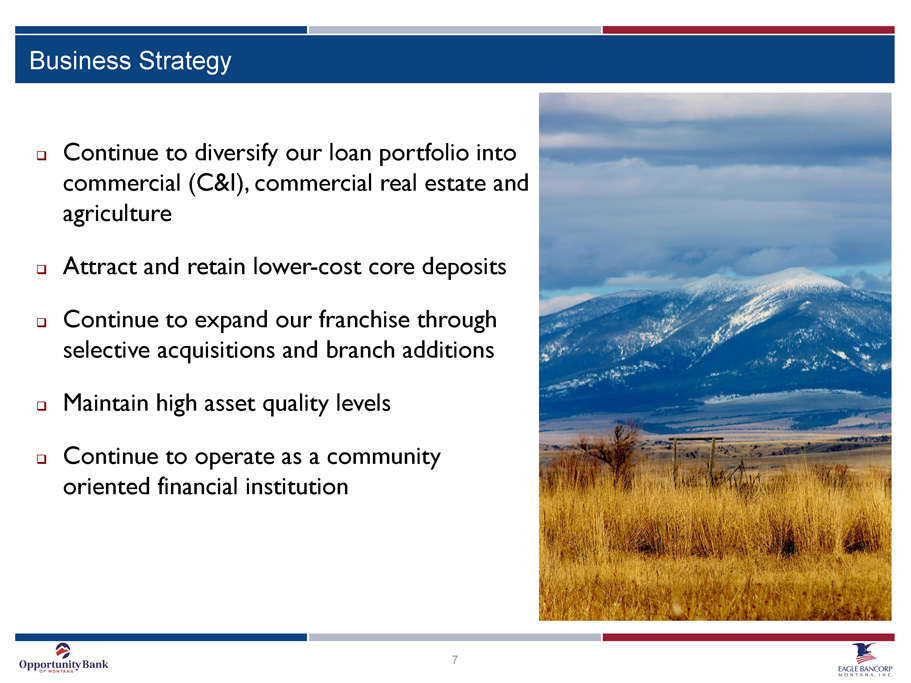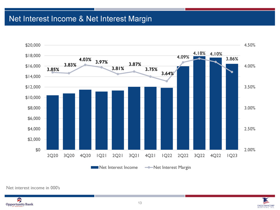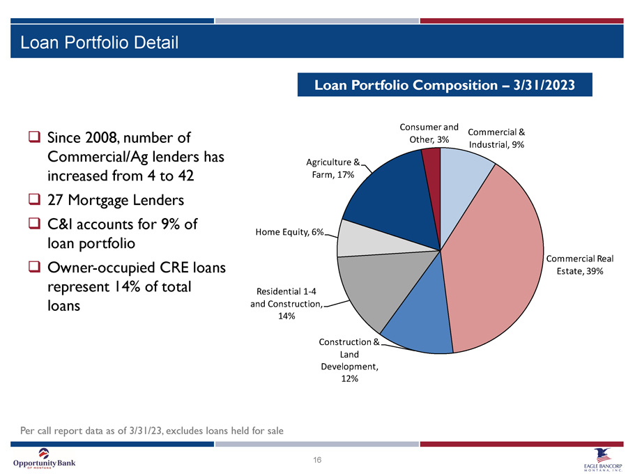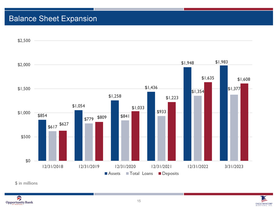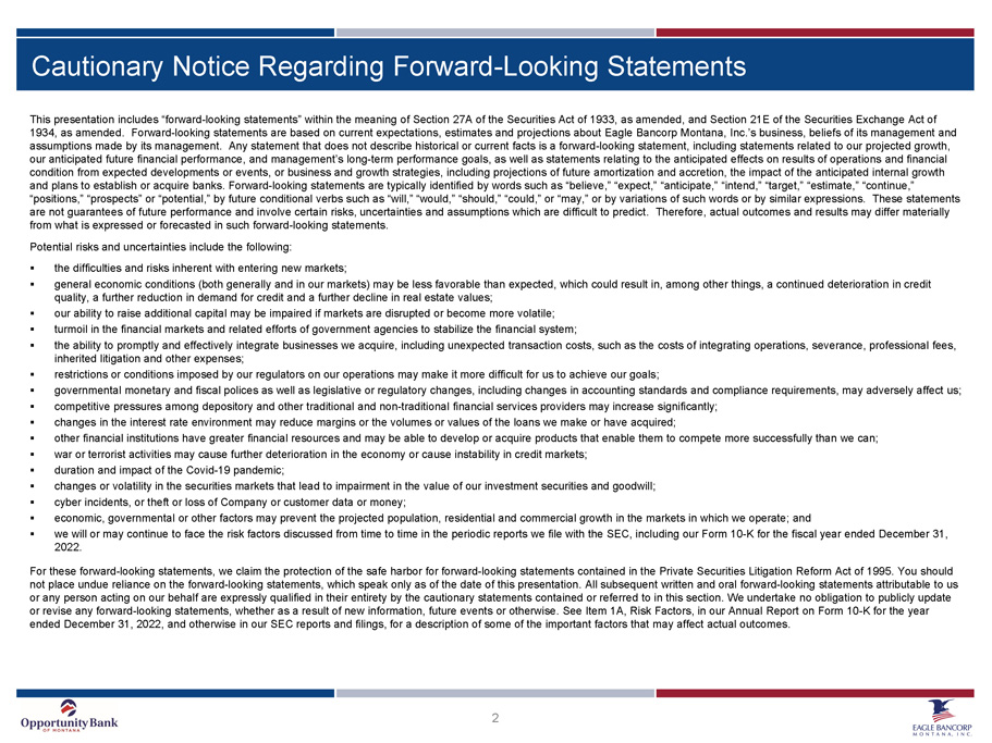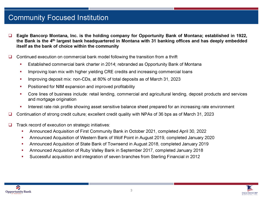 2 Cautionary Notice Regarding Forward - Looking Statements This presentation includes “forward - looking statements” within the meaning of Section 27A of the Securities Act of 1933, as amen ded, and Section 21E of the Securities Exchange Act of 1934, as amended. Forward - looking statements are based on current expectations, estimates and projections about Eagle Bancorp M ontana, Inc.’s business, beliefs of its management and assumptions made by its management. Any statement that does not describe historical or current facts is a forward - looking state ment, including statements related to our projected growth, our anticipated future financial performance, and management’s long - term performance goals, as well as statements relating to th e anticipated effects on results of operations and financial condition from expected developments or events, or business and growth strategies, including projections of future amortizati on and accretion, the impact of the anticipated internal growth and plans to establish or acquire banks. Forward - looking statements are typically identified by words such as “believe,” “expect ,” “anticipate,” “intend,” “target,” “estimate,” “continue,” “positions,” “prospects” or “potential,” by future conditional verbs such as “will,” “would,” “should,” “could,” or “may,” or by variations of such words or by similar expressions. These statements are not guarantees of future performance and involve certain risks, uncertainties and assumptions which are difficult to pred ict . Therefore, actual outcomes and results may differ materially from what is expressed or forecasted in such forward - looking statements. Potential risks and uncertainties include the following: ▪ the difficulties and risks inherent with entering new markets; ▪ general economic conditions (both generally and in our markets) may be less favorable than expected, which could result in, a mon g other things, a continued deterioration in credit quality, a further reduction in demand for credit and a further decline in real estate values; ▪ our ability to raise additional capital may be impaired if markets are disrupted or become more volatile; ▪ turmoil in the financial markets and related efforts of government agencies to stabilize the financial system; ▪ the ability to promptly and effectively integrate businesses we acquire, including unexpected transaction costs, such as the cos ts of integrating operations, severance, professional fees, inherited litigation and other expenses; ▪ restrictions or conditions imposed by our regulators on our operations may make it more difficult for us to achieve our goals ; ▪ governmental monetary and fiscal polices as well as legislative or regulatory changes, including changes in accounting standa rds and compliance requirements, may adversely affect us; ▪ competitive pressures among depository and other traditional and non - traditional financial services providers may increase signi ficantly; ▪ changes in the interest rate environment may reduce margins or the volumes or values of the loans we make or have acquired; ▪ other financial institutions have greater financial resources and may be able to develop or acquire products that enable them to compete more successfully than we can; ▪ war or terrorist activities may cause further deterioration in the economy or cause instability in credit markets; ▪ duration and impact of the Covid - 19 pandemic; ▪ changes or volatility in the securities markets that lead to impairment in the value of our investment securities and goodwil l; ▪ cyber incidents, or theft or loss of Company or customer data or money; ▪ economic, governmental or other factors may prevent the projected population, residential and commercial growth in the market s i n which we operate; and ▪ we will or may continue to face the risk factors discussed from time to time in the periodic reports we file with the SEC, in clu ding our Form 10 - K for the fiscal year ended December 31, 2022. For these forward - looking statements, we claim the protection of the safe harbor for forward - looking statements contained in the Private Securities Litigation Reform Act of 1995. You should not place undue reliance on the forward - looking statements, which speak only as of the date of this presentation. All subsequent written and oral forward - looking statements attributable to us or any person acting on our behalf are expressly qualified in their entirety by the cautionary statements contained or referr ed to in this section. We undertake no obligation to publicly update or revise any forward - looking statements, whether as a result of new information, future events or otherwise. See Item 1A, Risk Factors, in our Annual Report on Form 10 - K for the year ended December 31, 2022, and otherwise in our SEC reports and filings, for a description of some of the important factors tha t m ay affect actual outcomes.