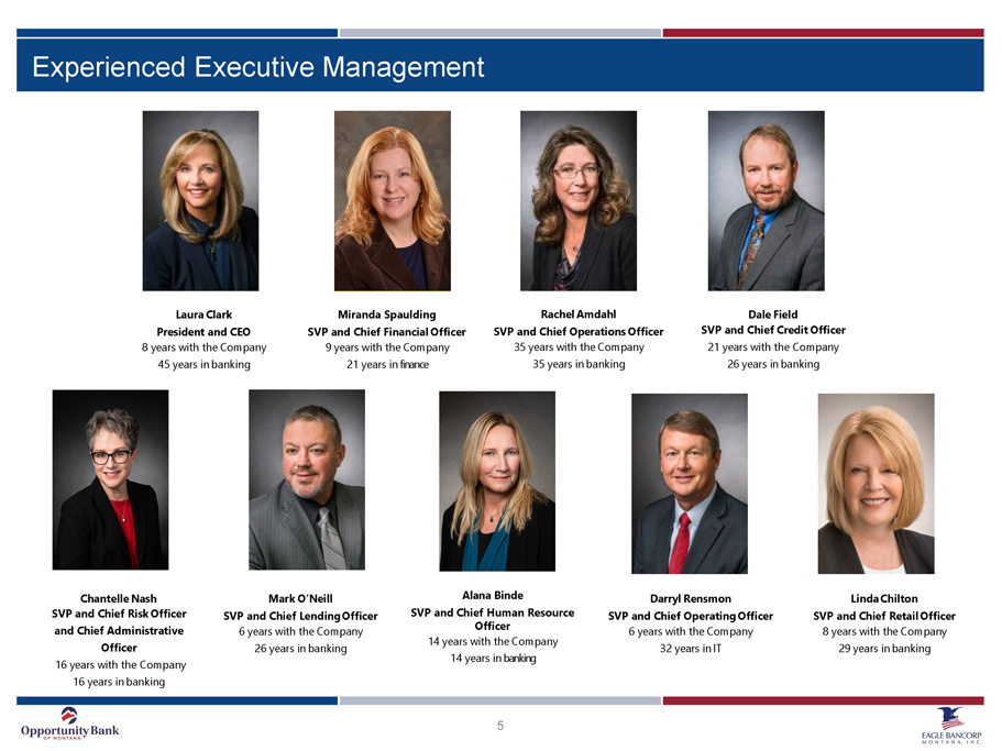 4 Company Overview □ 31 branches in Montana operating under the Company’s banking subsidiary – Opportunity Bank of Montana □ Balance Sheet (3/31/23): ▪ Assets $1.983 billion ▪ Gross Loans $1.377 billion ▪ Deposits $1.608 billion ▪ Total equity $163.0 million □ Asset Quality (3/31/23): ▪ NPAs/assets – 0.36% □ Profitability for 1Q23: ▪ Net income of $3.2 million ▪ NIM – 3.86% ▪ ROAA – 0.67% ▪ ROAE – 7.99% EBMT Branches
