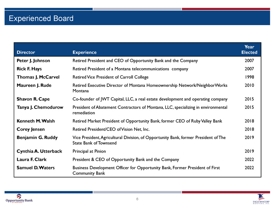 6 Experienced Board Year Elected Experience Director 2007 Retired President and CEO of Opportunity Bank and the Company Peter J. Johnson 2007 Retired President of a Montana telecommunications company Rick F. Hays 1998 Retired Vice President of Carroll College Thomas J. McCarvel 2010 Retired Executive Director of Montana Homeownership Network/NeighborWorks Montana Maureen J. Rude 2015 Co - founder of JWT Capital, LLC, a real estate development and operating company Shavon R. Cape 2015 President of Abatement Contractors of Montana, LLC, specializing in environmental remediation Tanya J. Chemodurow 2018 Retired Market President of Opportunity Bank, former CEO of Ruby Valley Bank Kenneth M. Walsh 2018 Retired President/CEO of Vision Net, Inc. Corey Jensen 2019 Vice President, Agricultural Division, of Opportunity Bank, former President of The State Bank of Townsend Benjamin G. Ruddy 2019 Principal at Pinion Cynthia A. Utterback 2022 President & CEO of Opportunity Bank and the Company Laura F. Clark 2022 Business Development Officer for Opportunity Bank, Former President of First Community Bank Samuel D. Waters
