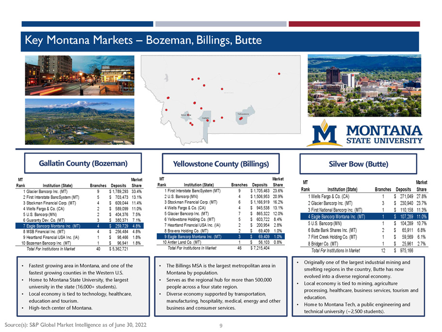 Key Montana Markets – Helena, Missoula, Great Falls Lewis and Clark County (Helena) Cascade County (Great Falls) Missoula County (Missoula) • Helena is the state capital of Montana. • Stable economy supported by state government, healthcare, education, and small business. • Government positions account for 70% of Helena's workforce. • Home to Carroll College, a top - ranked private liberal arts college. • Great Falls MSA is the 3rd largest metropolitan area in Montana by population. • Relatively new market for EBMT - Bank formally entered the Great Falls market in 2017. • Diverse regional economy is anchored by agriculture, military, manufacturing and tourism. • Trade hub for the Golden Triangle region, an area known for high quality agriculture production. • Missoula MSA is the 2nd largest metropolitan area in Montana by population. • Home to the University of Montana (Approximately 11,000 students). • Regional hub for a wide range of retail, professional and service activities. Source(s): S&P Global Market Intelligence as of June 30, 2022 8 MT Rank Institution (State) Branches Deposits Market Share 1Glacier Bancorp Inc. (MT) 6 612,500$ 27.3% 2First Interstate BancSystem (MT) 4 446,165$ 19.9% 3Wells Fargo & Co. (CA) 3 326,349$ 14.6% 4Eagle Bancorp Montana Inc. (MT) 4 299,036$ 13.3% 5Stockman Financial Corp. (MT) 2 212,852$ 9.5% 6U.S. Bancorp (MN) 1 188,959$ 8.4% 7Ascent Bancorp (MT) 2 68,685$ 3.1% 8Countricorp (MT) 1 26,136$ 1.2% 9Forstrom Bancorp. Inc. (MN) 1 24,573$ 1.1% 10Farmers State Financial Corp. (MT) 1 20,494$ 9.1% Total For Institutions In Market 27 2,242,143$ MT Rank Institution (State) Branches Deposits Market Share 1First Interstate BancSystem (MT) 3 983,746$ 25.7% 2Glacier Bancorp Inc. (MT) 8 980,808$ 25.6% 3Wells Fargo & Co. (CA) 3 386,002$ 10.1% 4Stockman Financial Corp. (MT) 3 357,731$ 9.3% 5U.S. Bancorp (MN) 2 350,778$ 9.2% 6Bitterroot Holding Co. (MT) 7 307,936$ 8.0% 7Bancorp of Montana Holding Co. (MT) 1 206,821$ 5.3% 8Farmers State Financial Corp. (MT) 2 74,003$ 1.9% 9Eagle Bancorp Montana Inc. (MT) 2 69,401$ 1.8% 10First National Bancorp Inc. (MT) 2 59,841$ 1.6% Total For Institutions In Market 35 3,830,631$ MT Rank Institution (State) Branches Deposits Market Share 1First Interstate BancSystem (MT) 3 567,957$ 26.1% 2Stockman Financial Corp. (MT) 3 512,584$ 23.6% 3U.S. Bancorp (MN) 3 441,080$ 20.3% 4Wells Fargo & Co. (CA) 2 360,436$ 16.6% 5Bravera Holding Corp. (ND) 2 112,570$ 5.2% 6Belt Valley Bank (MT) 1 68,695$ 3.2% 7Stockmens Bank (MT) 1 42,083$ 1.9% 8Forstrom Bancorp. Inc. (MN) 1 41,037$ 0.9% 9Eagle Bancorp Montana Inc. (MT) 1 14,907$ 0.7% 10Glacier Bancorp Inc. (MT) 1 8,832$ 0.4% Total For Institutions In Market 21 2,175,542$