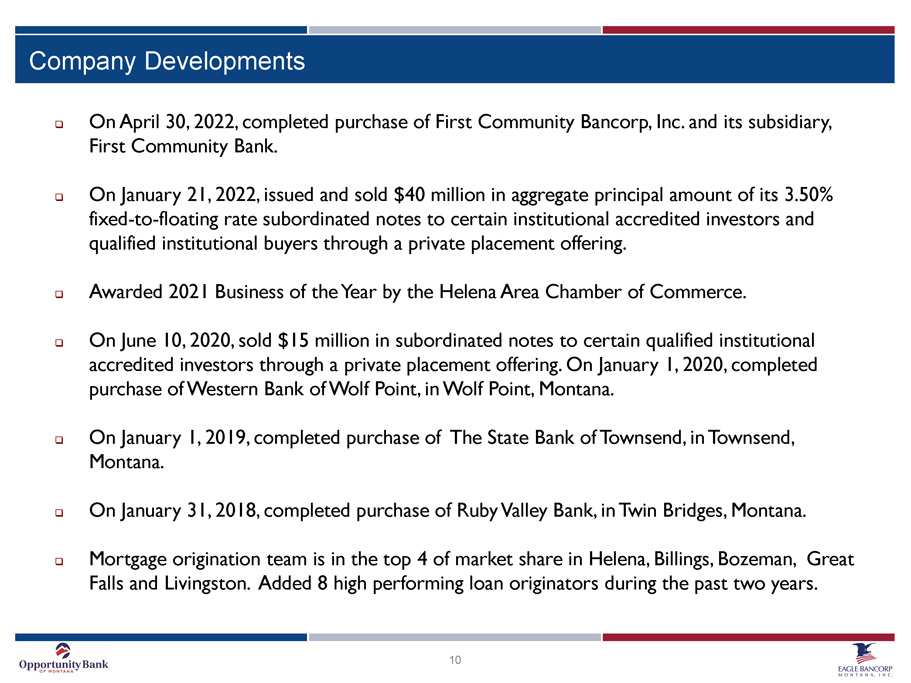 Key Montana Markets – Bozeman, Billings, Butte Gallatin County (Bozeman) Silver Bow (Butte) Yellowstone County (Billings) • Fastest growing area in Montana, and one of the fastest growing counties in the Western U.S. • Home to Montana State University, the largest university in the state (16,000+ students). • Local economy is tied to technology, healthcare, education and tourism. • High - tech center of Montana. • Originally one of the largest industrial mining and smelting regions in the country, Butte has now evolved into a diverse regional economy. • Local economy is tied to mining, agriculture processing, healthcare, business services, tourism and education. • Home to Montana Tech, a public engineering and technical university (~2,500 students). • The Billings MSA is the largest metropolitan area in Montana by population. • Serves as the regional hub for more than 500,000 people across a four state region. • Diverse economy supported by transportation, manufacturing, hospitality, medical, energy and other business and consumer services. Source(s): S&P Global Market Intelligence as of June 30, 2022 9 MT Rank Institution (State) Branches Deposits Market Share 1Glacier Bancorp Inc. (MT) 9 1,789,293$ 33.4% 2First Interstate BancSystem (MT) 5 703,473$ 13.1% 3Stockman Financial Corp. (MT) 4 609,044$ 11.4% 4Wells Fargo & Co. (CA) 2 589,099$ 11.0% 5U.S. Bancorp (MN) 2 404,376$ 7.5% 6Guaranty Dev. Co. (MT) 3 380,371$ 7.1% 7Eagle Bancorp Montana Inc. (MT) 4 259,729$ 4.8% 8MSB Financial Inc. (MT) 4 256,484$ 4.8% 9Heartland Financial USA Inc. (IA) 1 98,466$ 1.8% 10Bozeman Bancorp Inc. (MT) 1 96,941$ 1.8% Total For Institutions In Market 40 5,362,721$ MT Rank Institution (State) Branches Deposits Market Share 1First Interstate BancSystem (MT) 9 1,705,463$ 23.6% 2U.S. Bancorp (MN) 4 1,506,953$ 20.9% 3Stockman Financial Corp. (MT) 6 1,166,919$ 16.2% 4Wells Fargo & Co. (CA) 4 945,538$ 13.1% 5Glacier Bancorp Inc. (MT) 7 865,322$ 12.0% 6Yellowstone Holding Co. (MT) 5 603,722$ 8.4% 7Heartland Financial USA Inc. (IA) 2 200,954$ 2.8% 8Bravera Holding Co. (MT) 2 69,409$ 1.0% 9Eagle Bancorp Montana Inc. (MT) 3 69,409$ 1.0% 10Antler Land Co. (MT) 1 56,103$ 0.8% Total For Institutions In Market 46 7,215,404$ MT Rank Institution (State) Branches Deposits Market Share 1Wells Fargo & Co. (CA) 1 271,049$ 27.8% 2Glacier Bancorp Inc. (MT) 3 230,940$ 23.7% 3First National Bancorp Inc. (MT) 1 110,158$ 11.3% 4Eagle Bancorp Montana Inc. (MT) 1 107,289$ 11.0% 5U.S. Bancorp (MN) 1 104,289$ 10.7% 6Butte Bank Shares Inc. (MT) 2 65,911$ 6.8% 7Flint Creek Holding Co. (MT) 1 59,569$ 6.1% 8Bridger Co. (MT) 1 25,961$ 2.7% Total For Institutions In Market 12 975,166$
