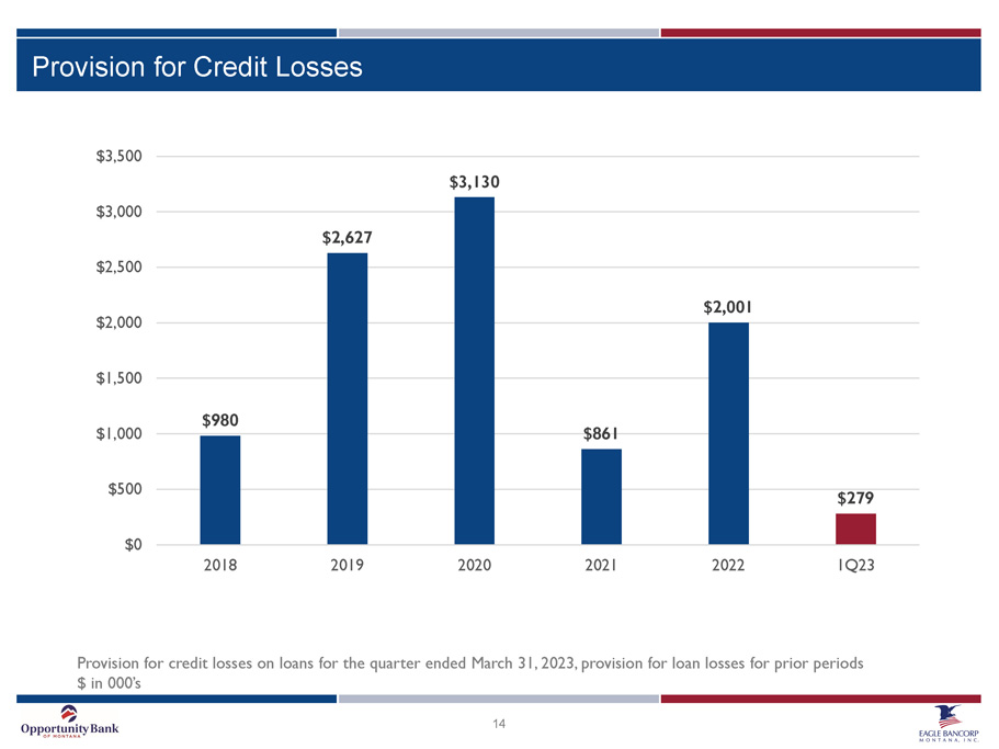 13 Net Interest Income & Net Interest Margin $ 2 , 0 $ 3 , 0 $ 4 , 0 $ 5 , 0 $ 6 , 0 $ 7 , 0 $ 8 , 0 $ 9 , 0 $ 1 0 , 2 . 8 0 3 . 0 0 3 . 2 0 3 . 4 0 3 . 6 0 3 . 8 0 4 . 0 0 4 . 2 0 4 . 4 0 4 . 6 0 Net Interest Income Net Interest Margin 3.85% 3.83% 4.03% 3.97% 3.81% 3.87% 3.75% 3.64% 4.09% 4.18% 4.10% 3.86% 2.00% 2.50% 3.00% 3.50% 4.00% 4.50% $0 $2,000 $4,000 $6,000 $8,000 $10,000 $12,000 $14,000 $16,000 $18,000 $20,000 2Q20 3Q20 4Q20 1Q21 2Q21 3Q21 4Q21 1Q22 2Q22 3Q22 4Q22 1Q23 Net Interest Income Net Interest Margin Net interest income in 000’s