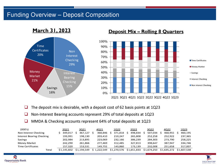 16 Loan Portfolio Composition – 3/31/2023 □ Since 2008, number of Commercial/Ag lenders has increased from 4 to 42 □ 27 Mortgage Lenders □ C&I accounts for 9% of loan portfolio □ Owner - occupied CRE loans represent 14% of total loans Per call report data as of 3/31/23, excludes loans held for sale Commercial & Industrial , 9% Commercial Real Estate , 39% Construction & Land Development , 12% Residential 1 - 4 and Construction , 14% Home Equity , 6% Agriculture & Farm , 17% Consumer and Other , 3% Loan Portfolio Detail